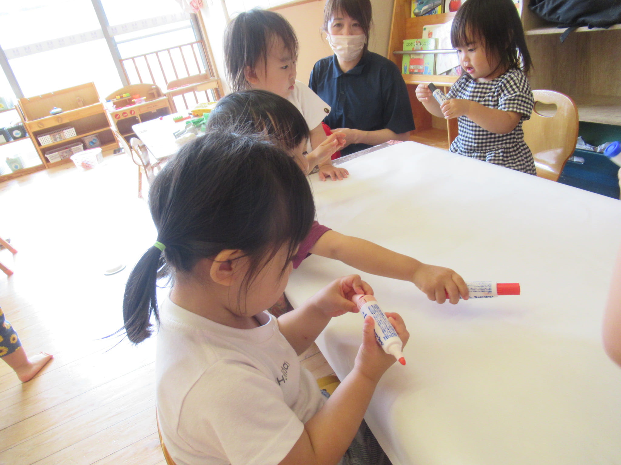 うさぎ組が水性ペンを使ってグループ単位で大きな紙に