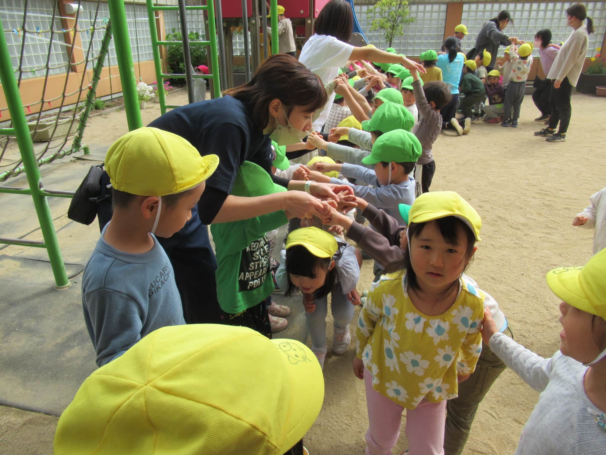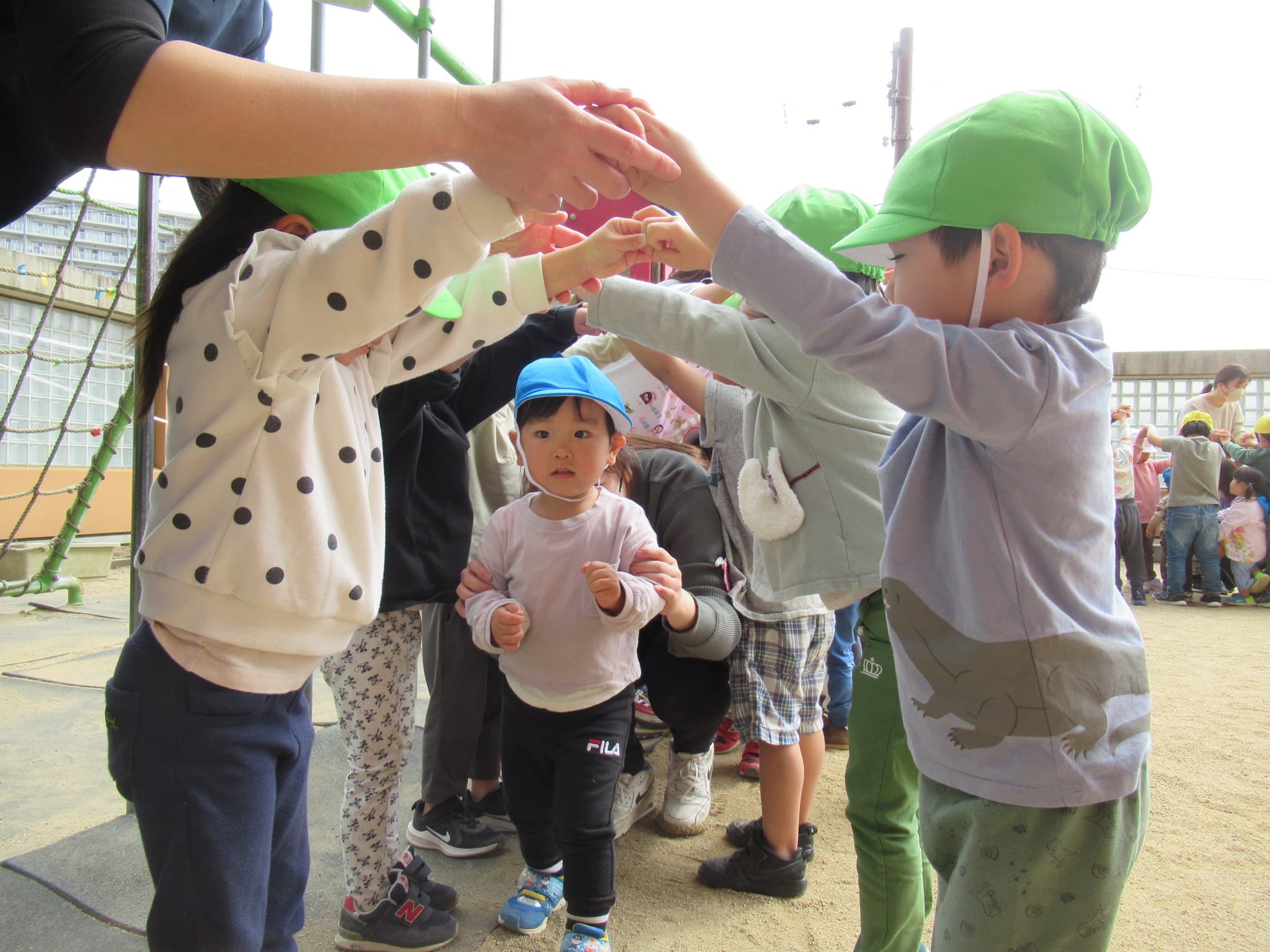 まず、今日は園庭で『みんながひとつ大きくなったお祝い』