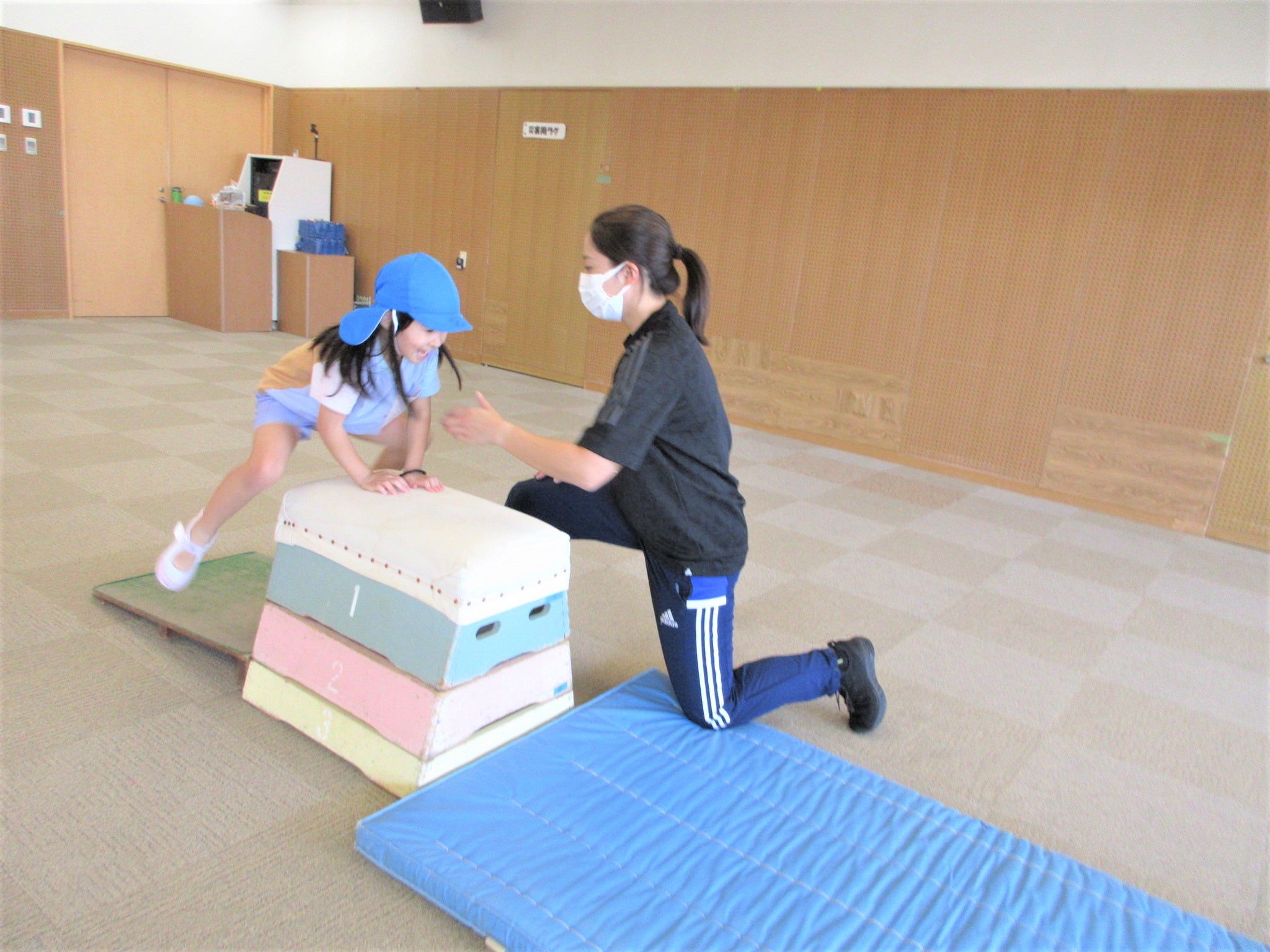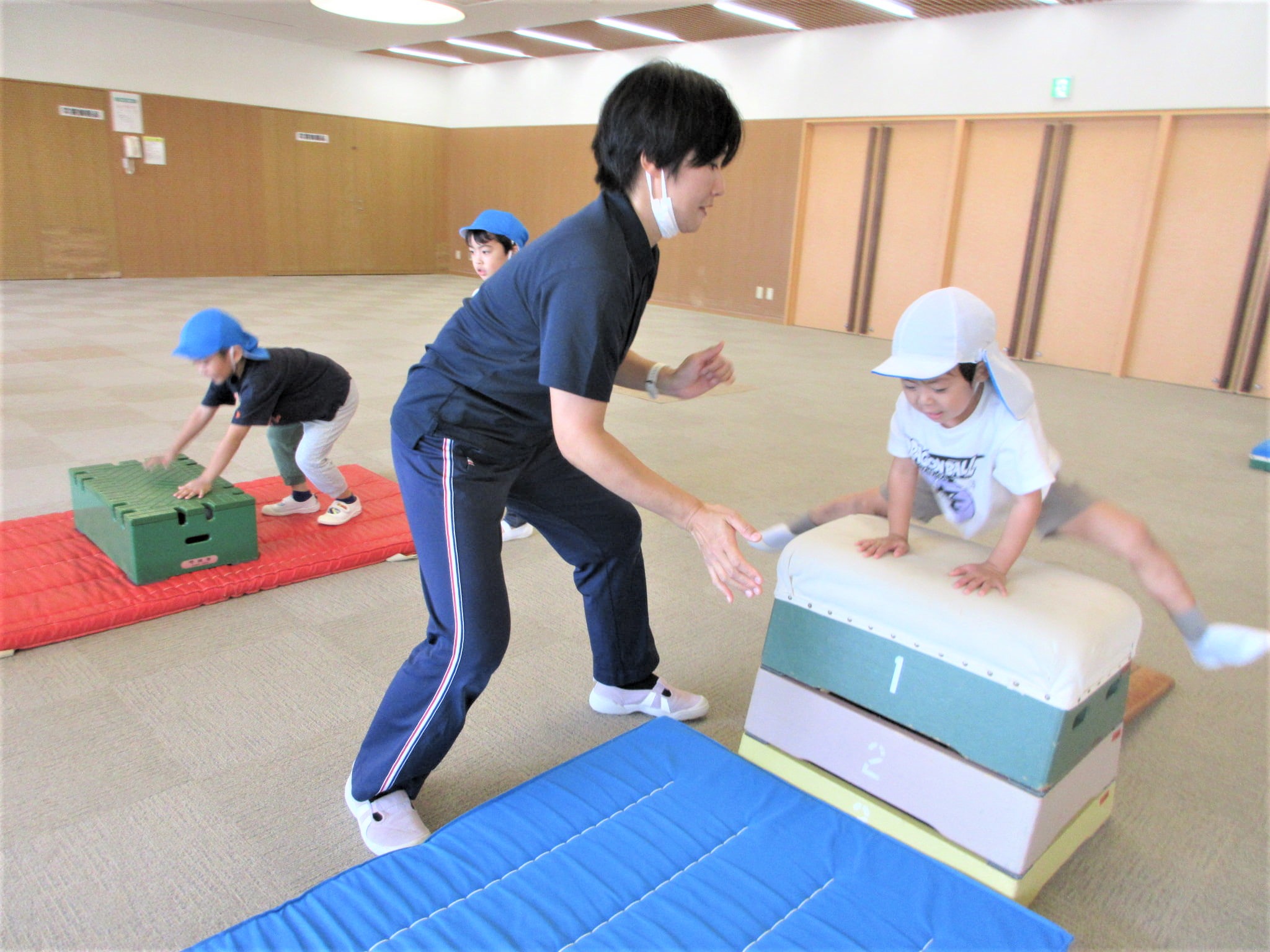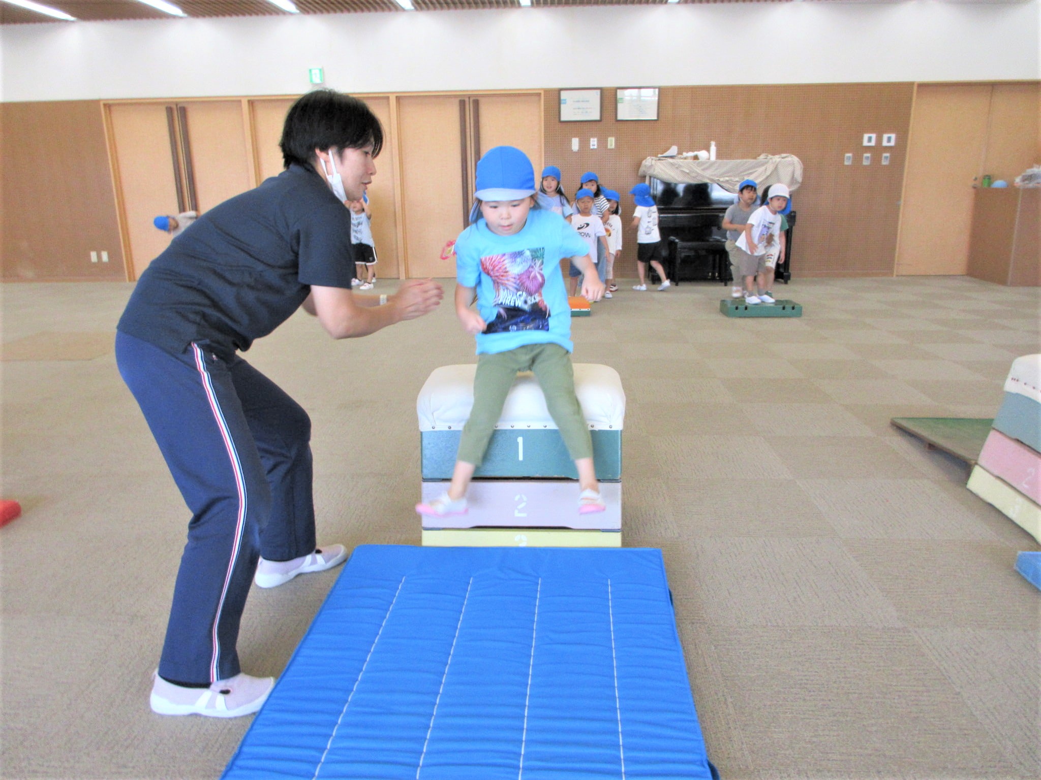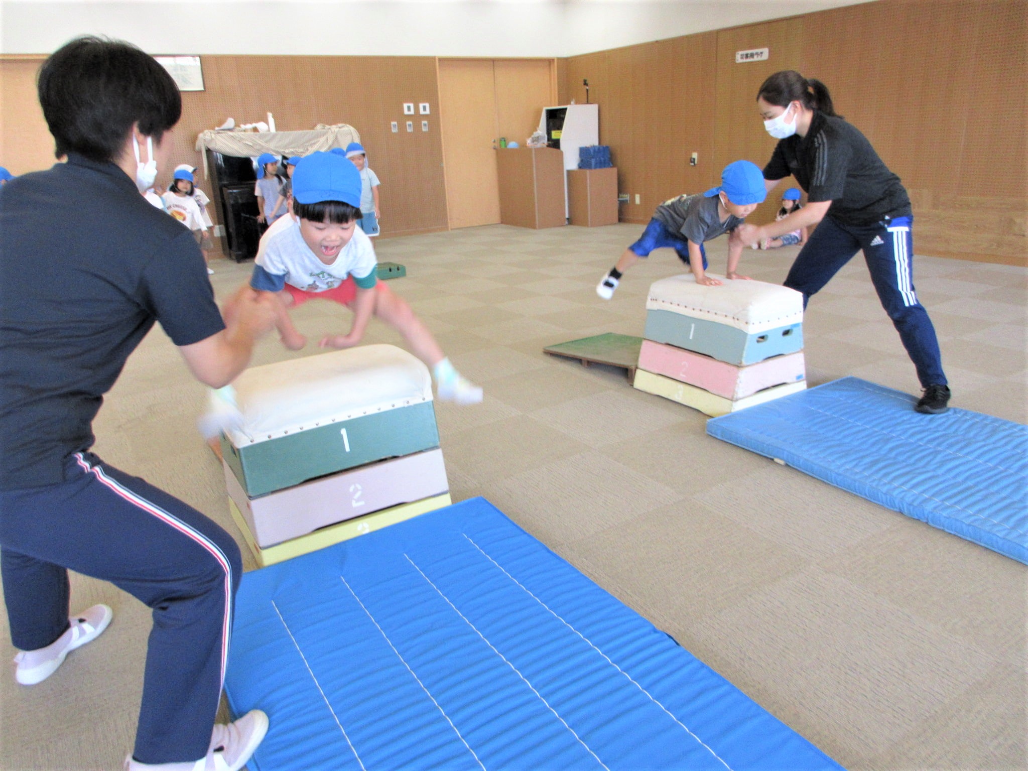 「走るのもグージャンプも力強くなってるよ!あとは、跳び箱を手で押すと跳べるよ!」というように