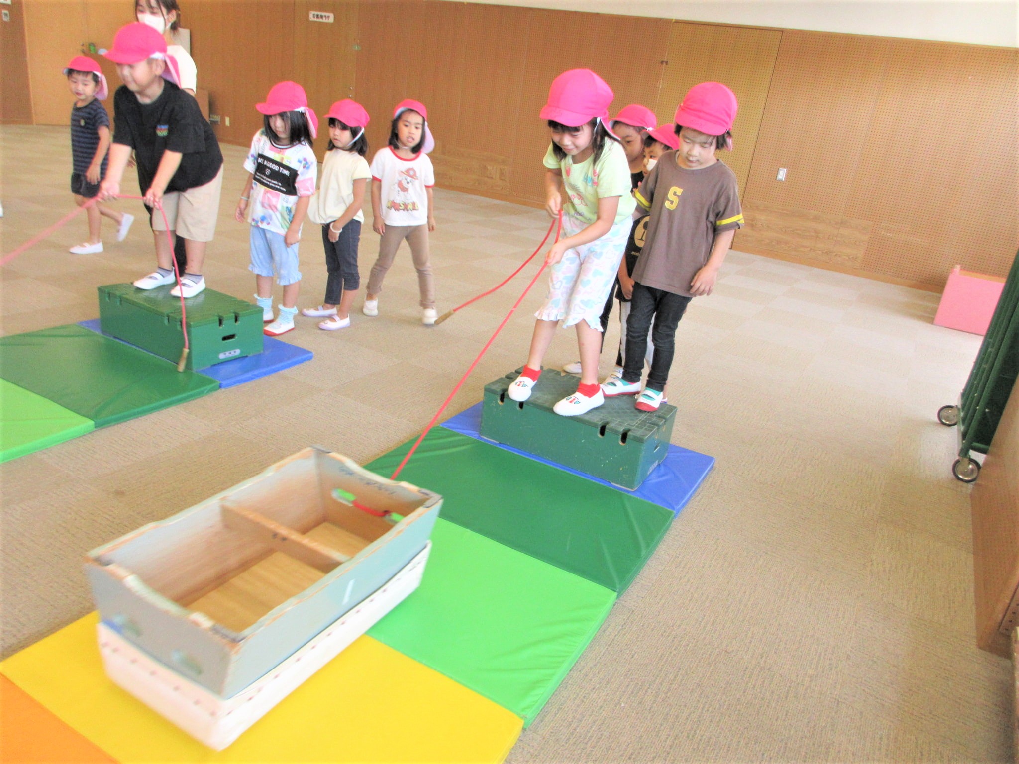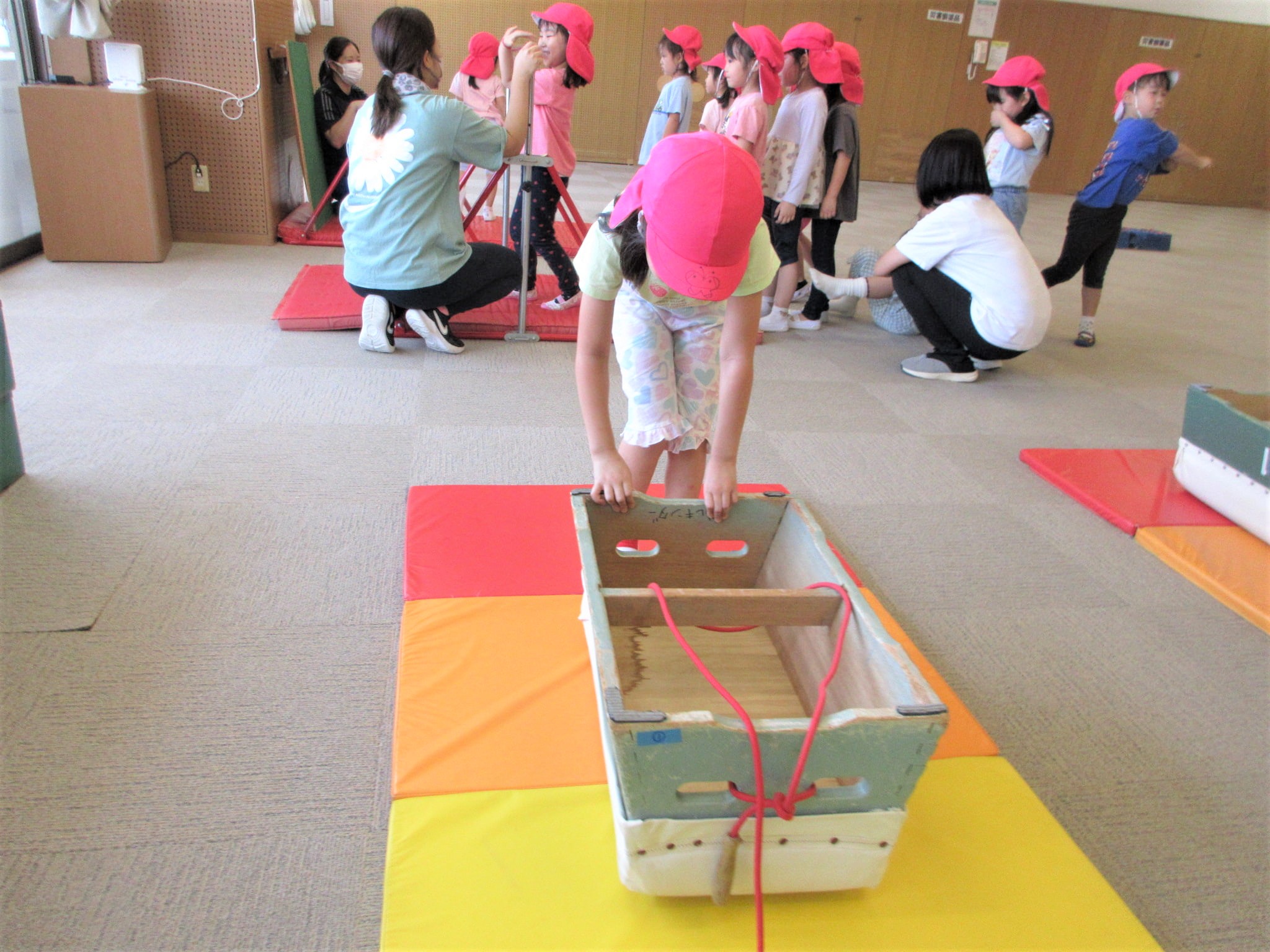 逆さまになった跳び箱を縄で引っ張る取り組みでも、腕の力をつけていくようです♪