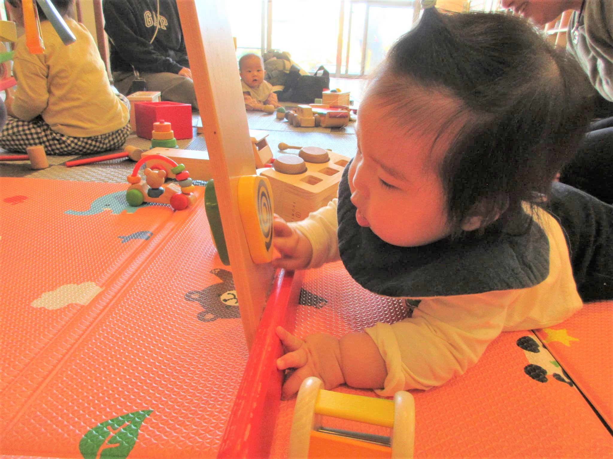 寝返りやずりばい・つかまり立ち…お母さんを安心基地にしながら「自分でやってみよう!」とする姿など