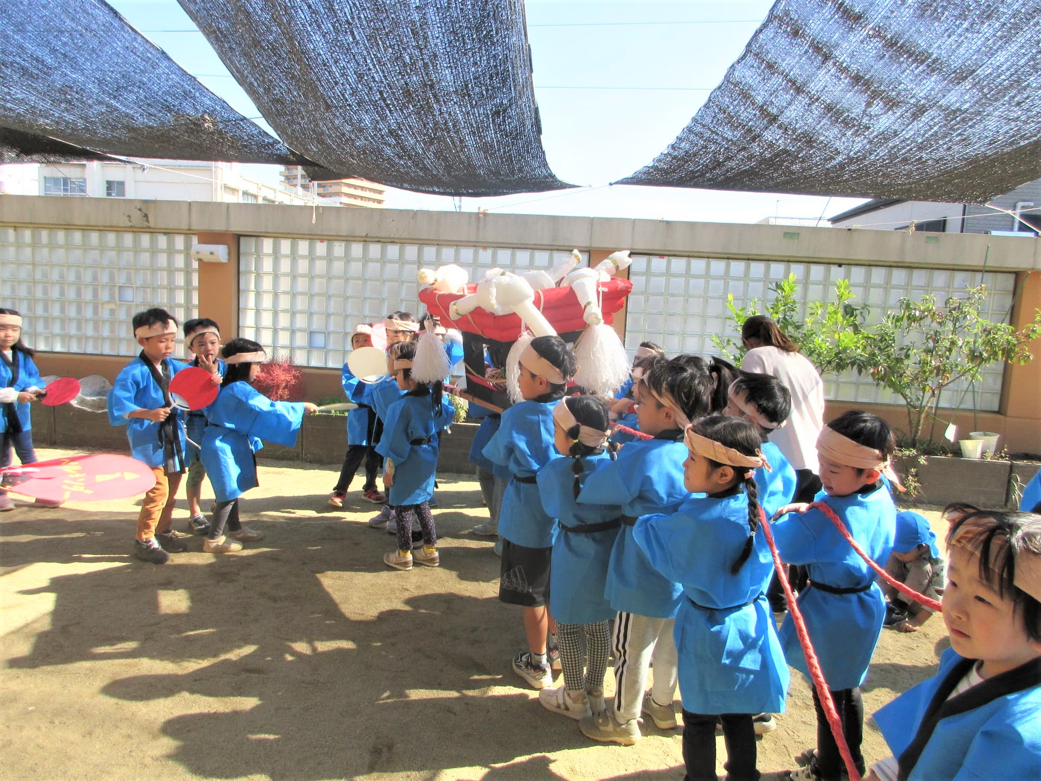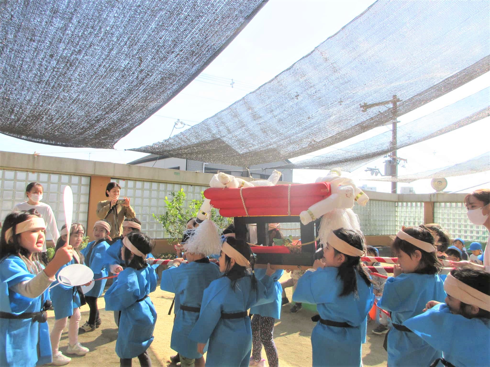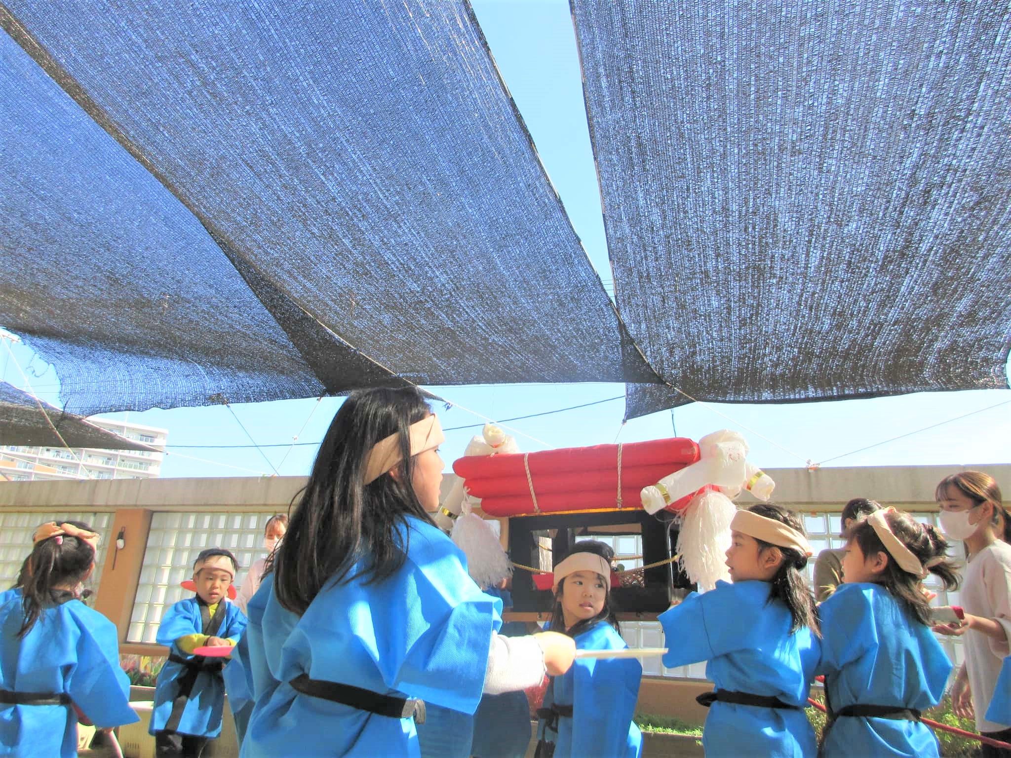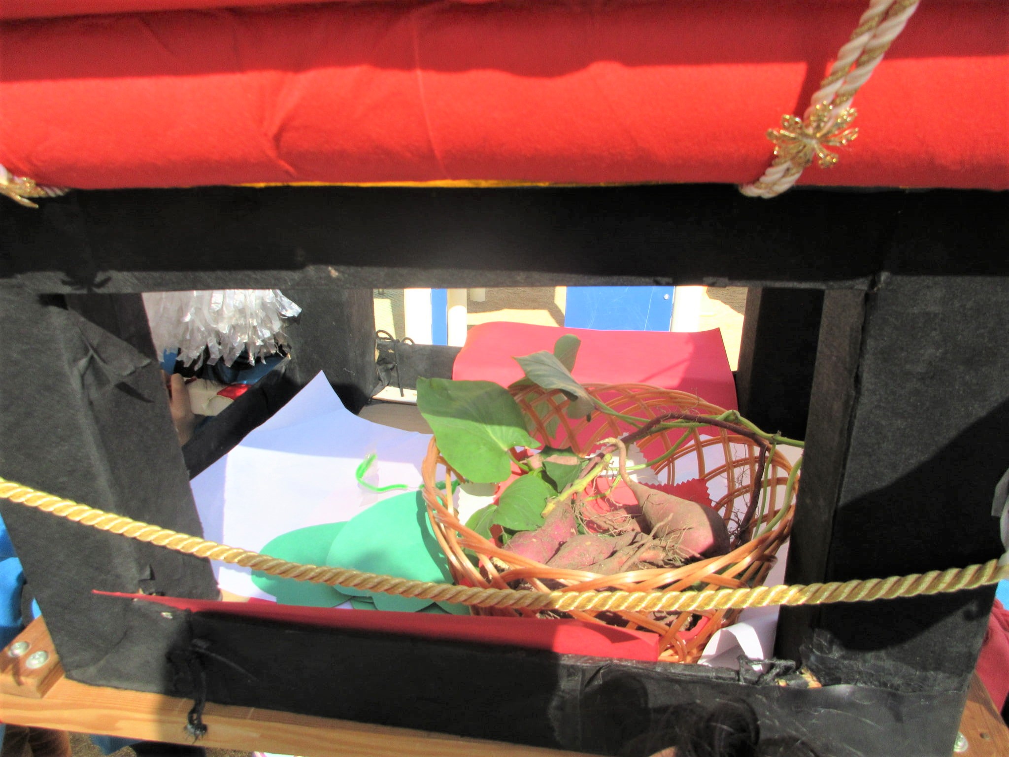 収穫したさつまいもを“ふとん太鼓”に乗せます!