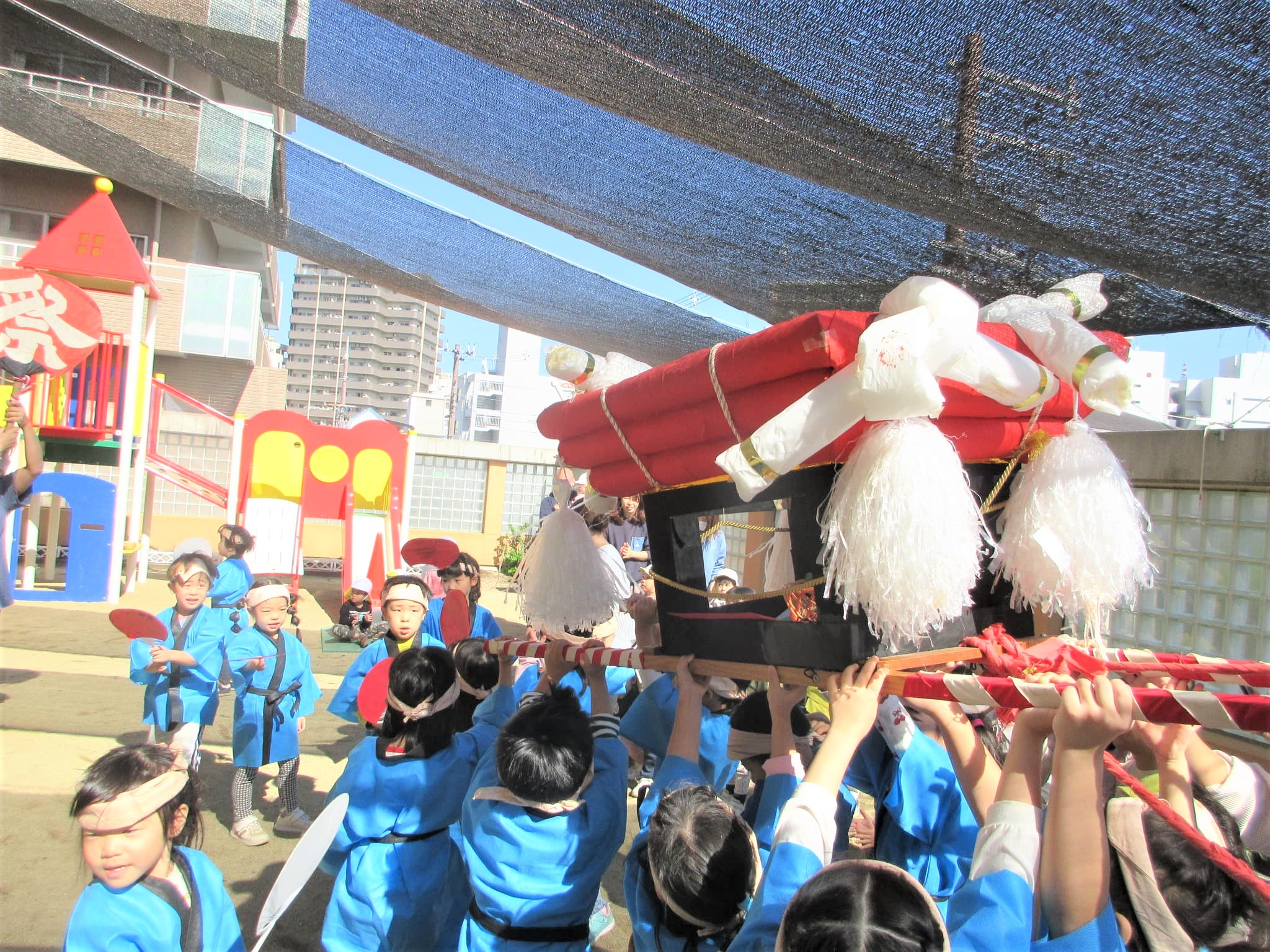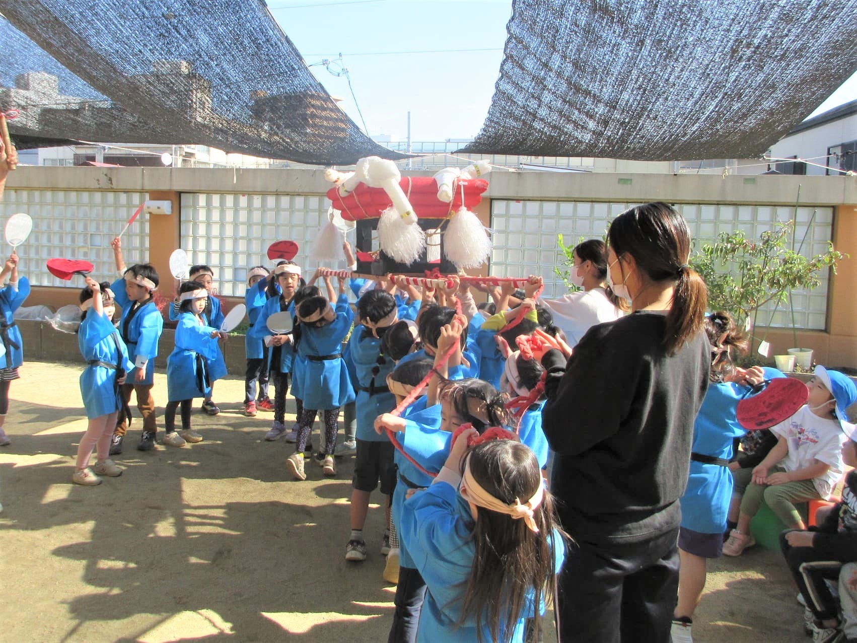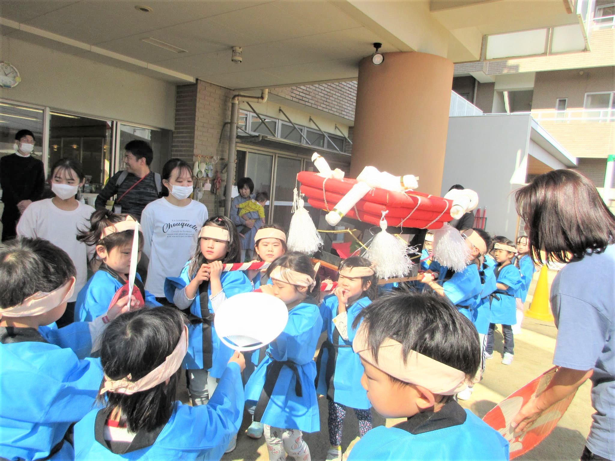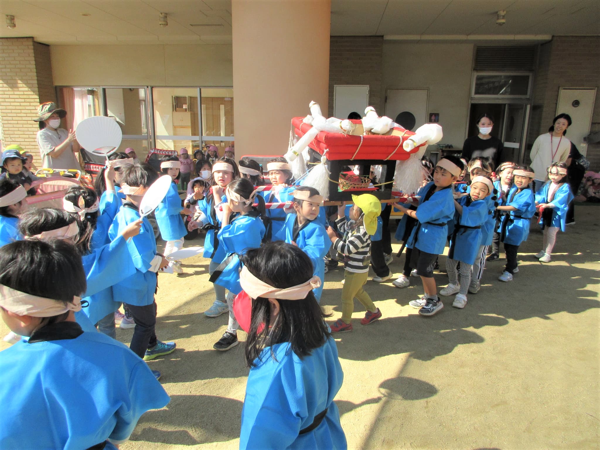 収穫したさつまいもを“ふとん太鼓”に乗せます!