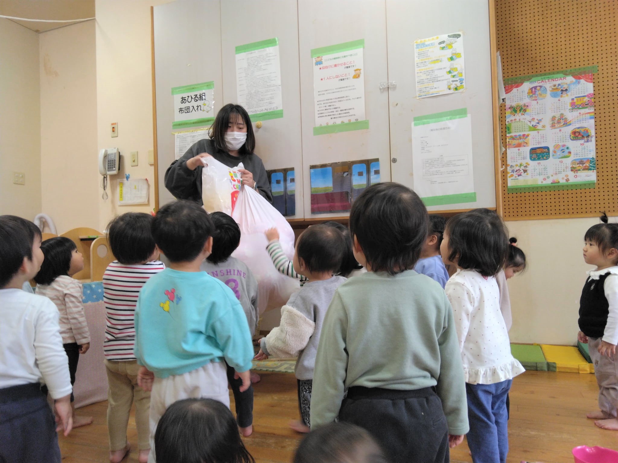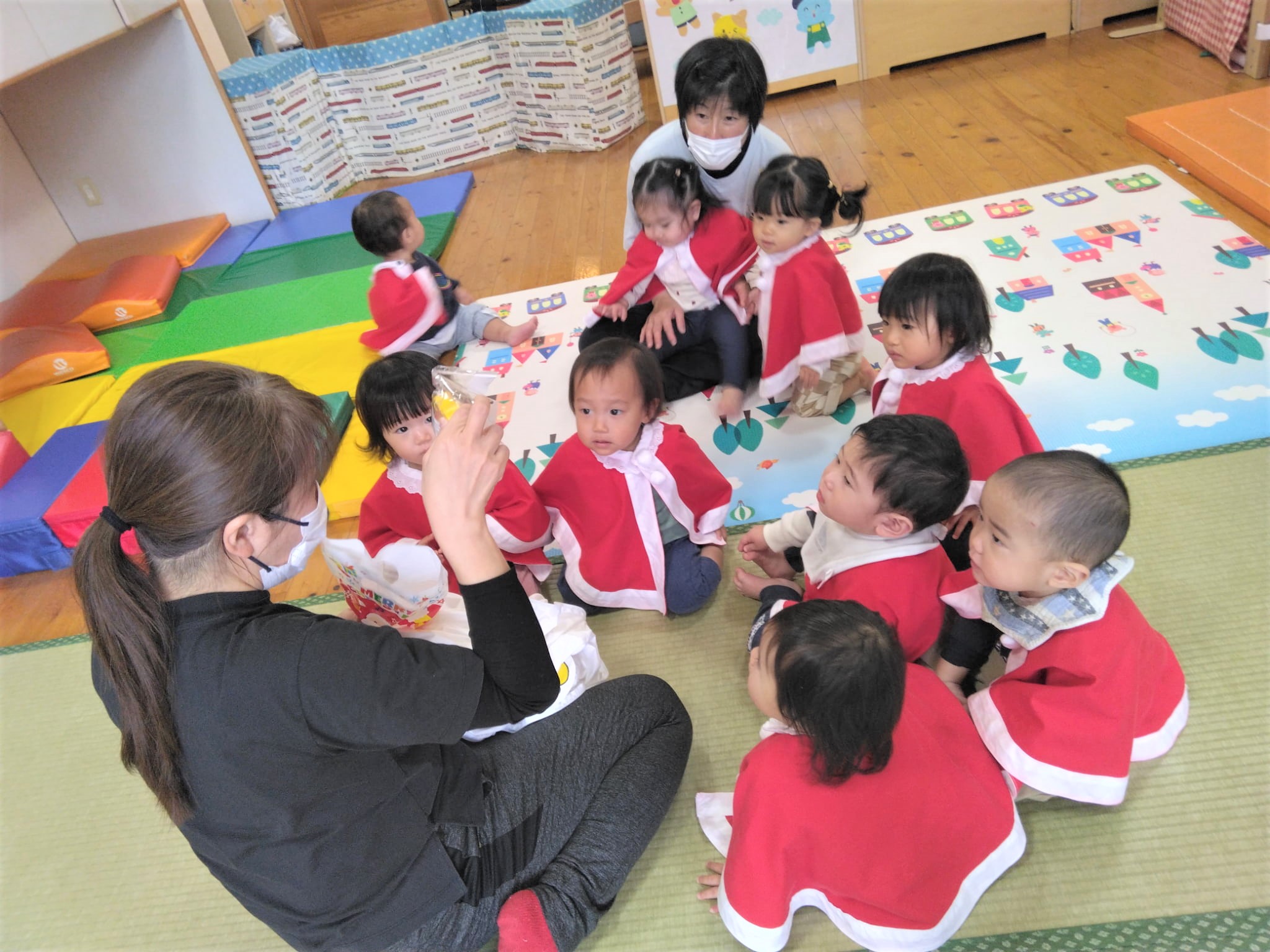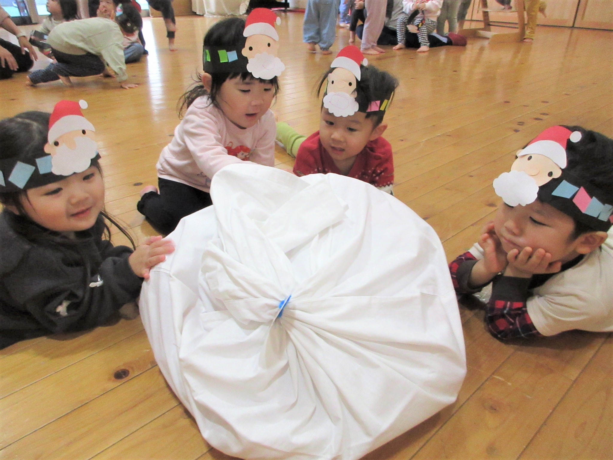 うさぎ組の子どもたちが、サンタさんの袋を見つめていました(笑)