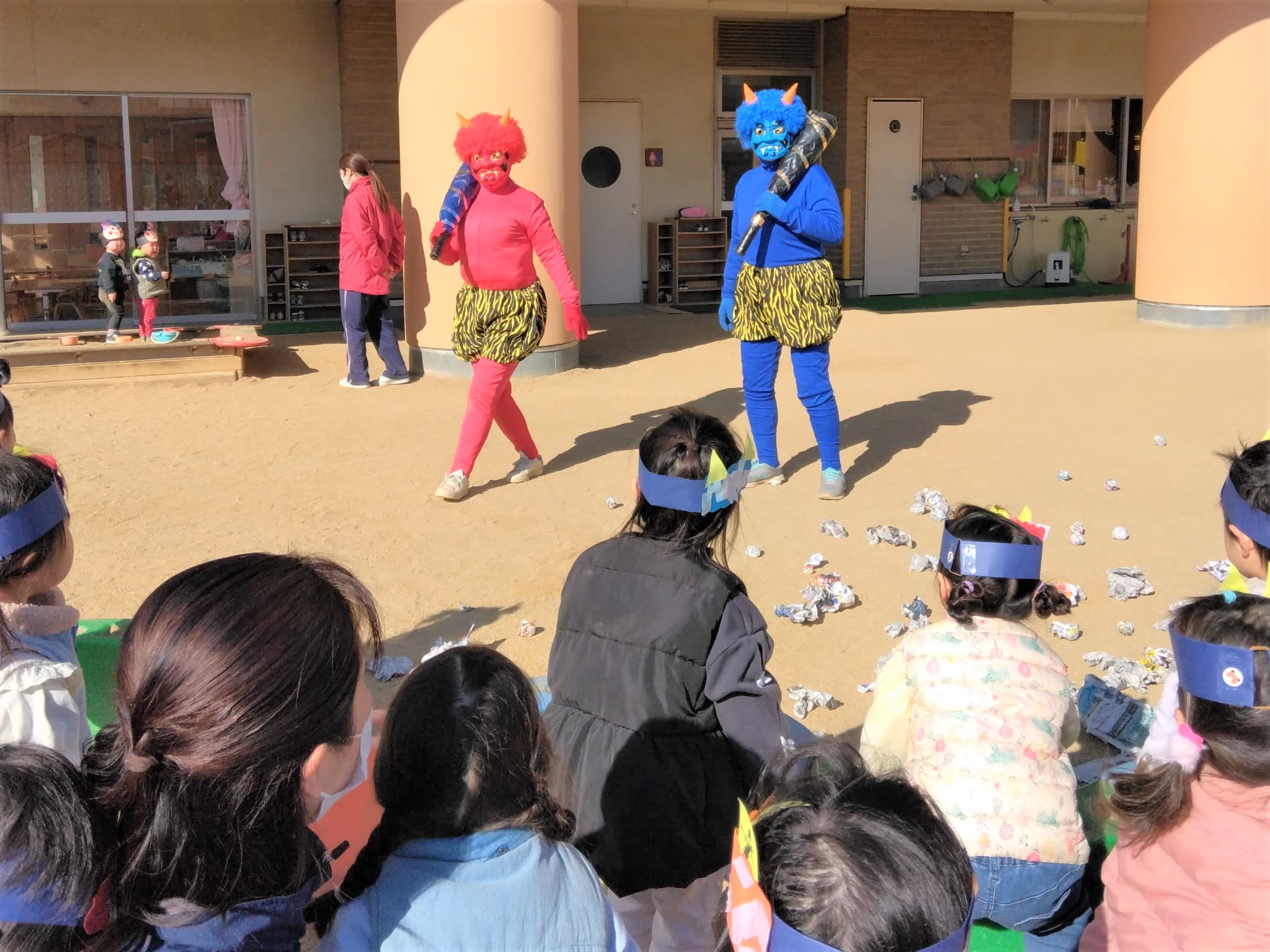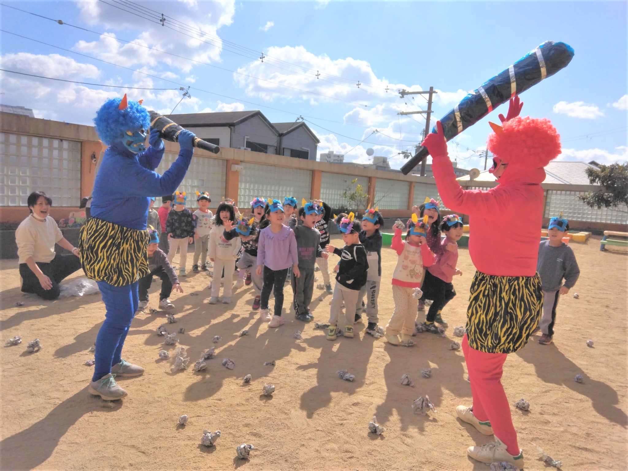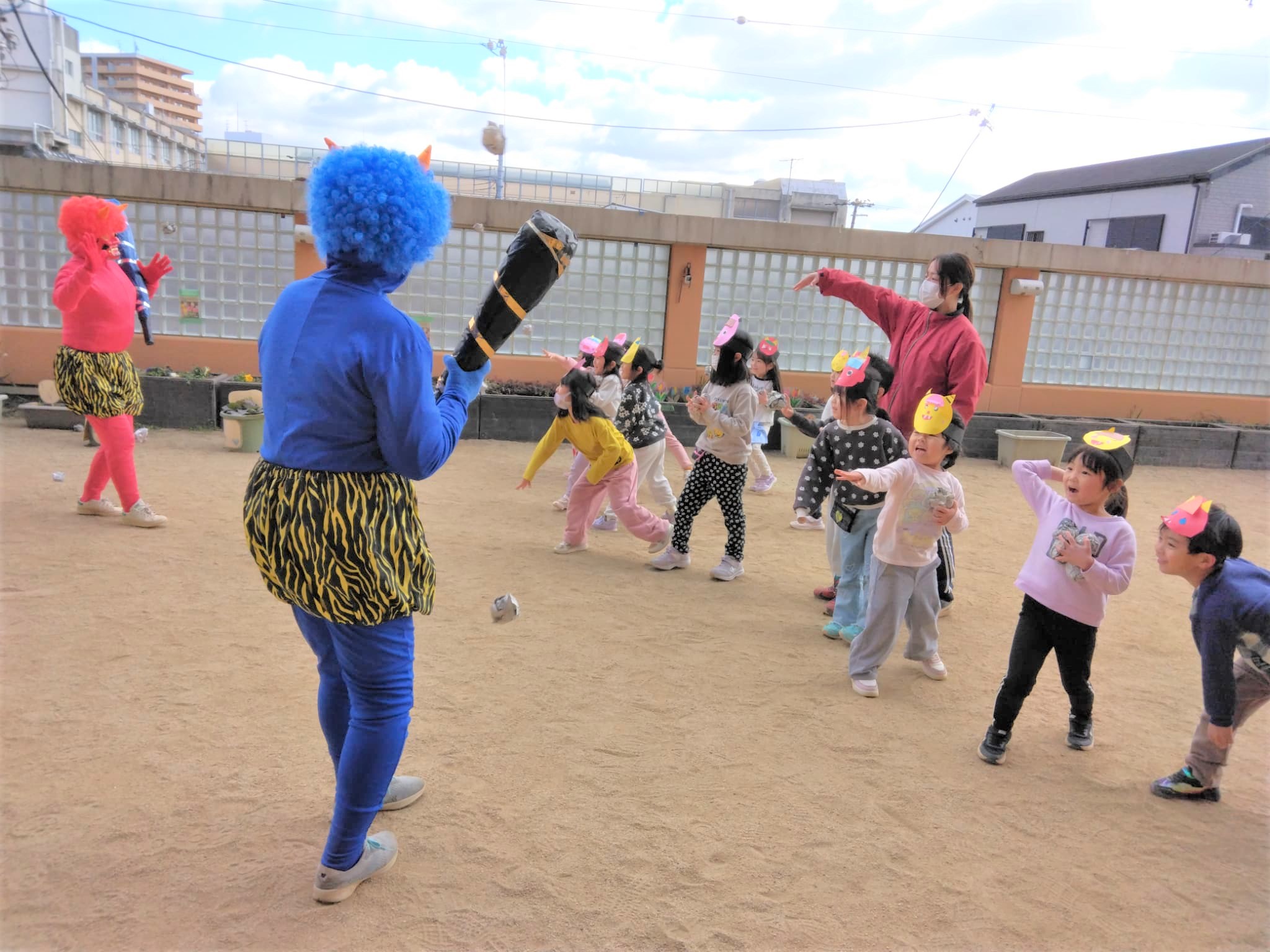 今年もベルキンダーの園庭に、赤鬼・青鬼がやってきました!!