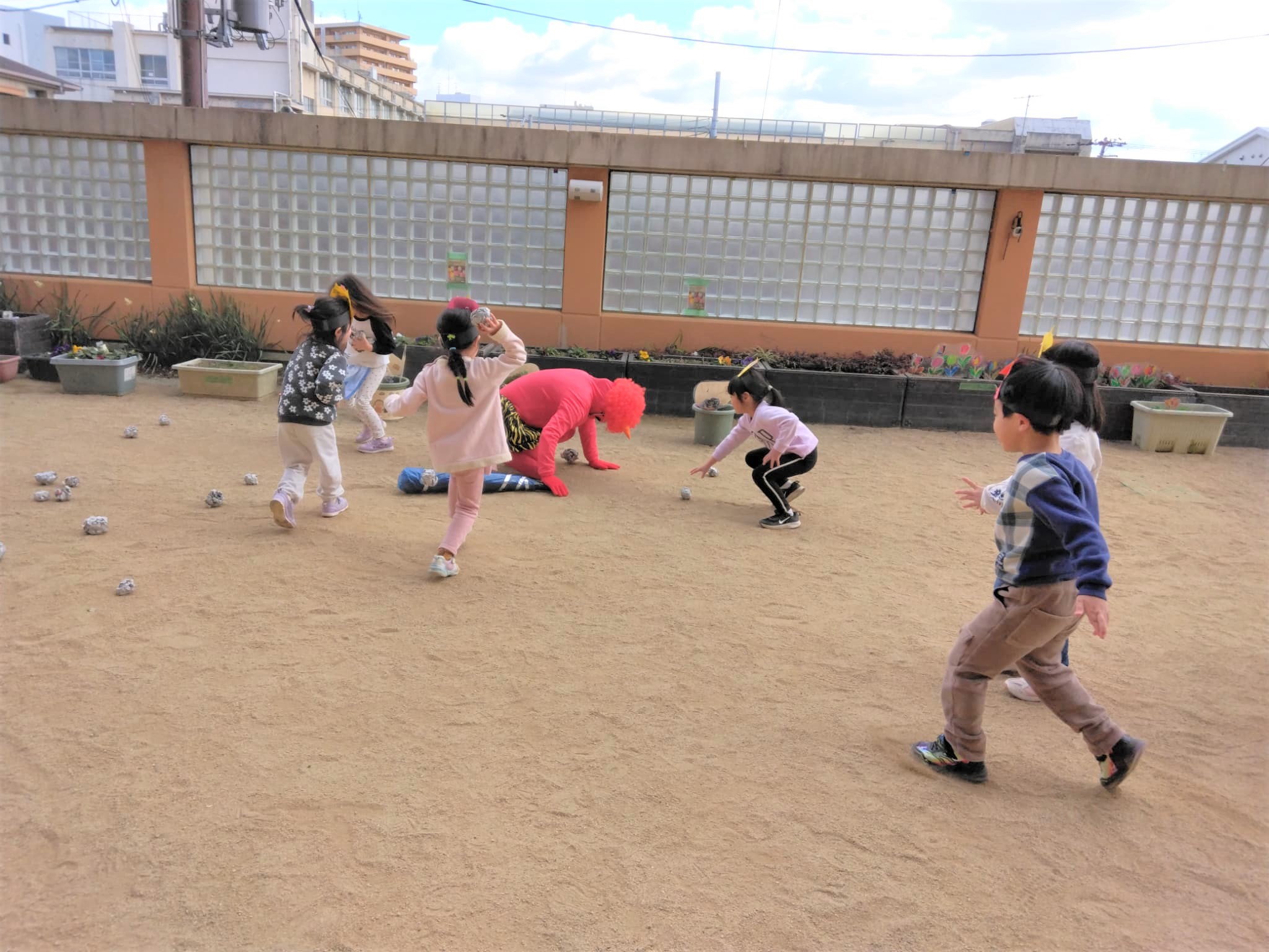 最後は、らいおん組の子どもたちが力いっぱい豆を投げて