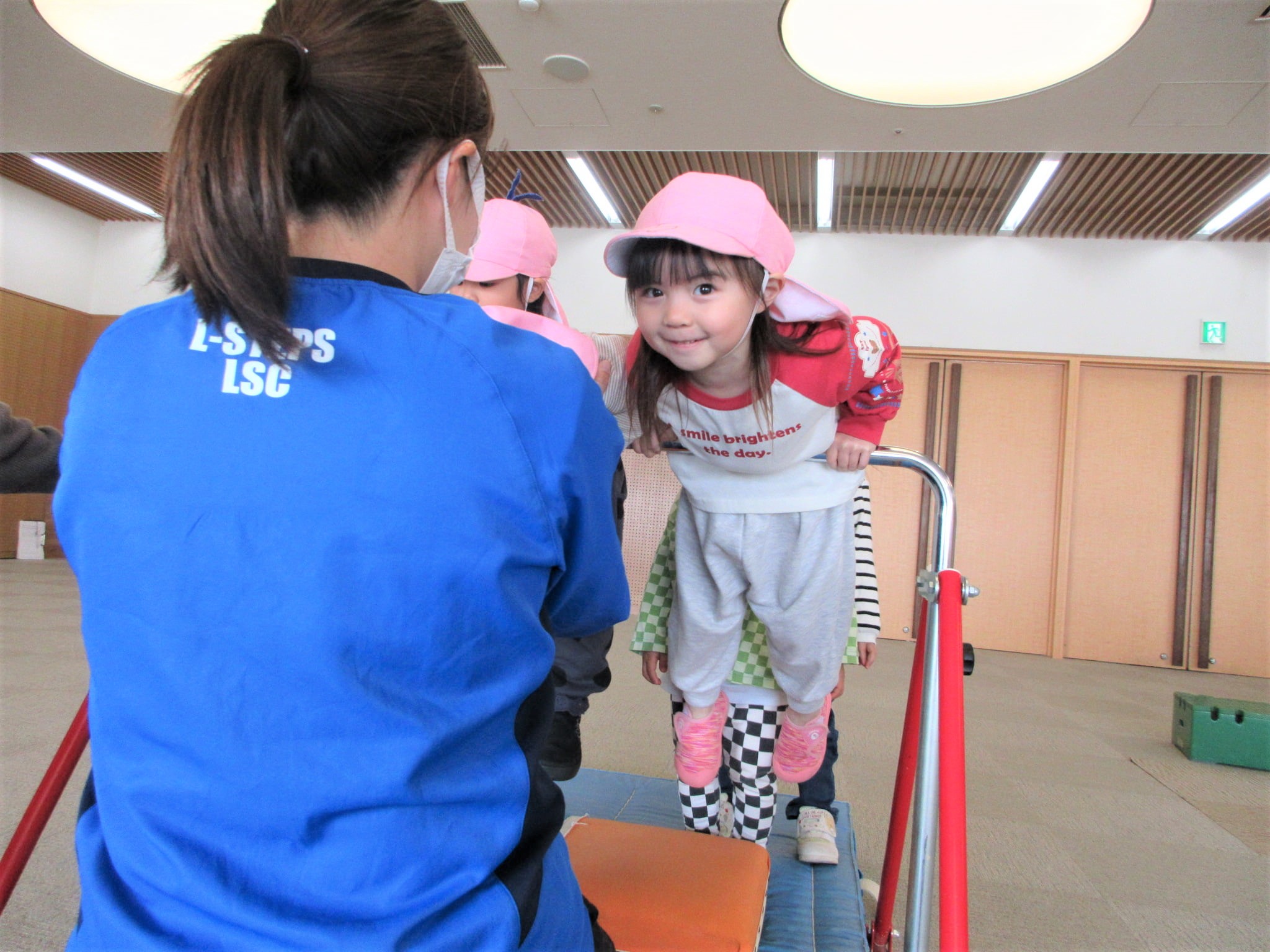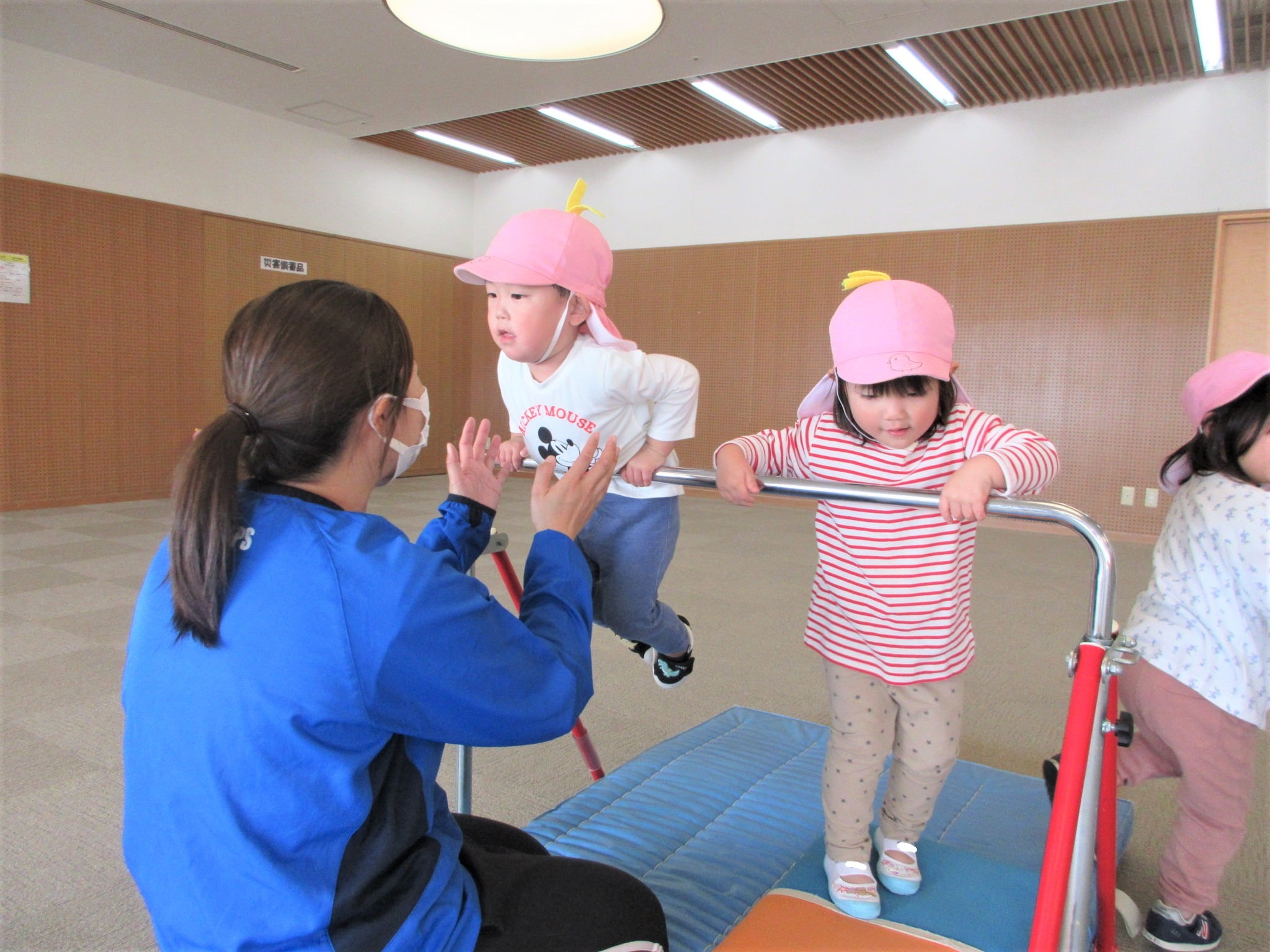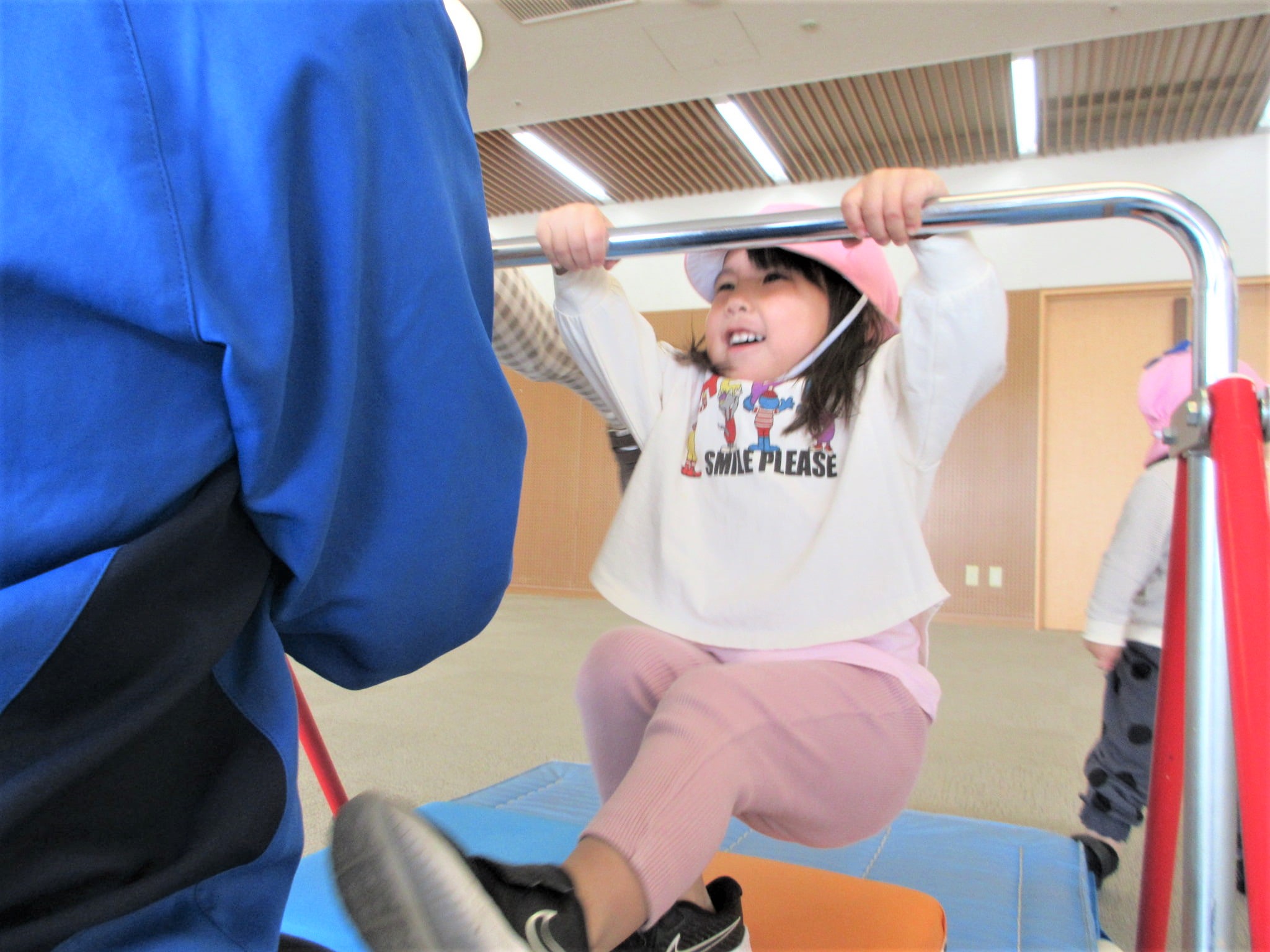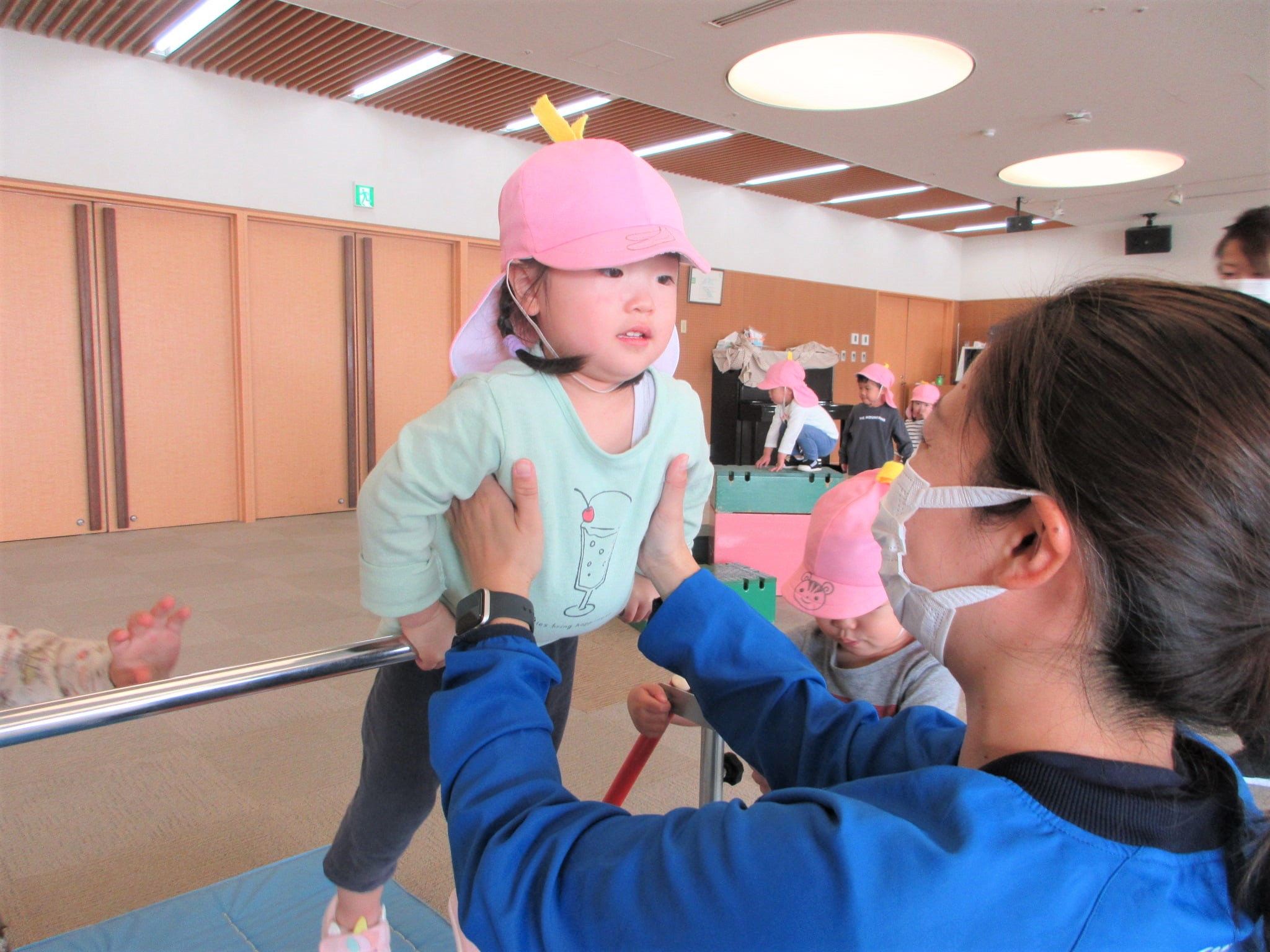 まずは、自分で鉄棒に跳び乗ろうとジャンプする姿がありました♪