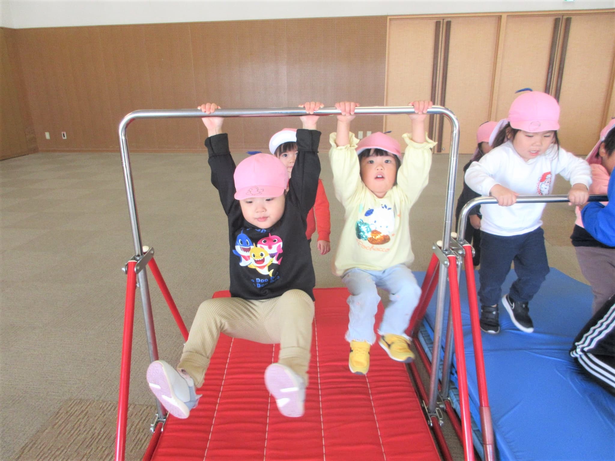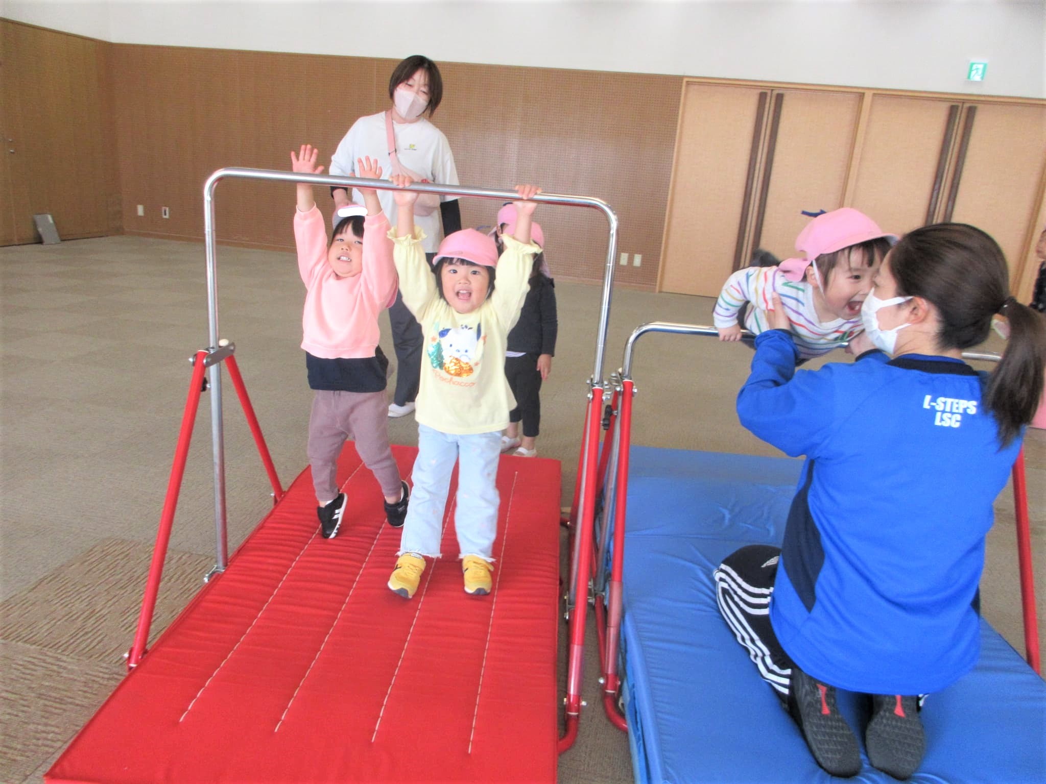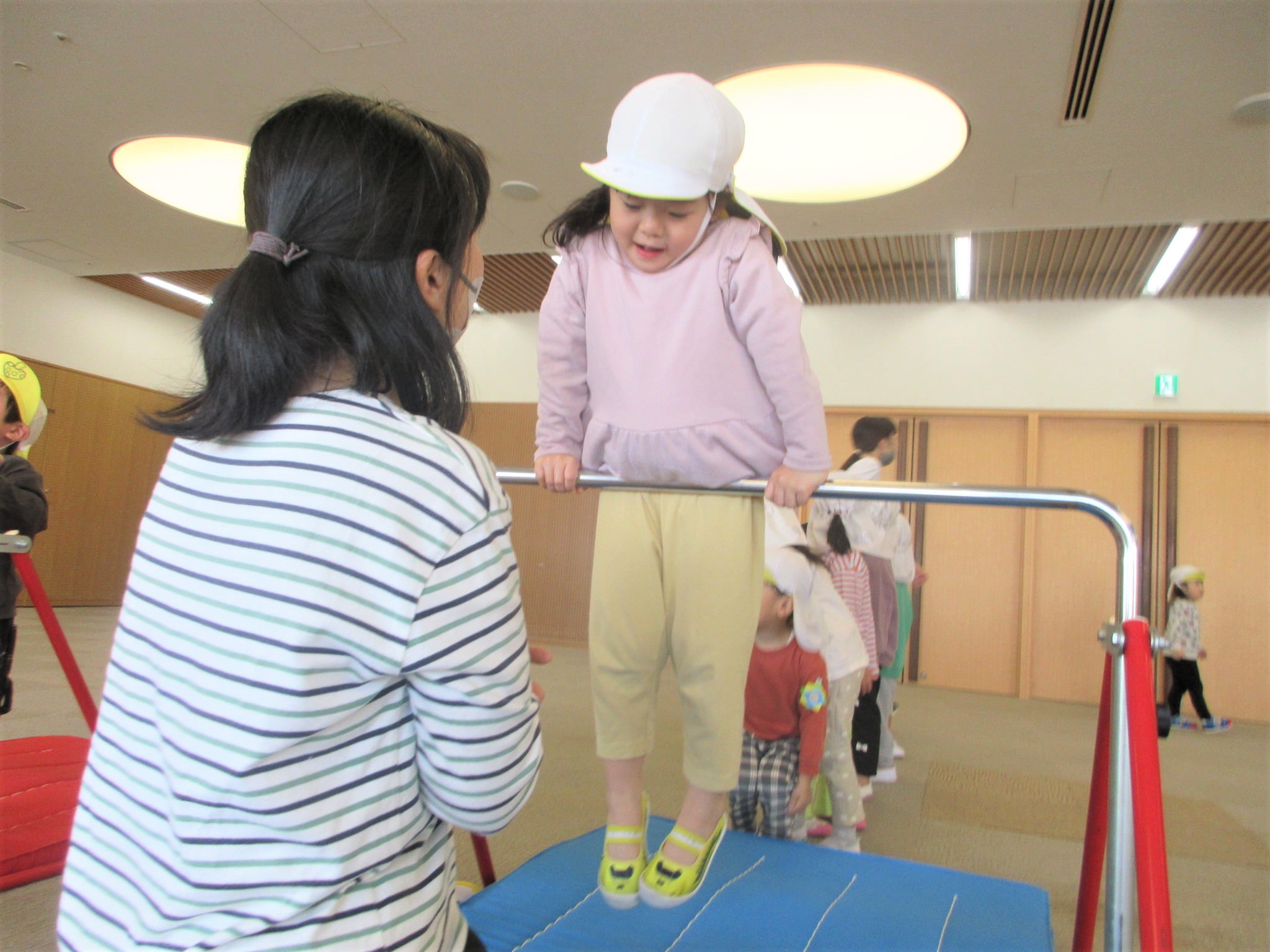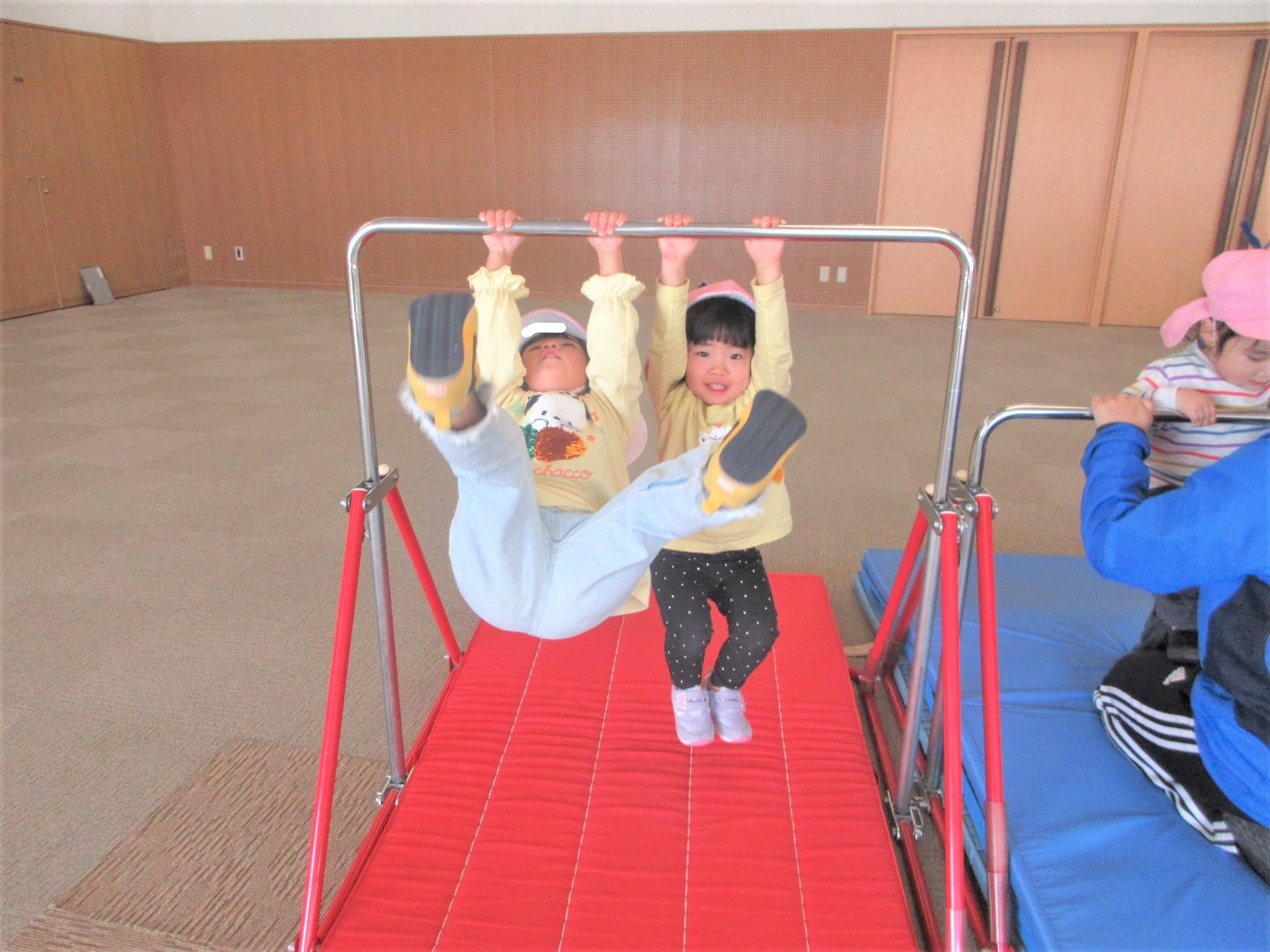 ジャンプして鉄棒に跳び乗っています!つばめのポーズも、肘を伸ばそうと意識する子どもいました。