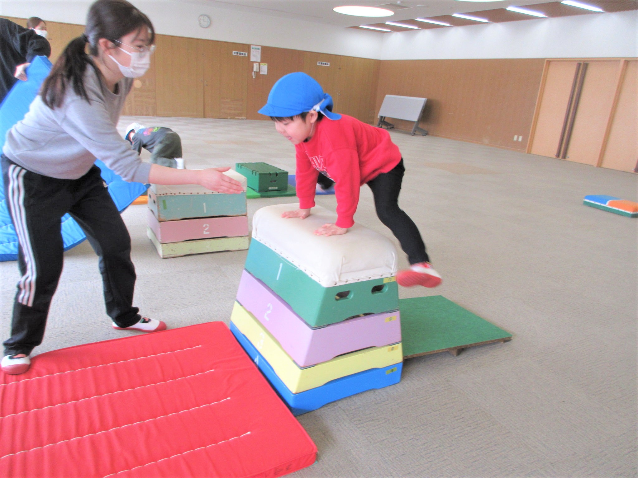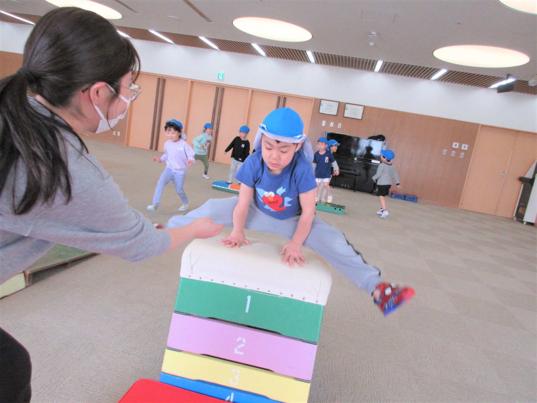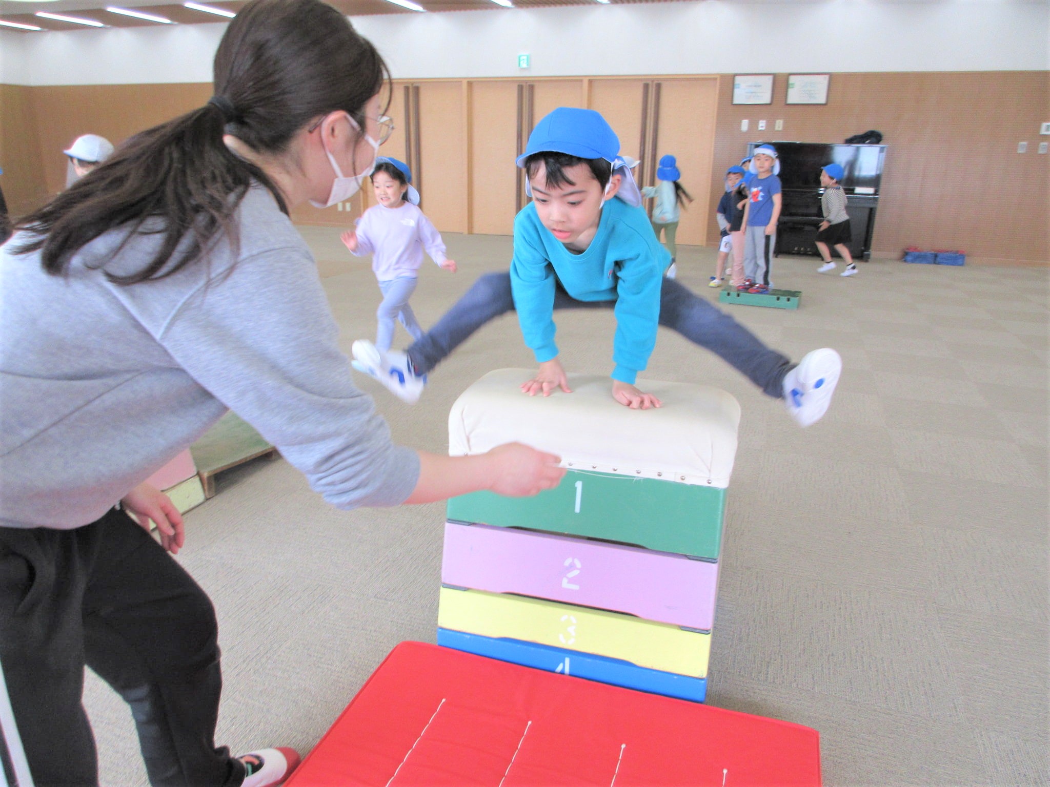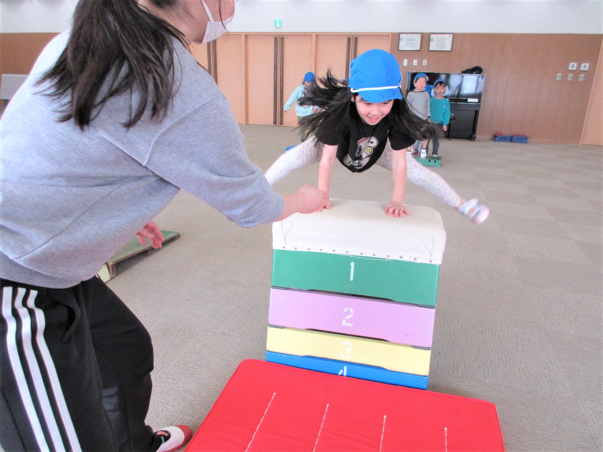 「ベルキンダーには、5段の跳び箱もあるんやで~♪」と言うと