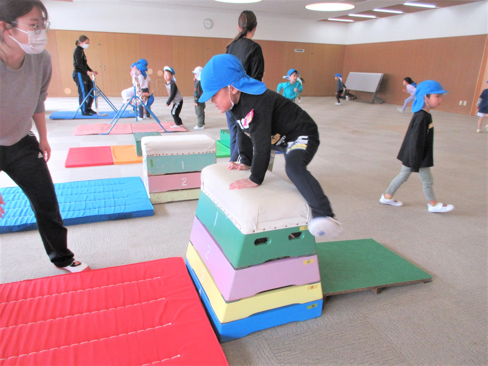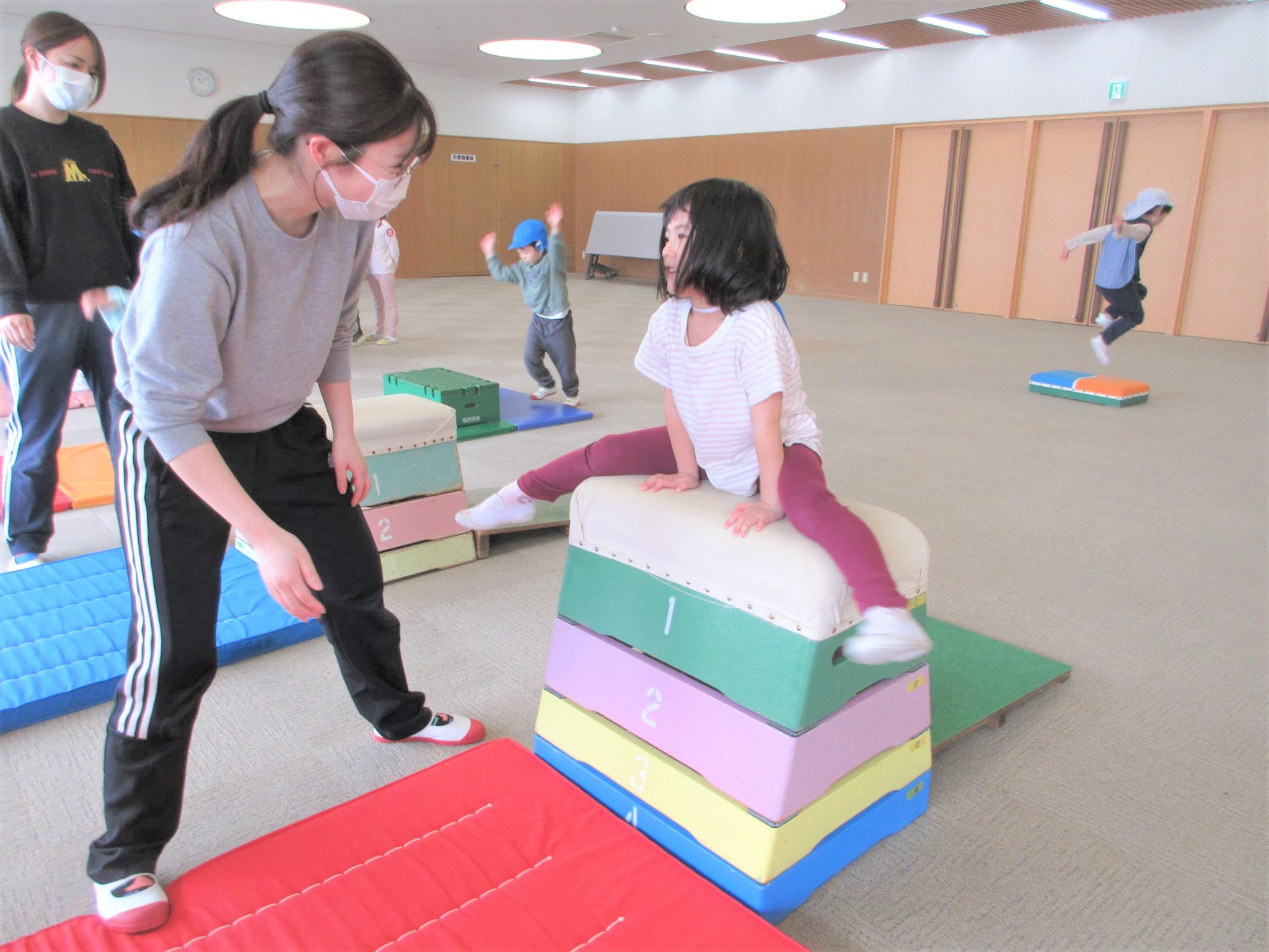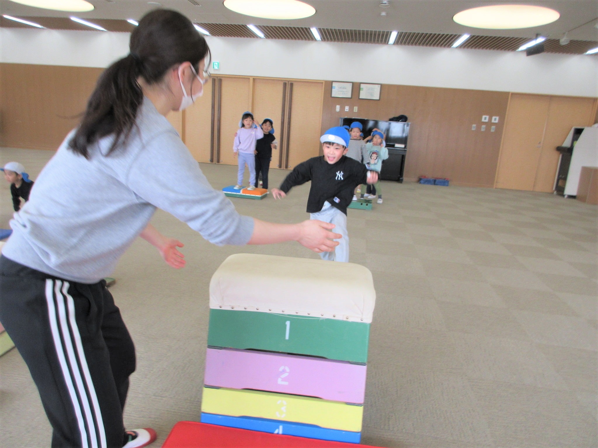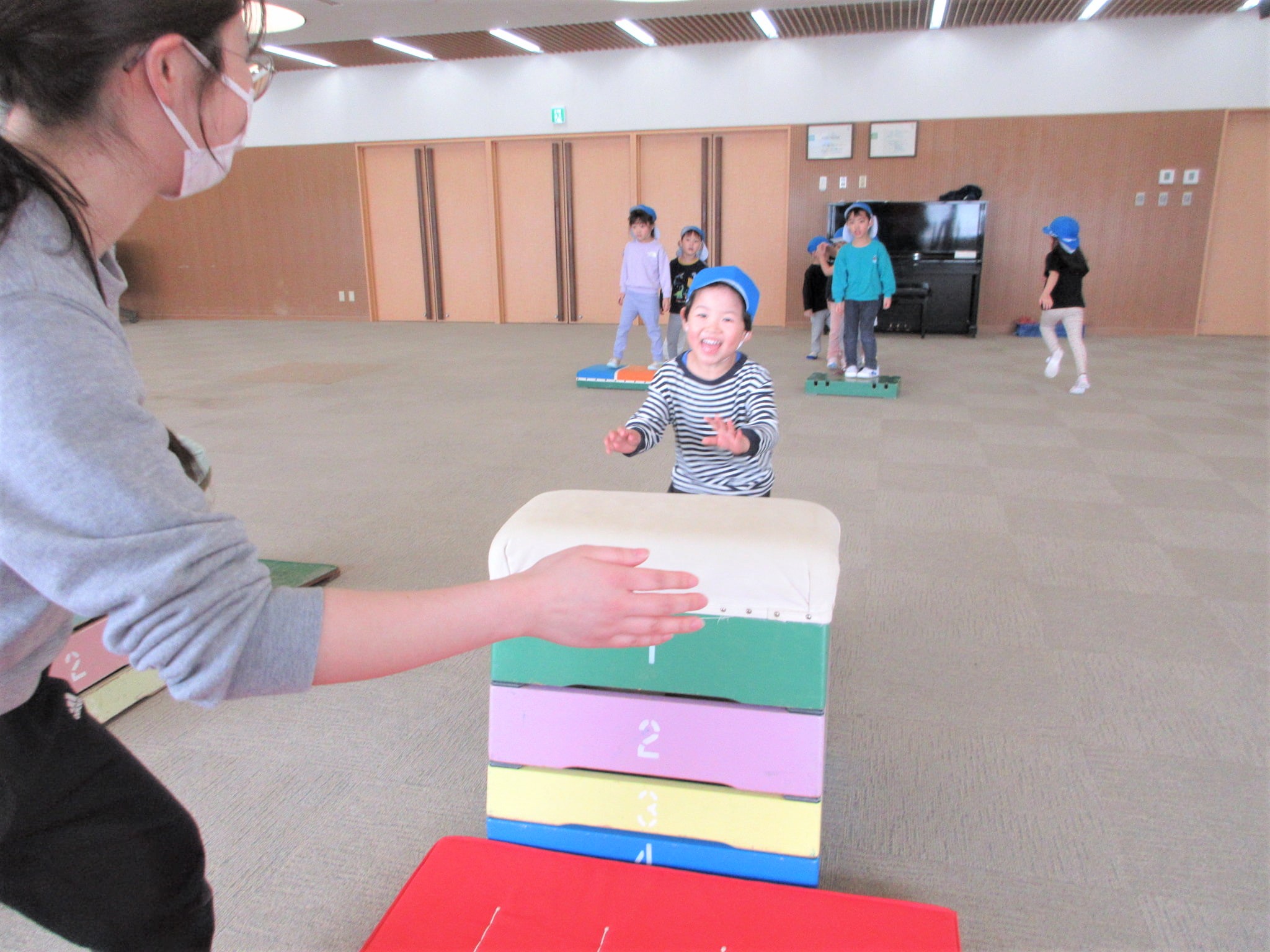 「ベルキンダーには、5段の跳び箱もあるんやで~♪」と言うと