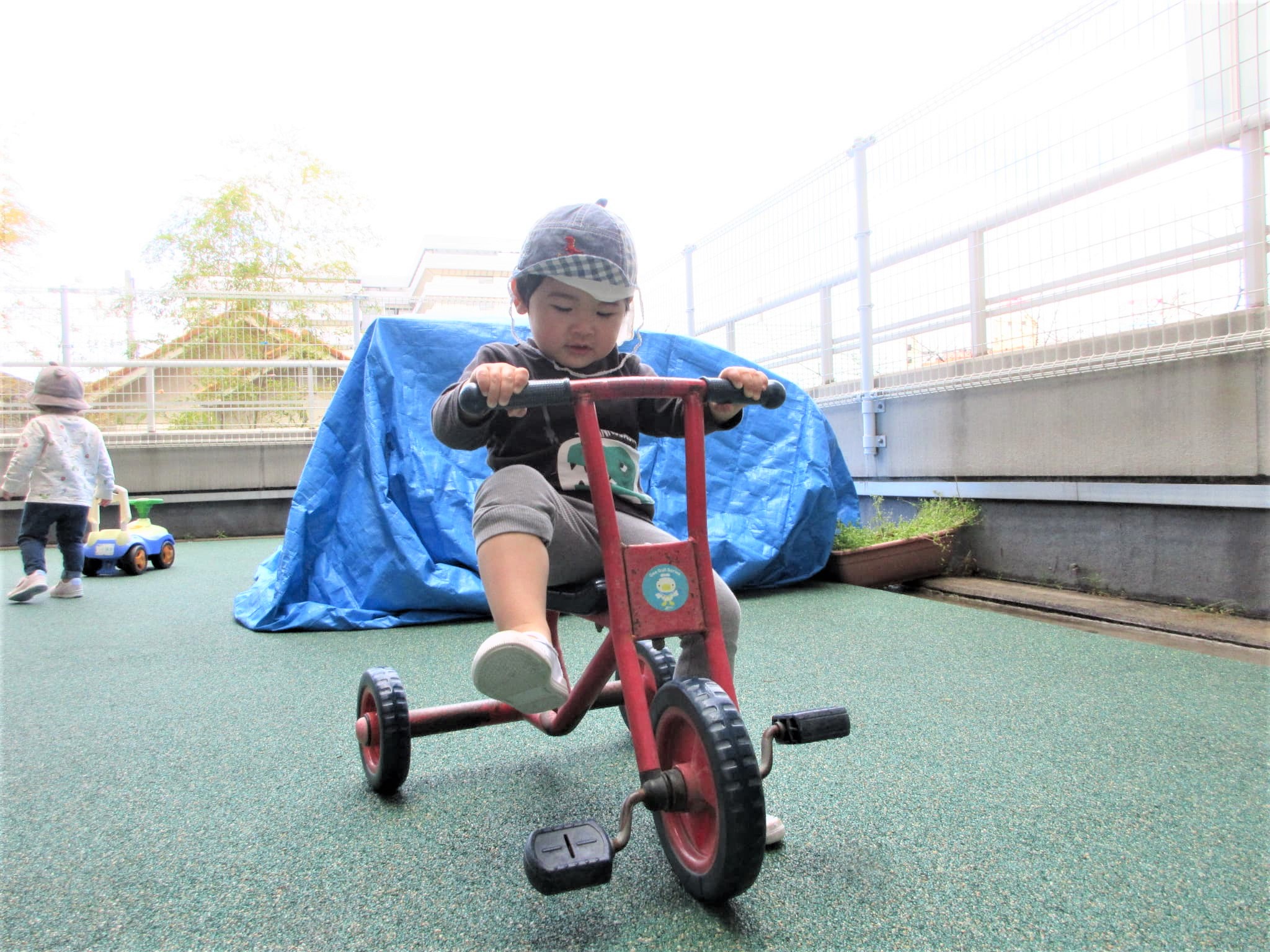 前日の雨で、水たまりが多くて園庭が使えなかったので、今日は中庭で遊んでいました♪