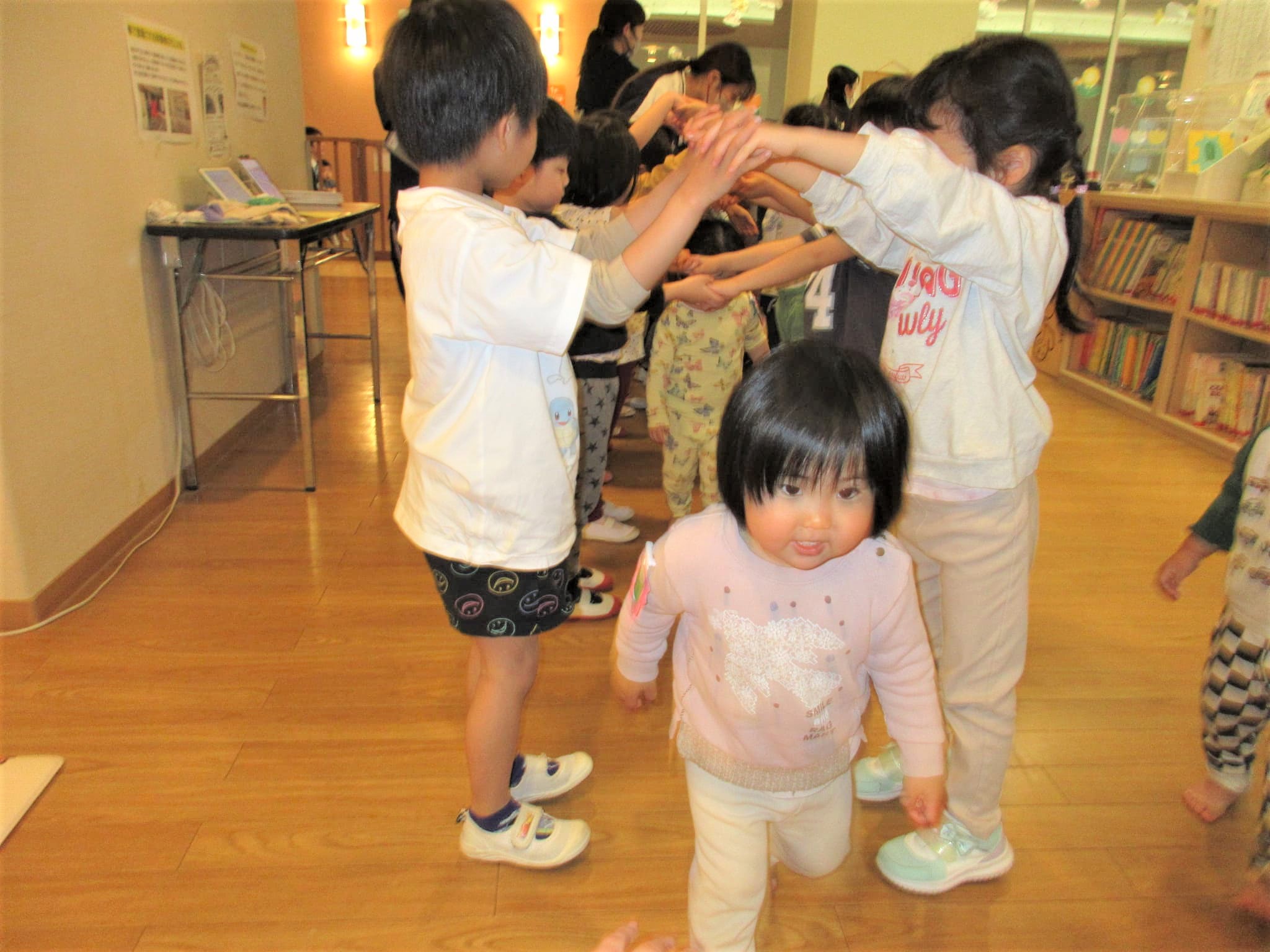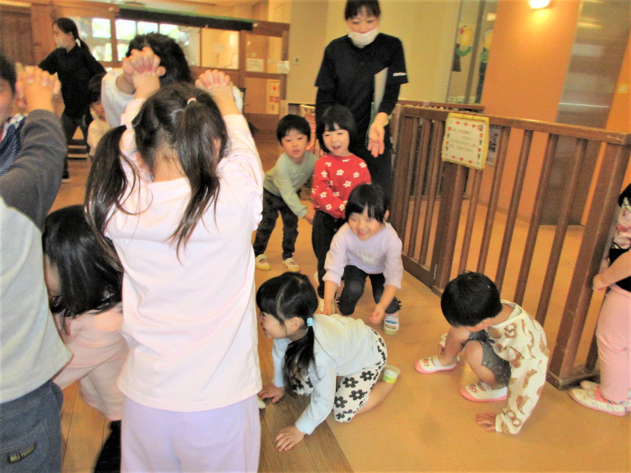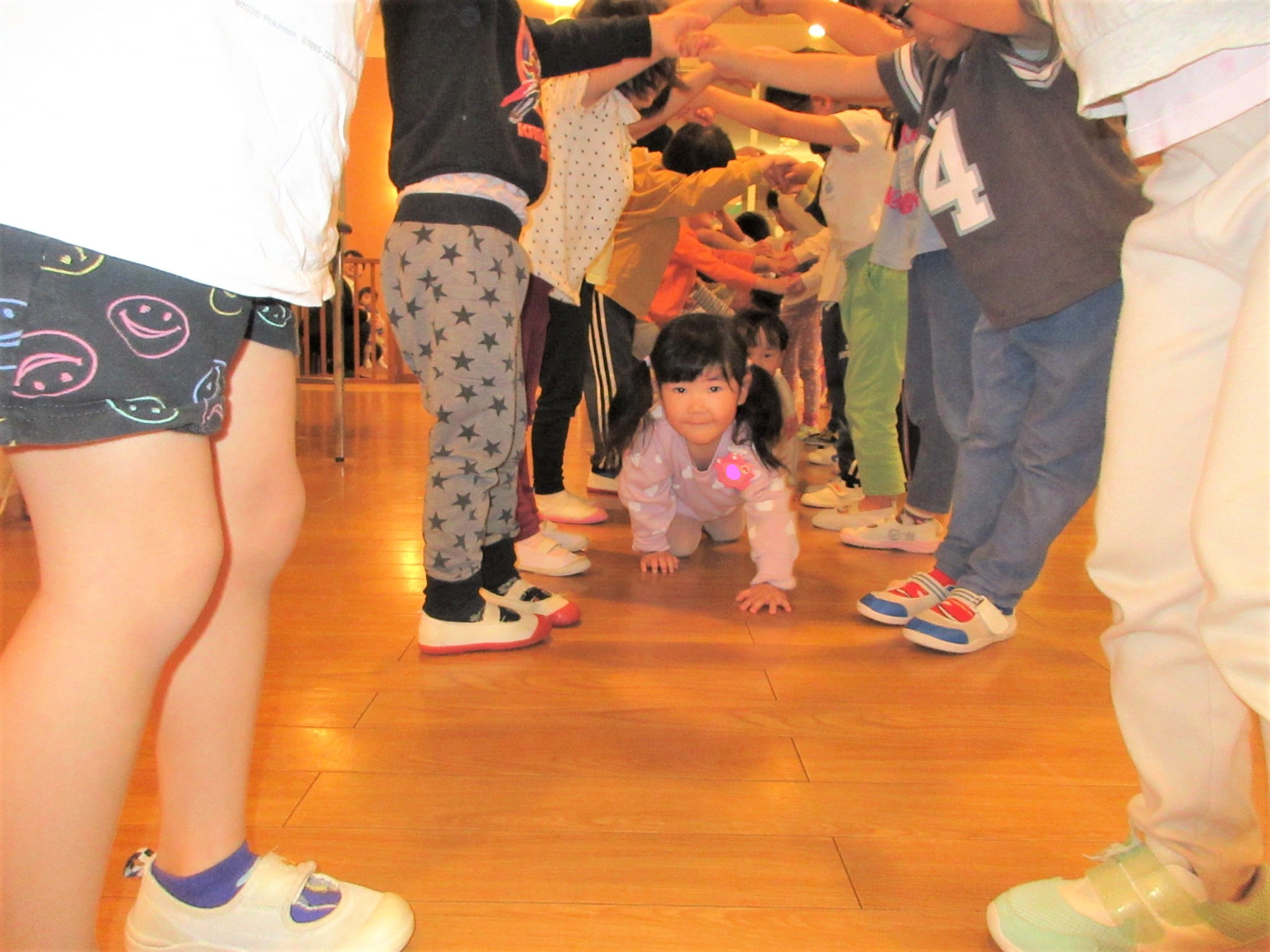 らいおん組に子どもたちにトンネルをつくってもらい、異年齢が通ることができるようにしてくれました♪