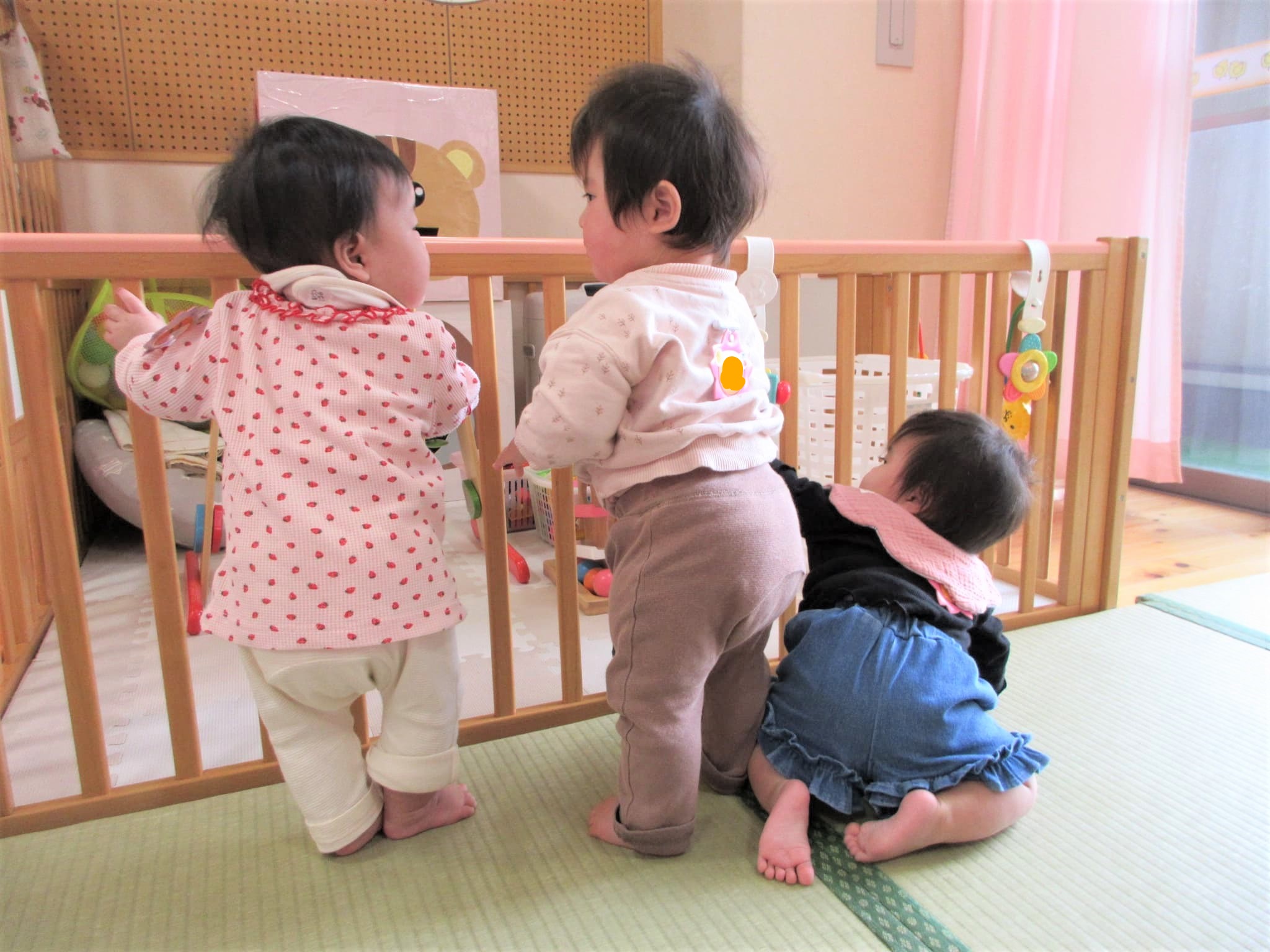 つかまり立ちをしながら見つめ合っている二人の後ろ姿が・・・何とも言えません(*^^*)