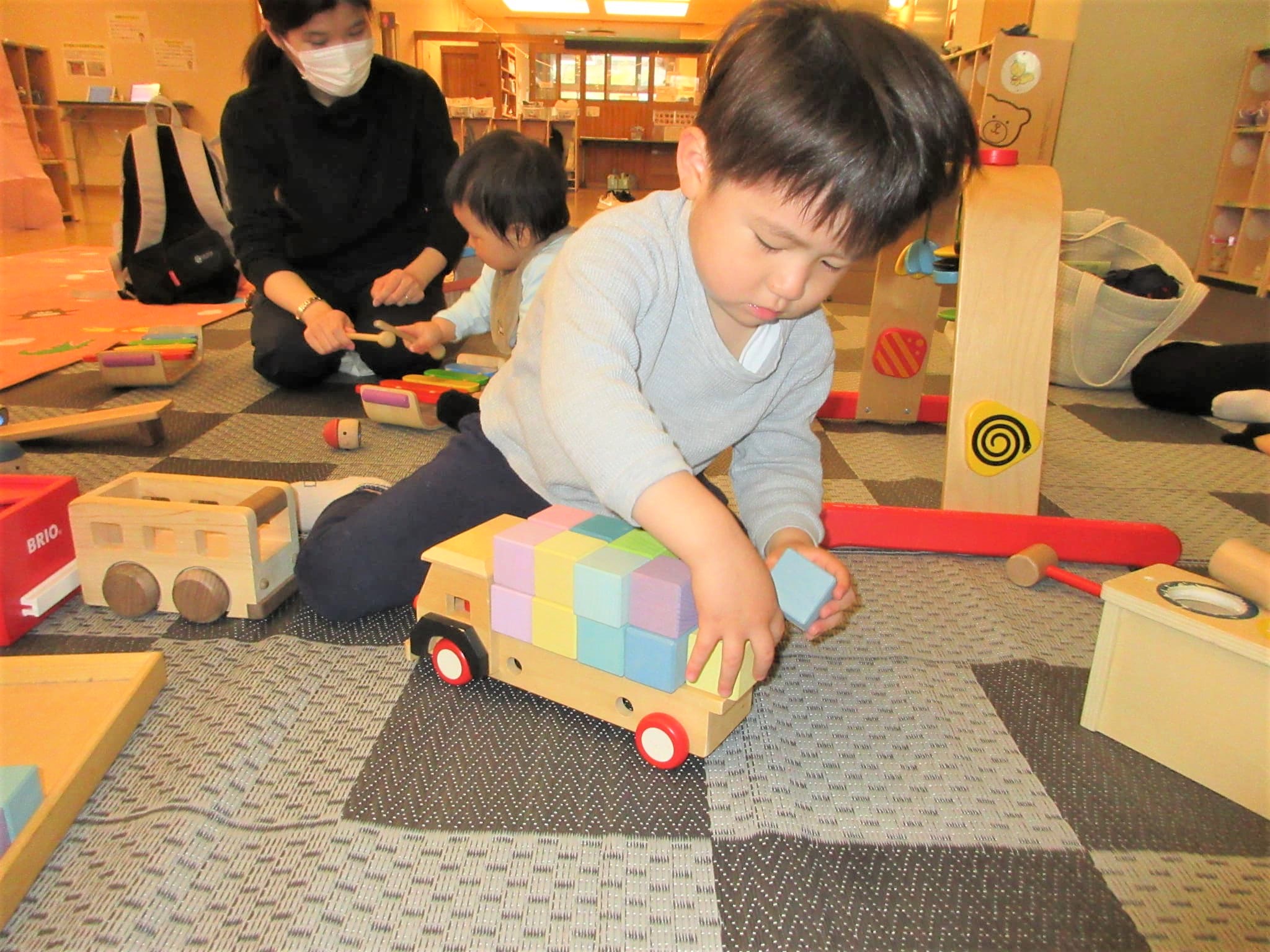トラックの荷台部分に積み木をきれいに積んでいました!