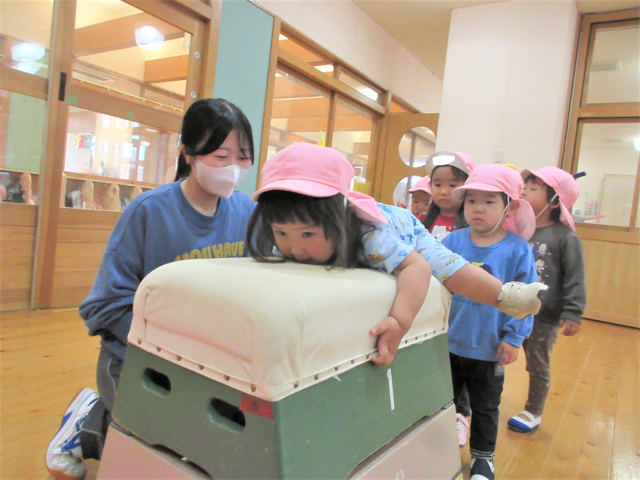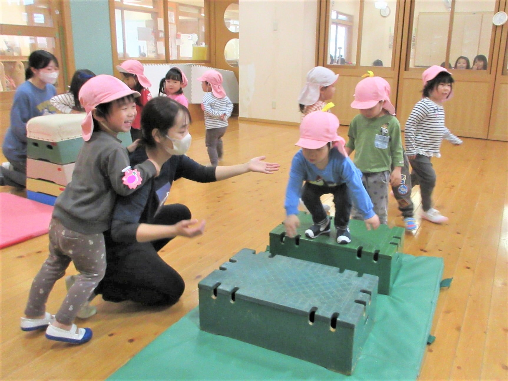 体操の先生に巧技台を置いてもらって、担任の見守りから“この通り(笑)”