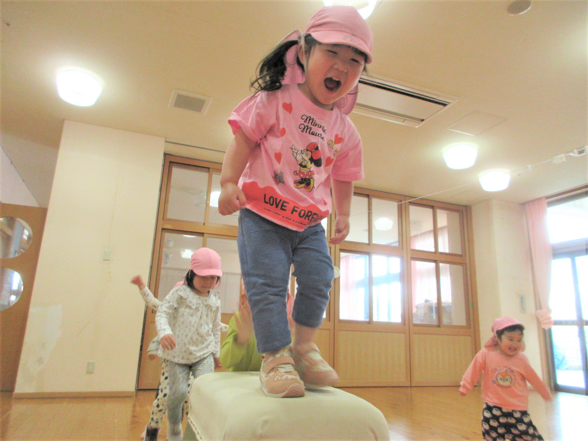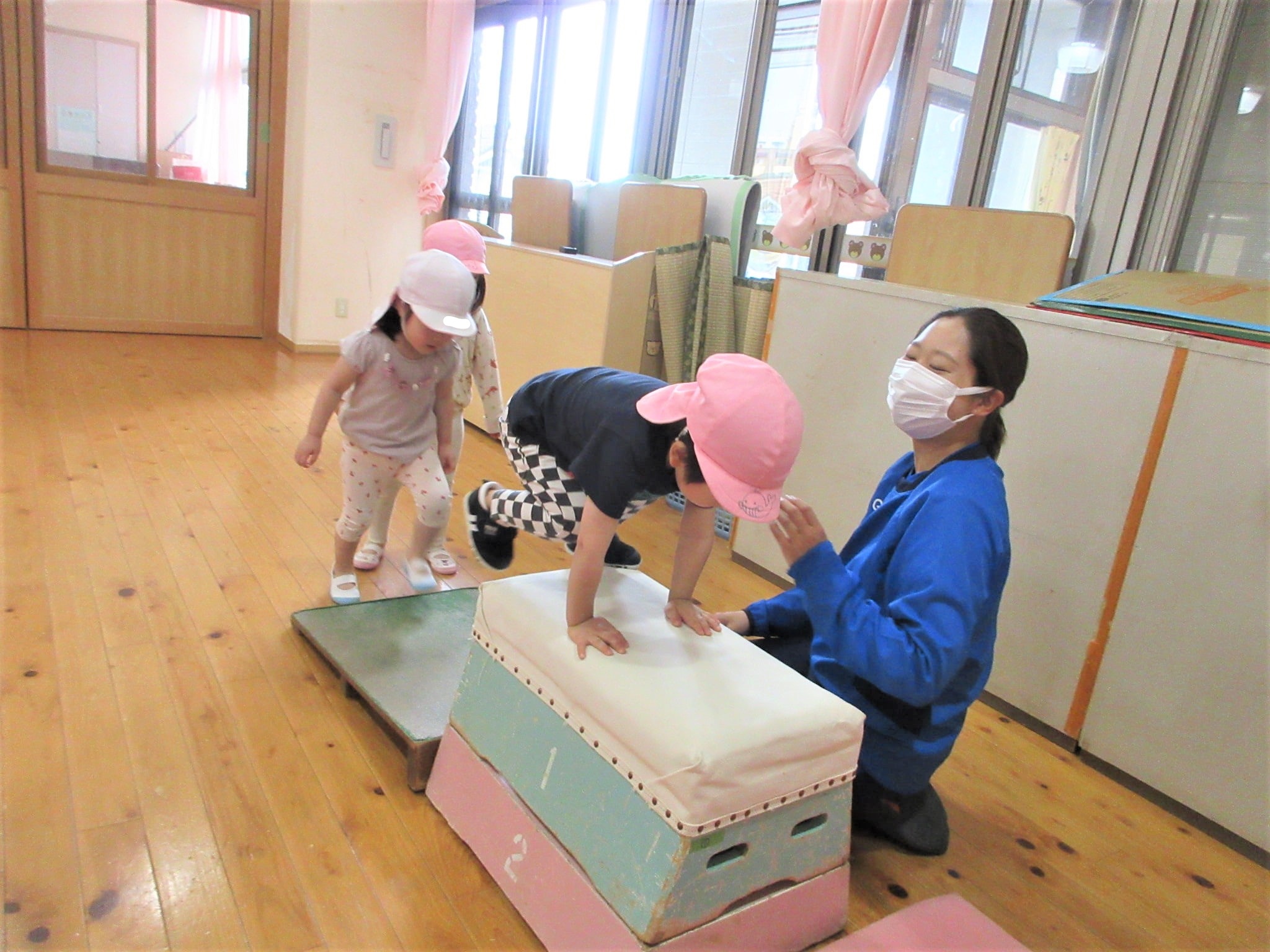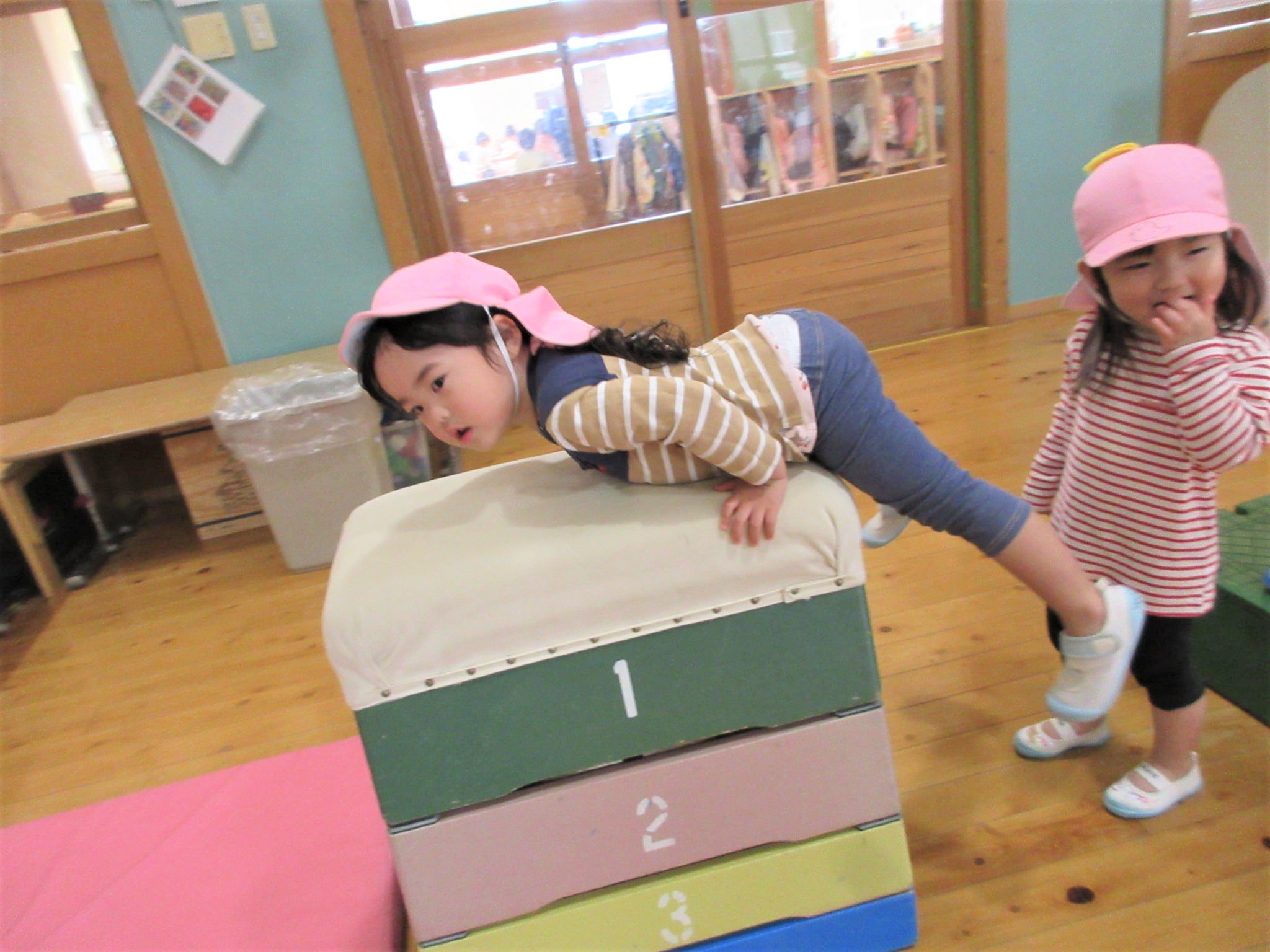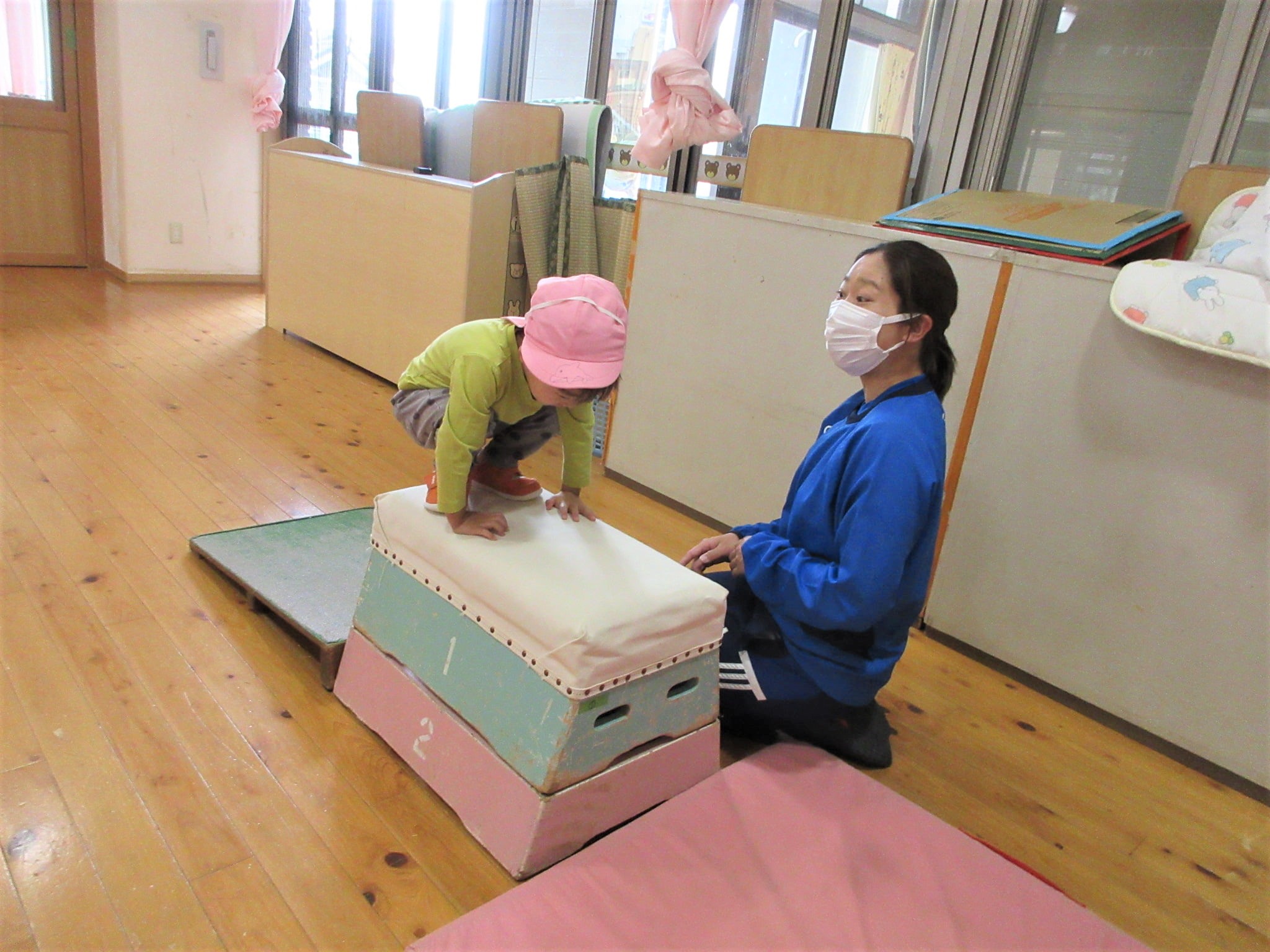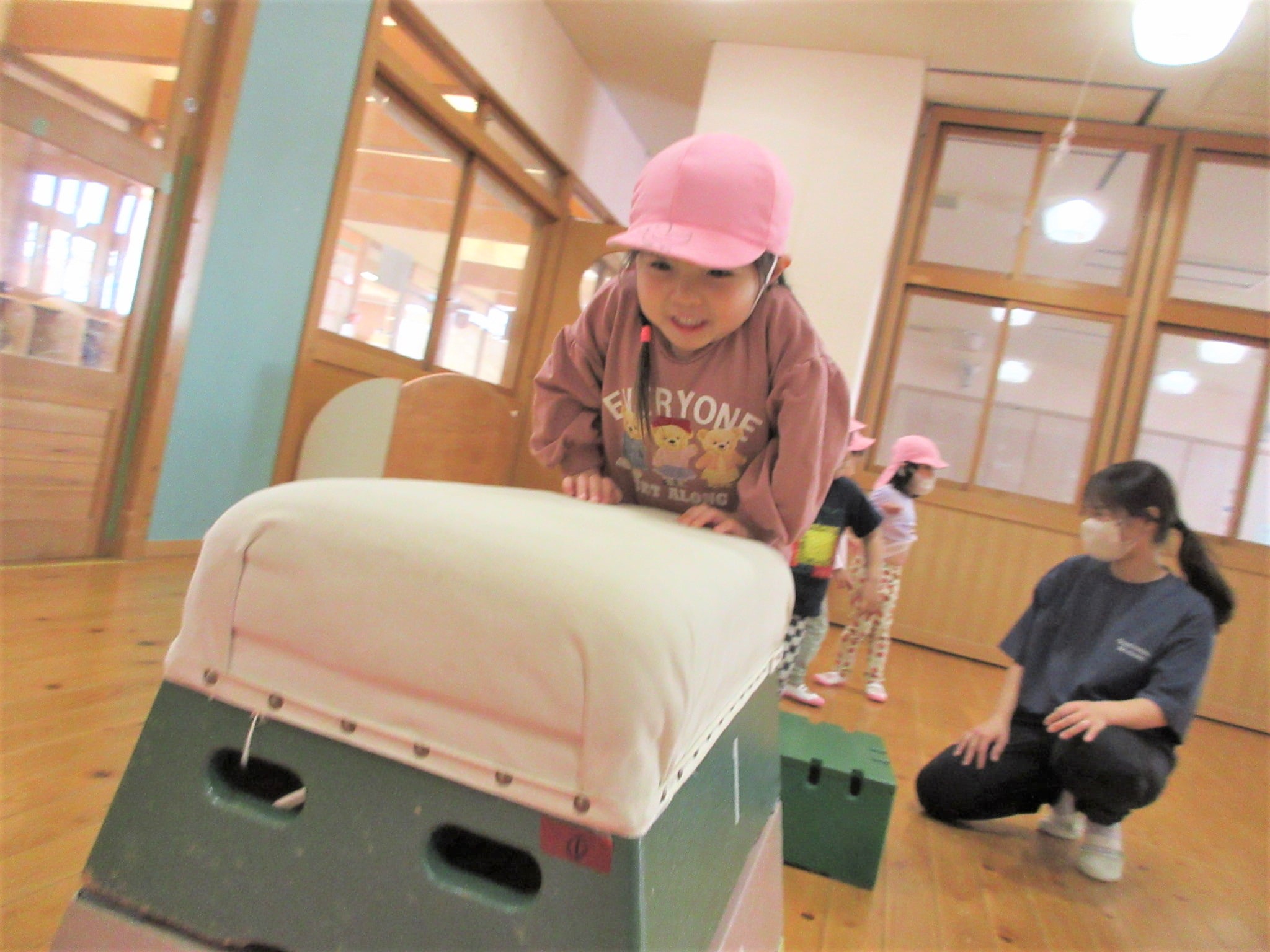 『自分で考えて自分の力』で登り、跳び箱の上に立った時に達成感あふれる笑顔がありました!