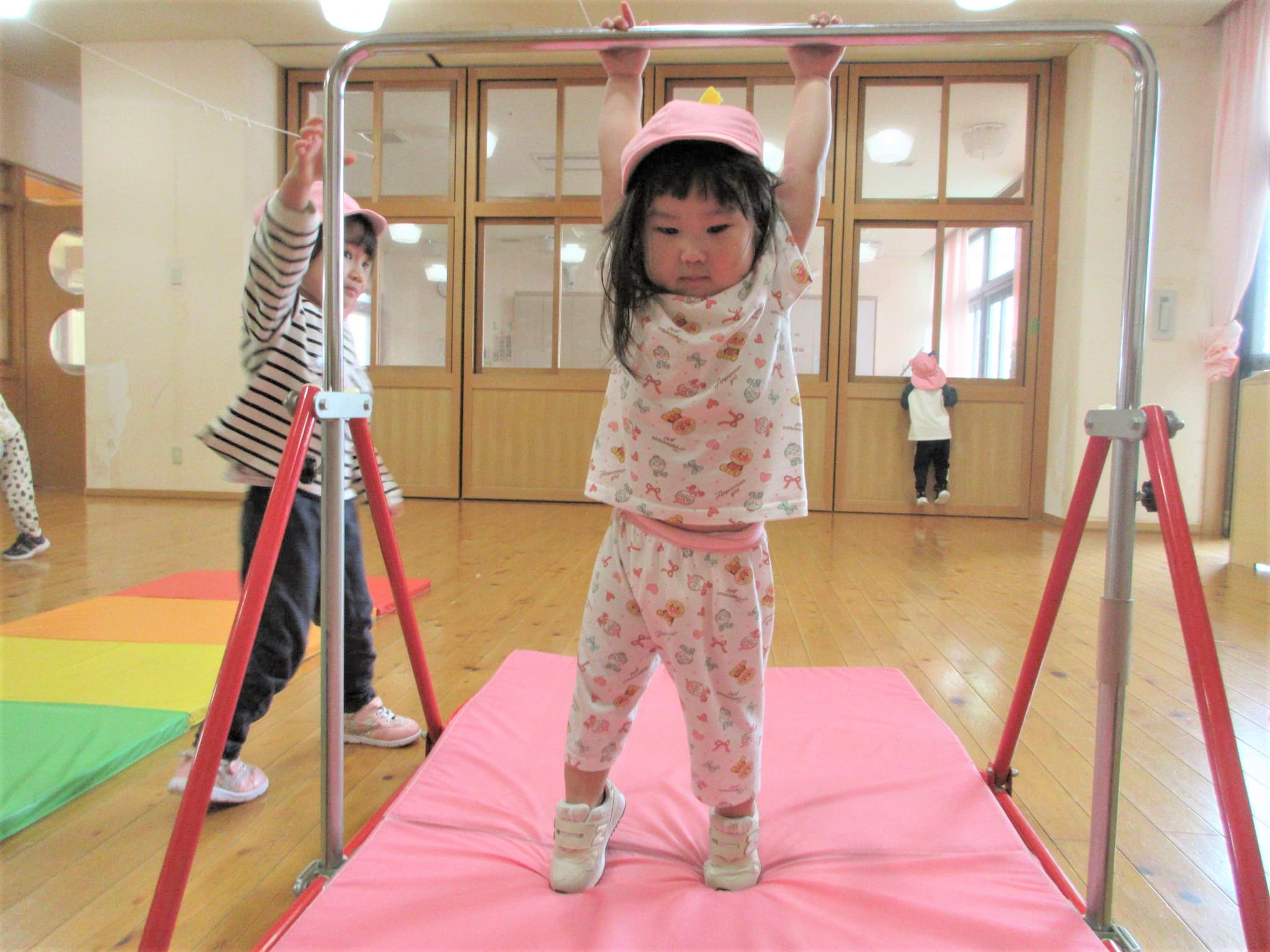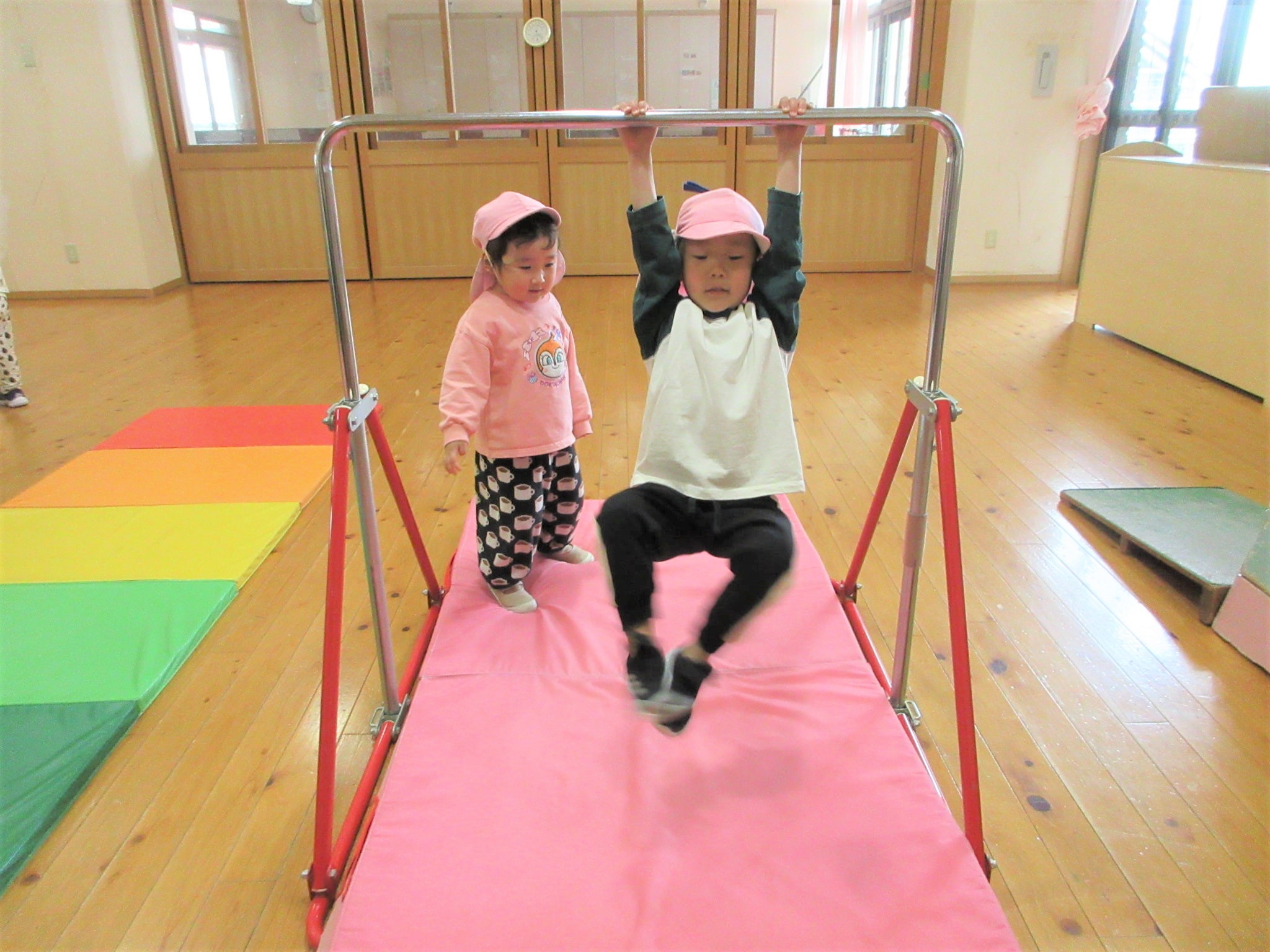 跳び箱の持ち手の所に足を掛けて腕の力で登ったり