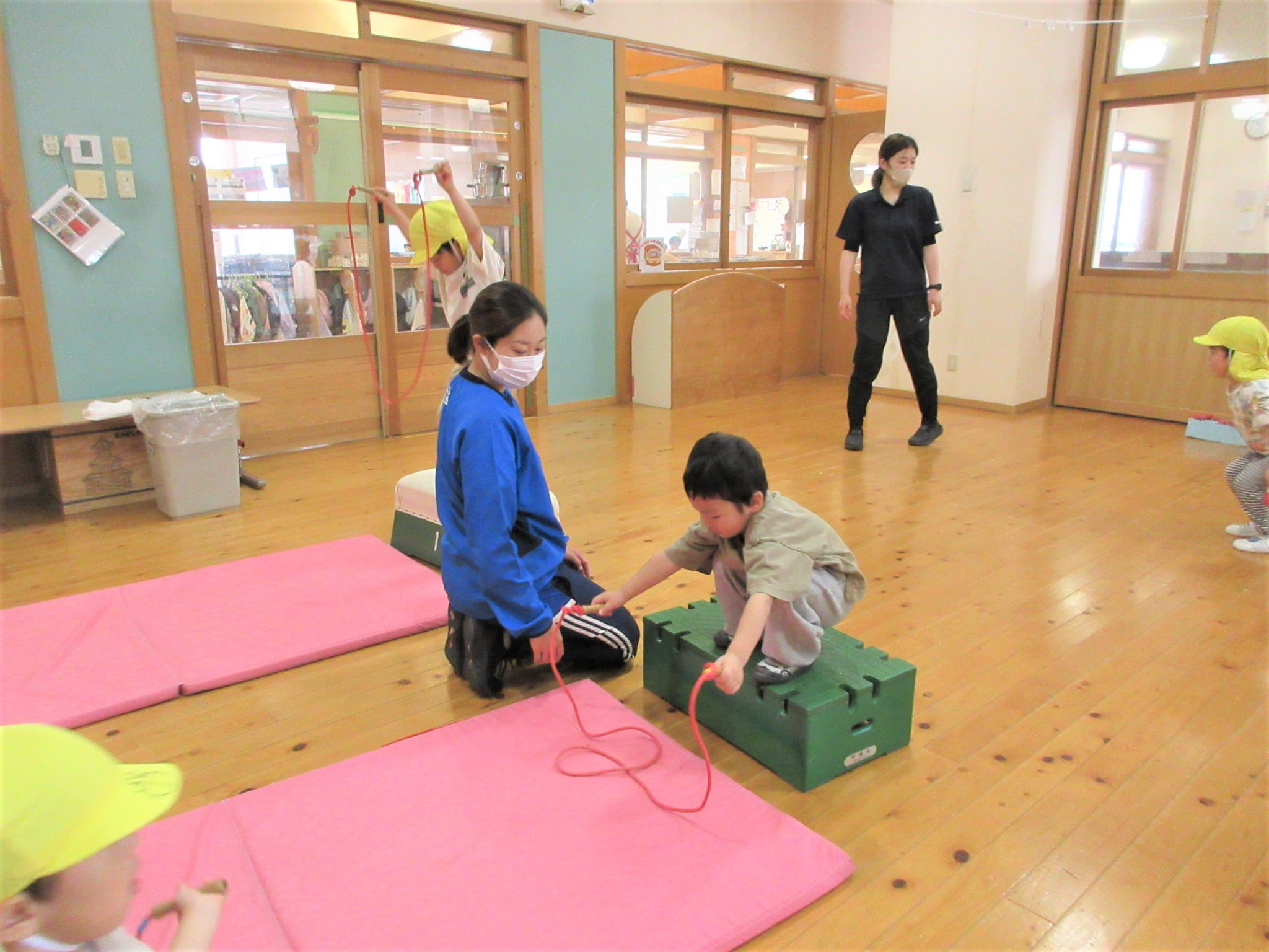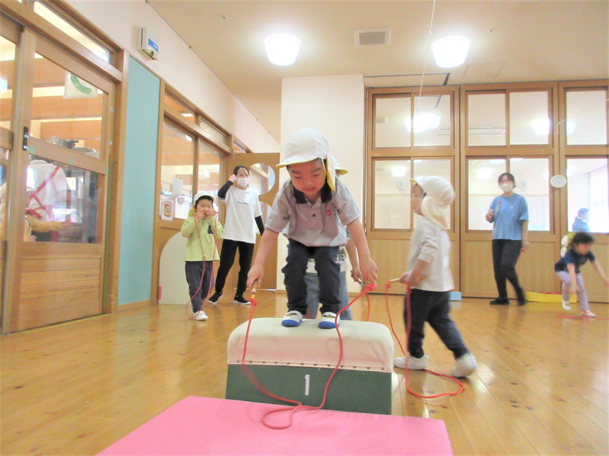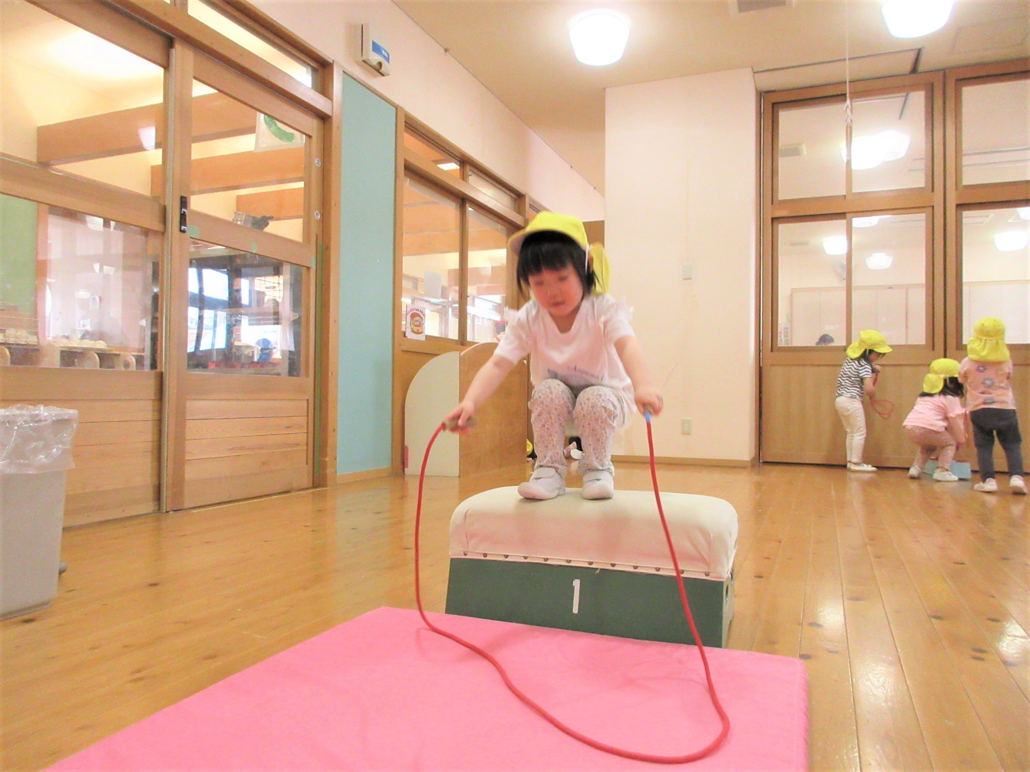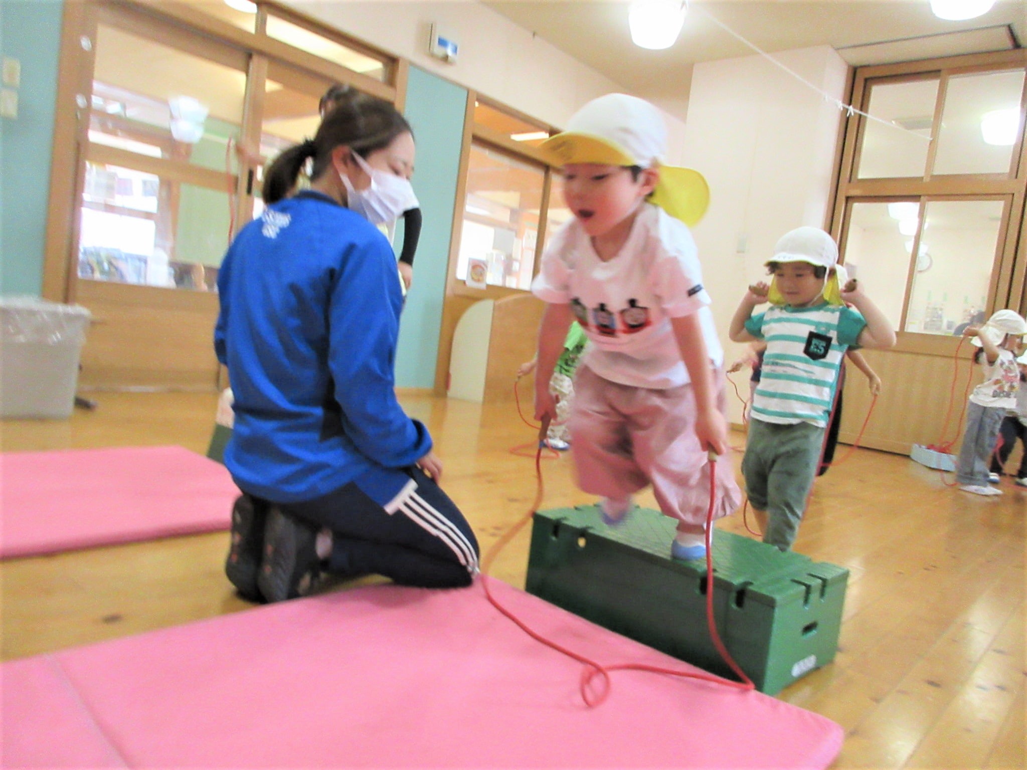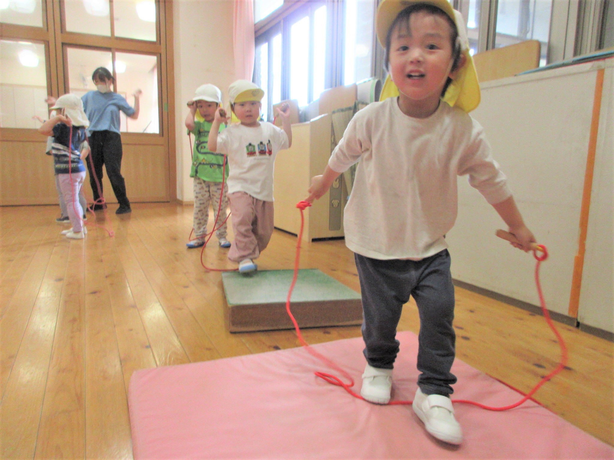 まず、ジャンプをする場所(縄跳びが前に来た時)を体操の先生に具体的に教えてもらい・・・
