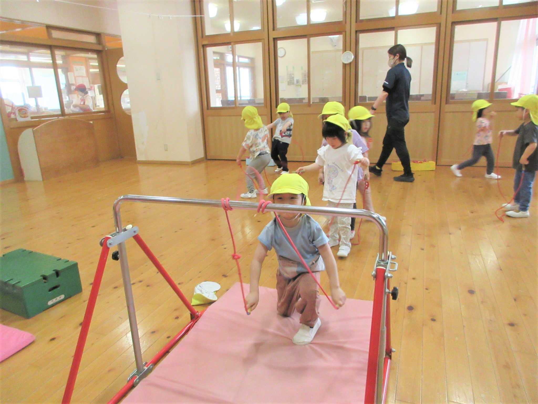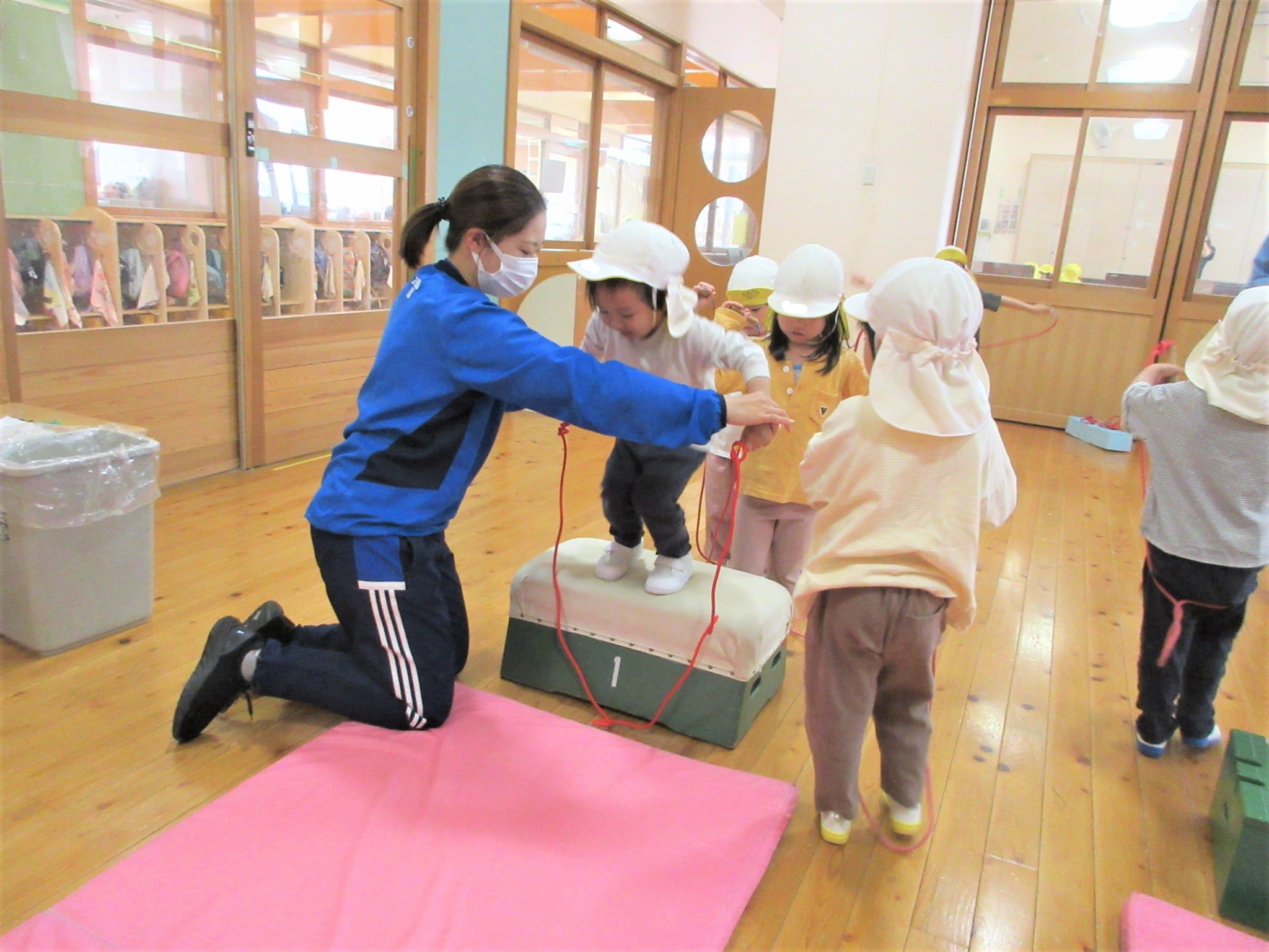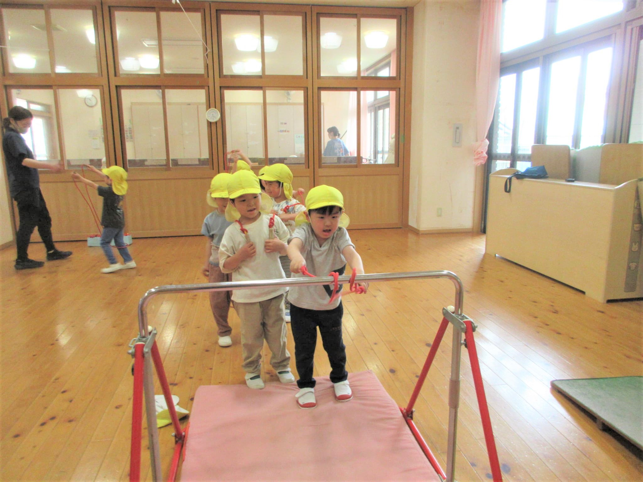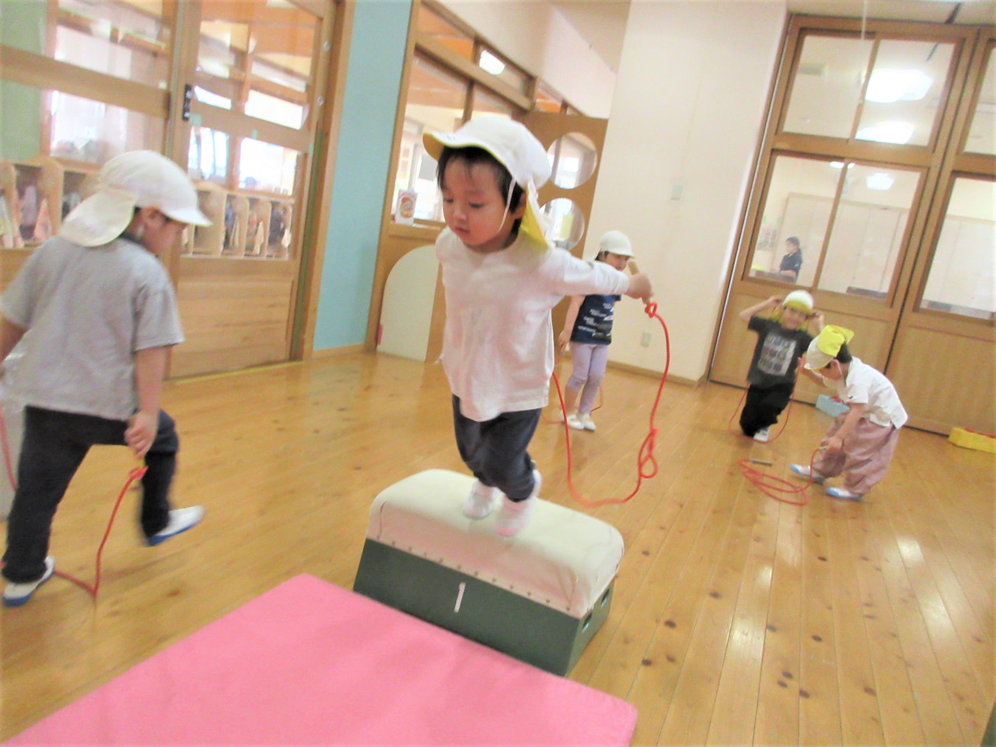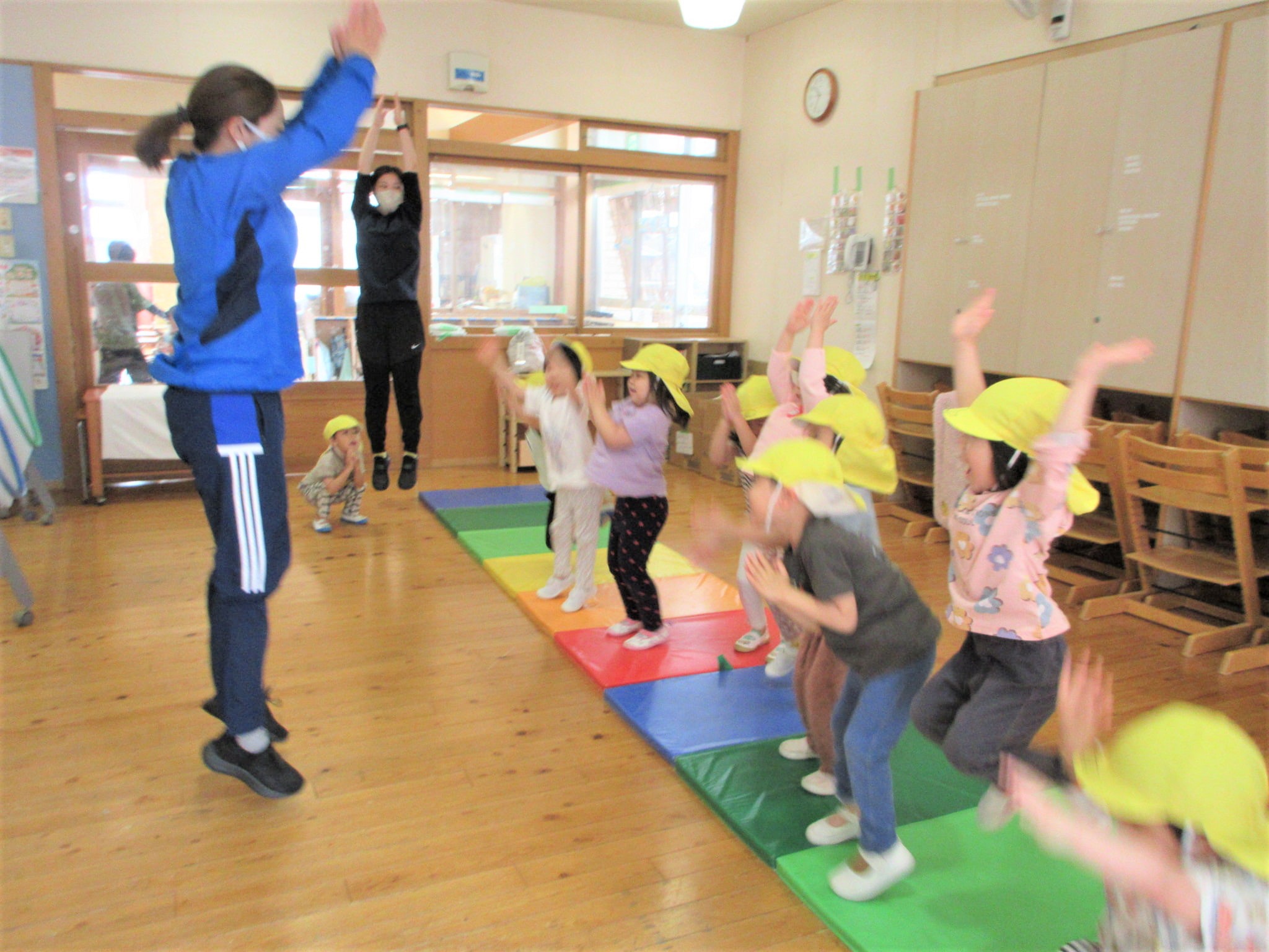 まず、ジャンプをする場所(縄跳びが前に来た時)を体操の先生に具体的に教えてもらい・・・