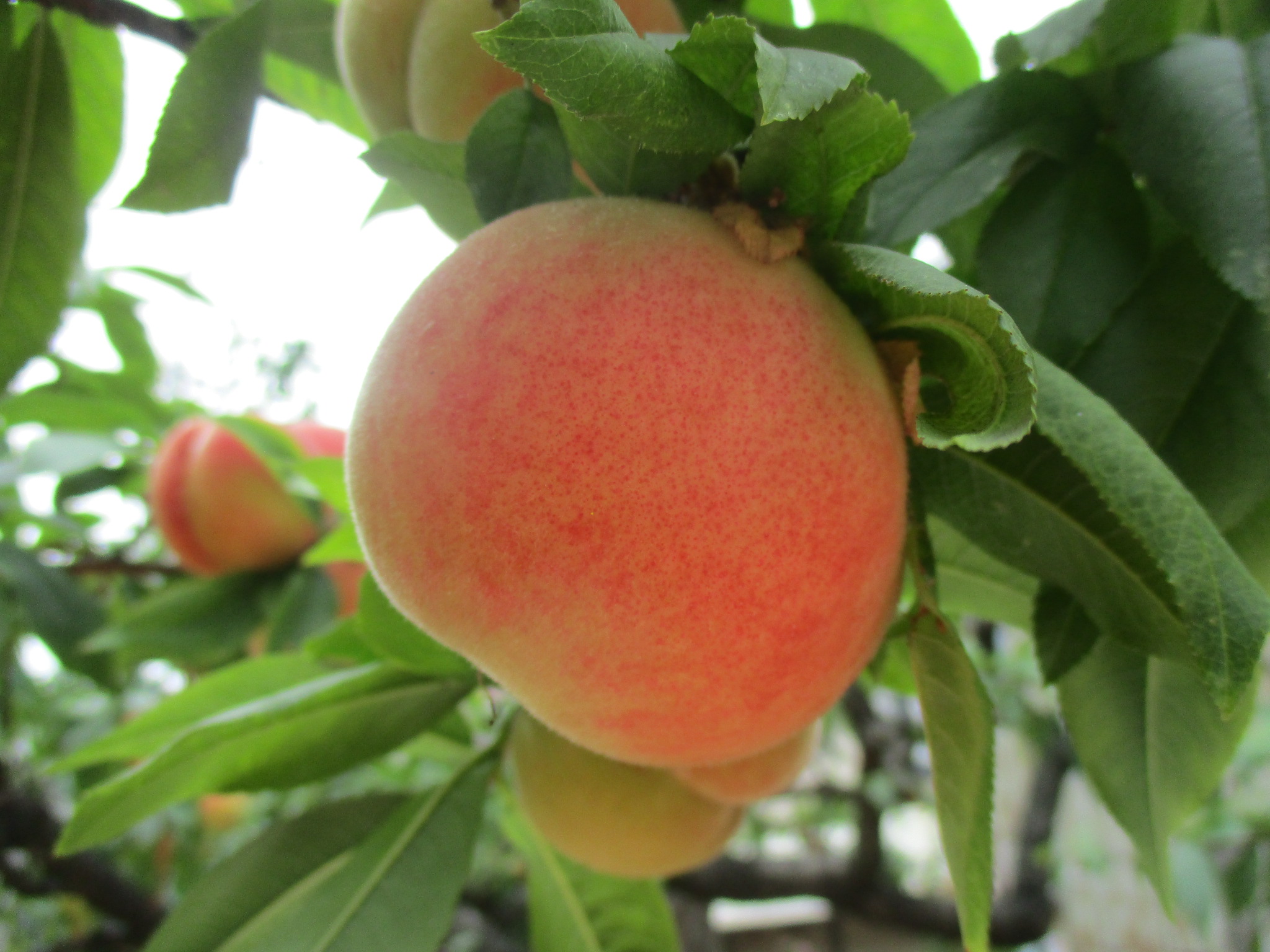 「もも なってる~!」と 桃の木を見上げている子どもたち。