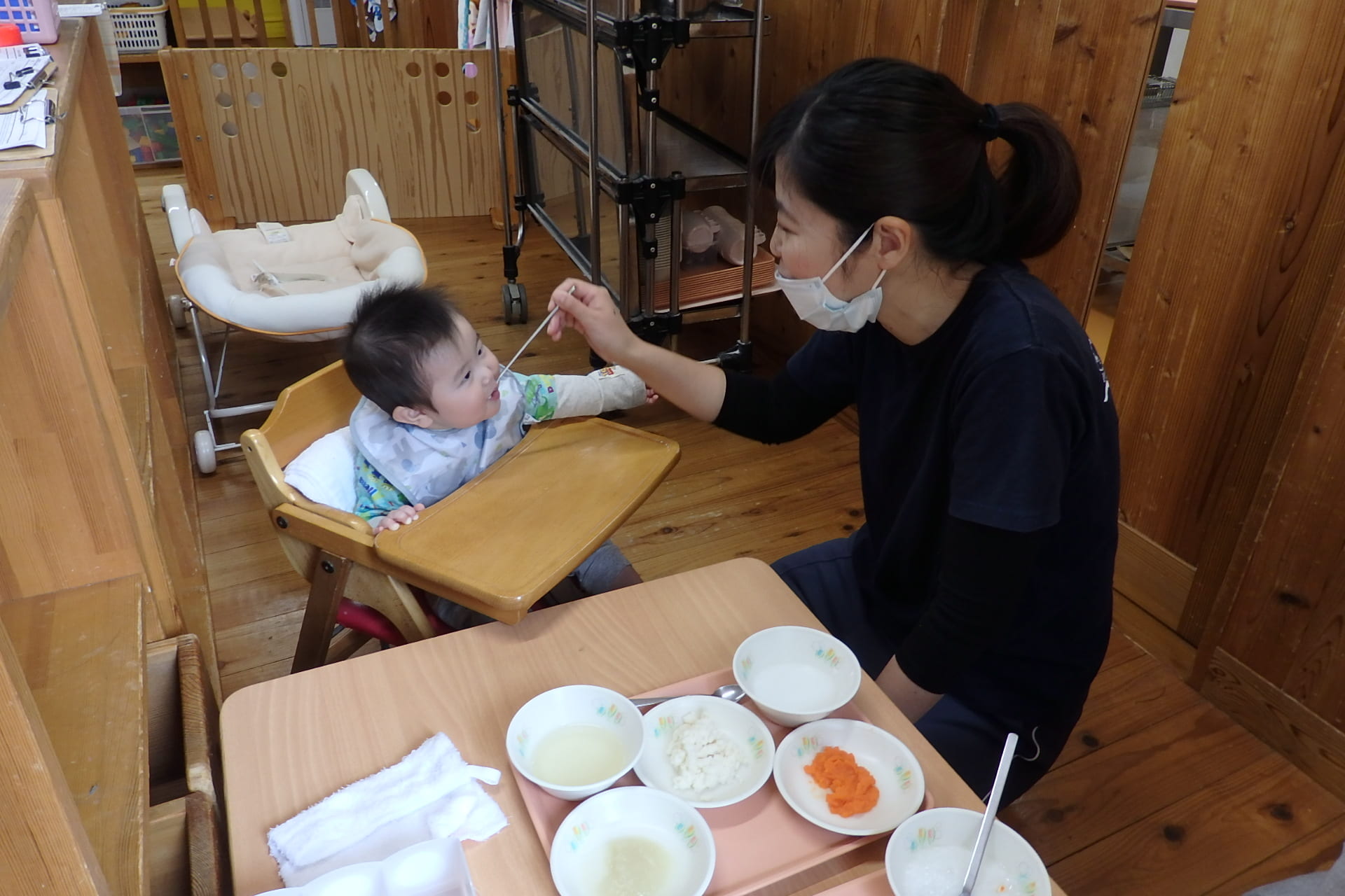 園生活では、初めて離乳食を食べる子どもたち!