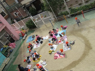 「はっぱみつけたよ~」とお友達と拾い集めました。