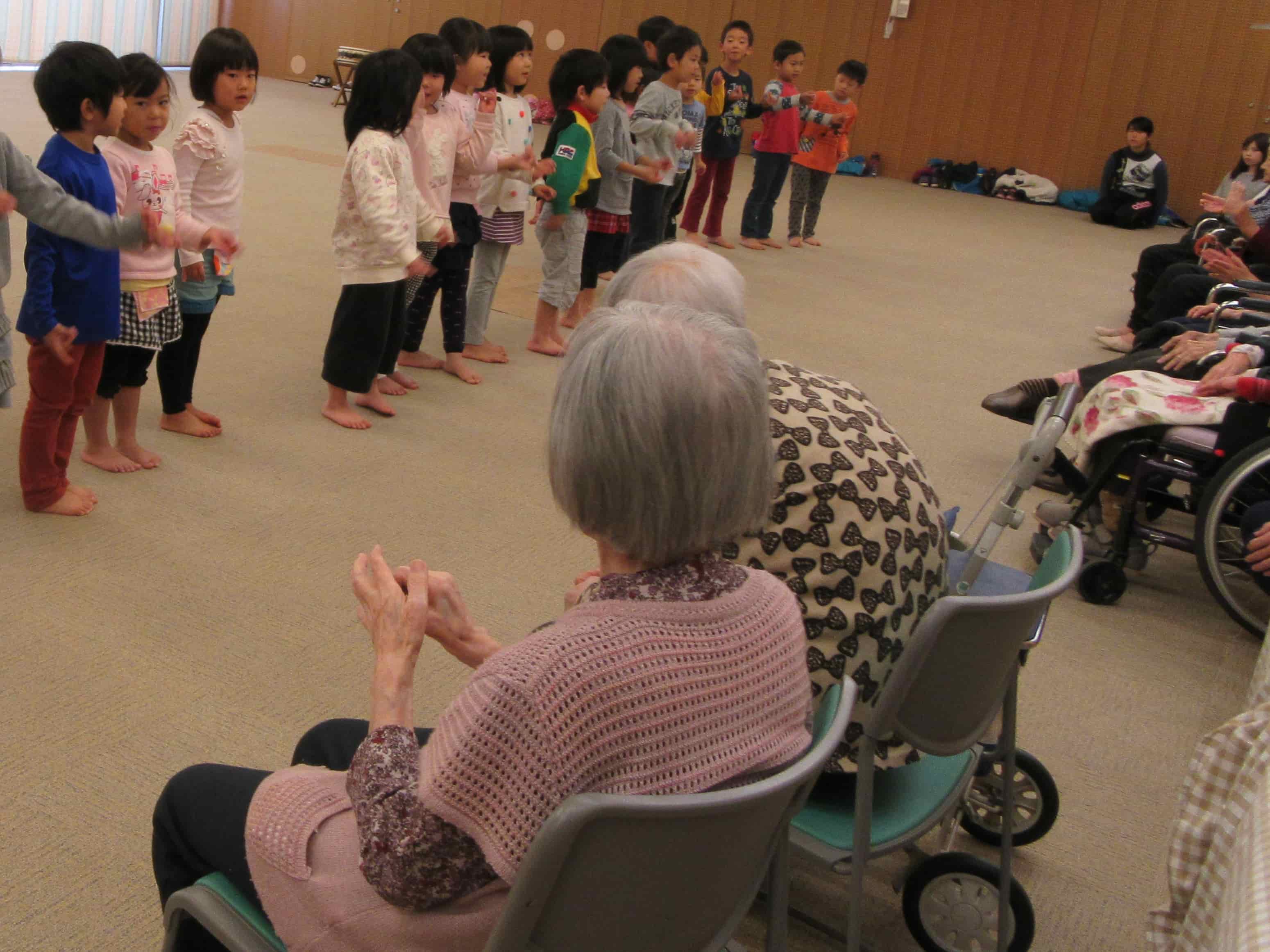 踊りの後は、園で楽しんでいる手遊びを一緒にしたり、もちつきの歌を