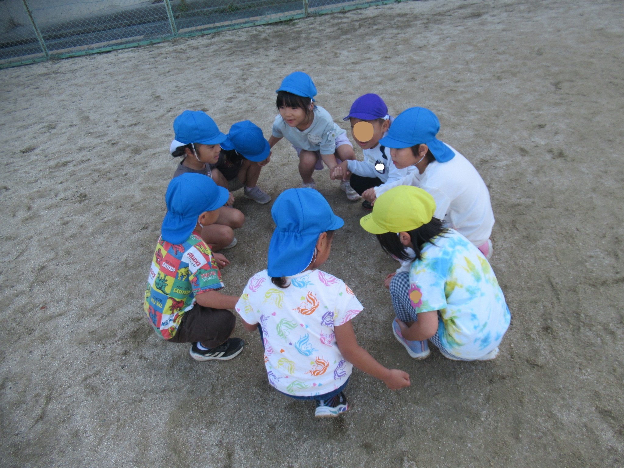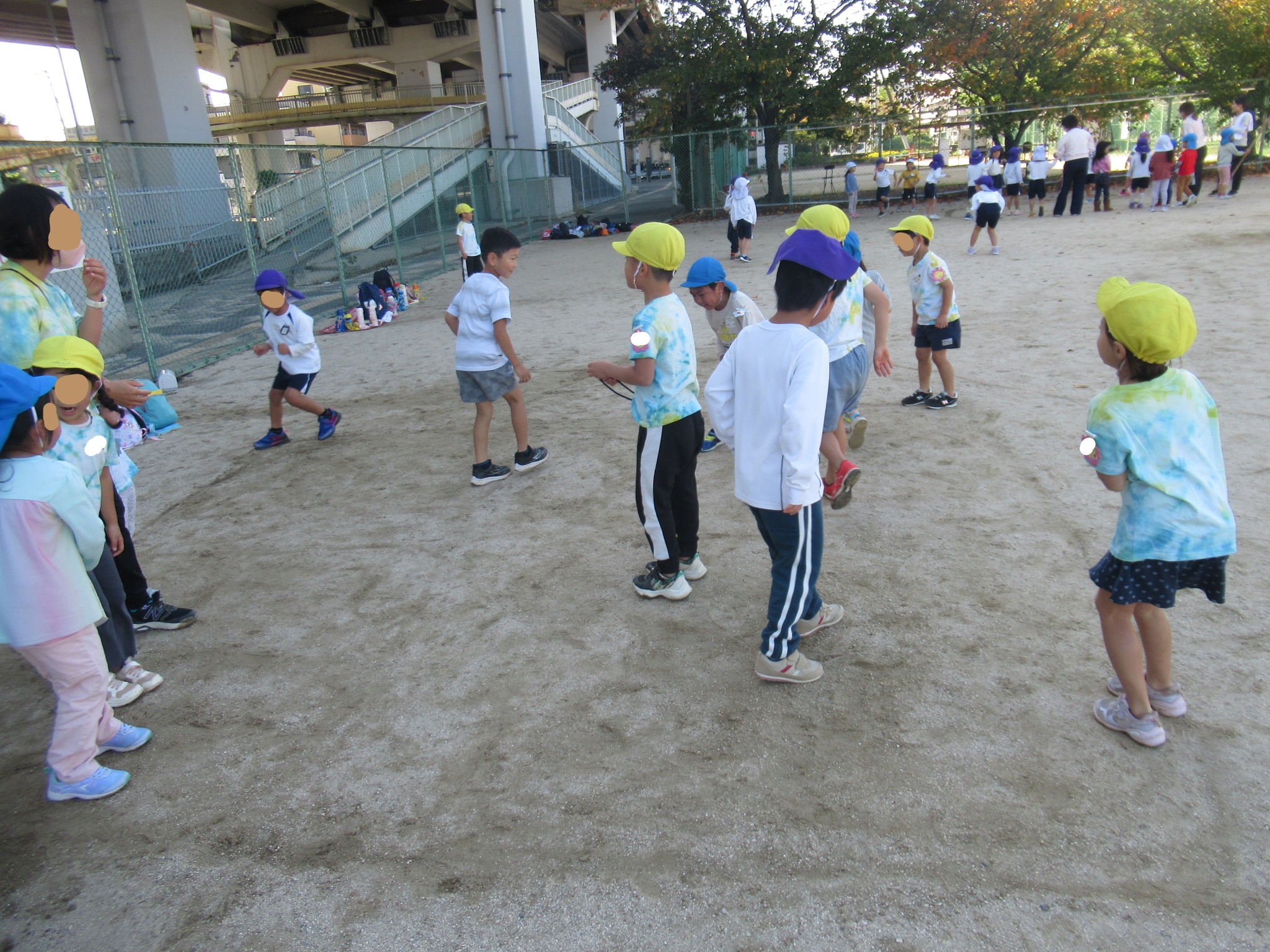 各グループ花いちもんめ、バナナ鬼、氷鬼、ケードロ、四角オニ、へびじゃんけん、ひまわりオニをしているうちに楽しくなって、なごんでいきました♬