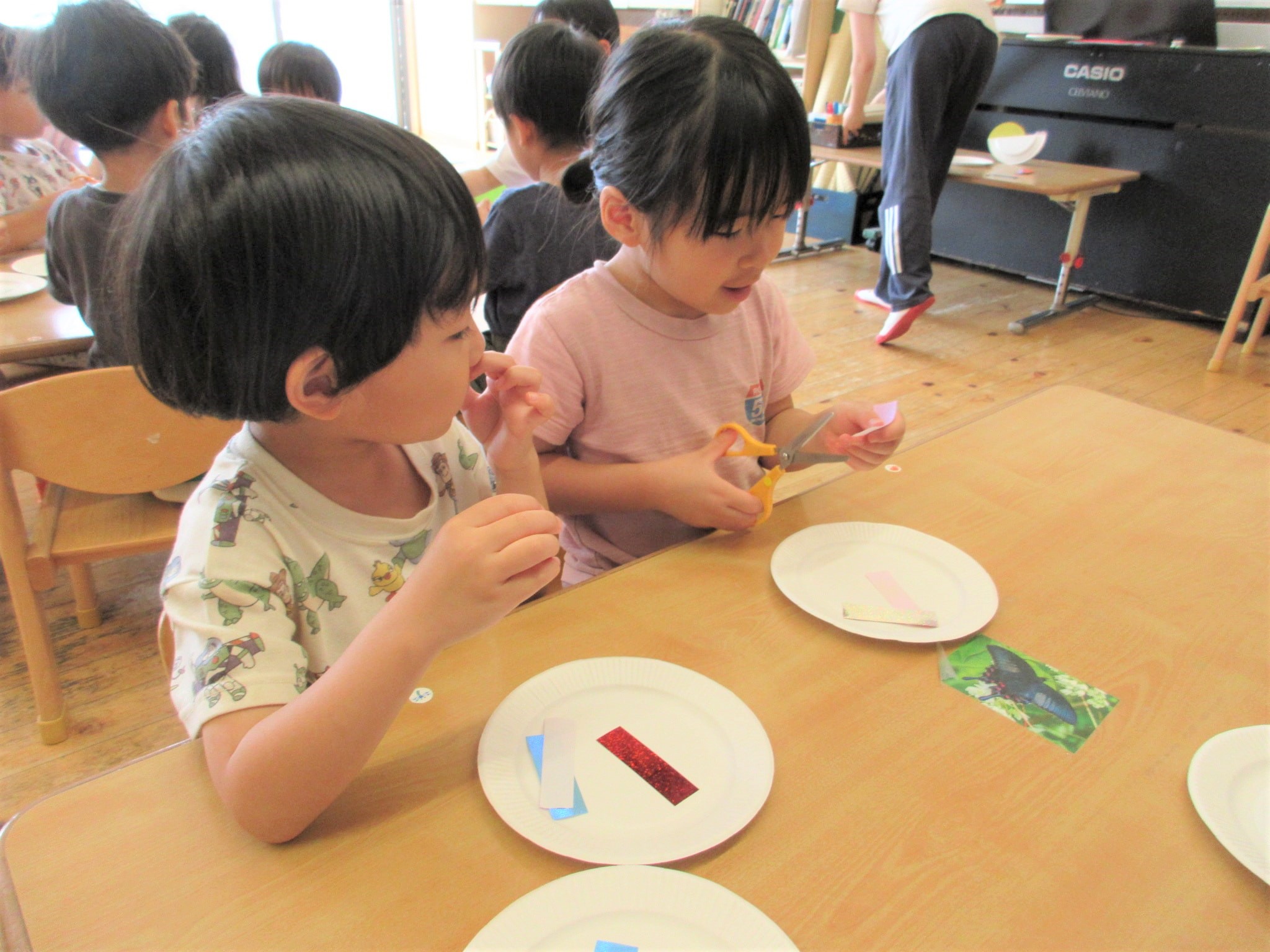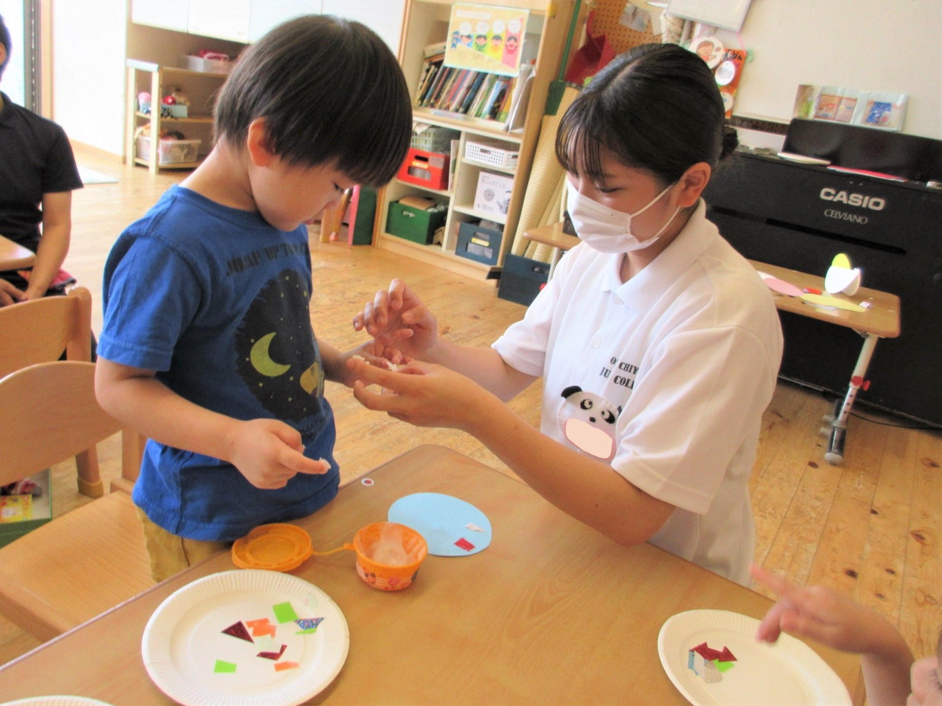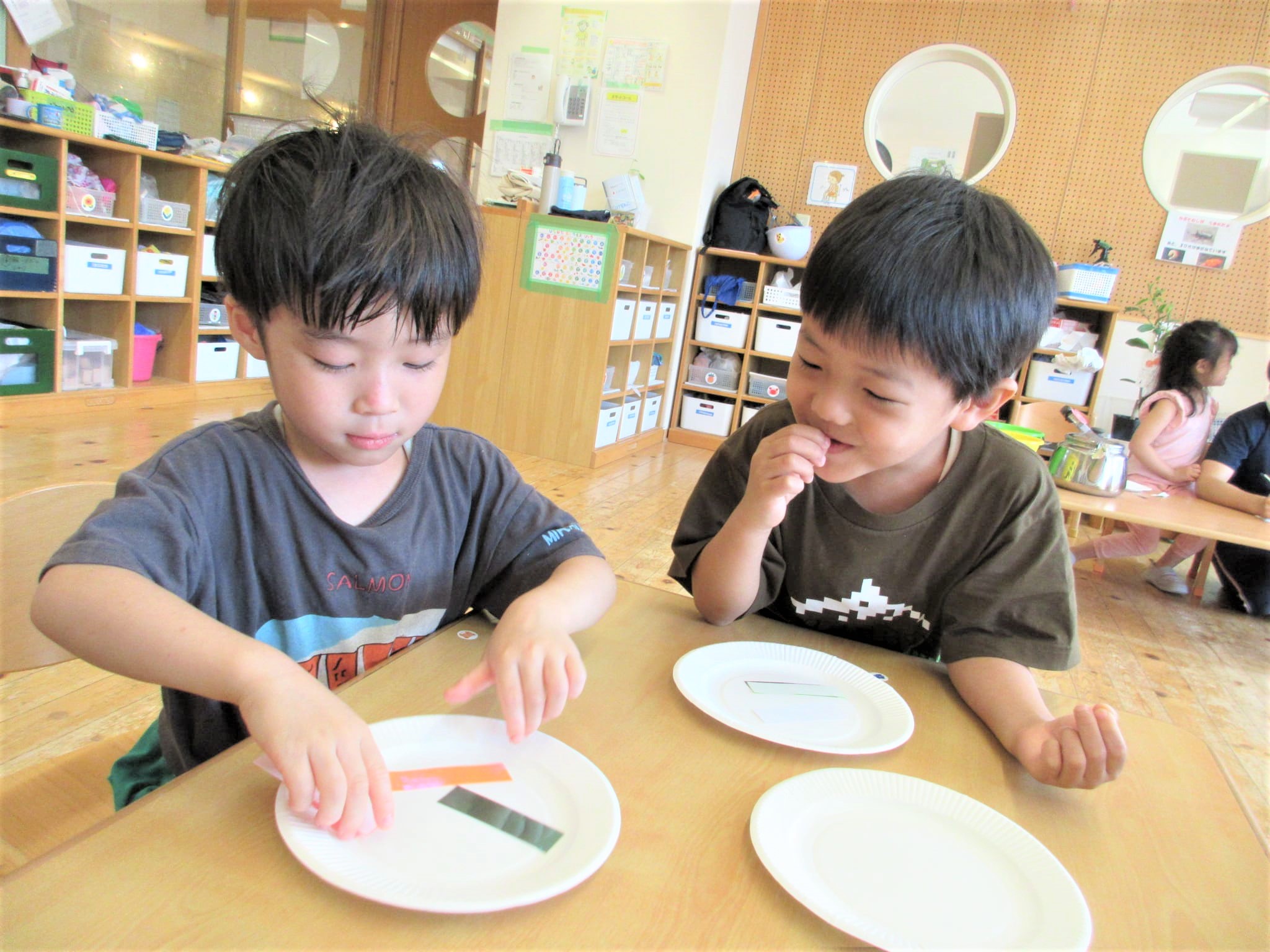 この時、実習生は、色はもちろんのこと…キラキラした折り紙の感触(ざらざら感)を伝えていました