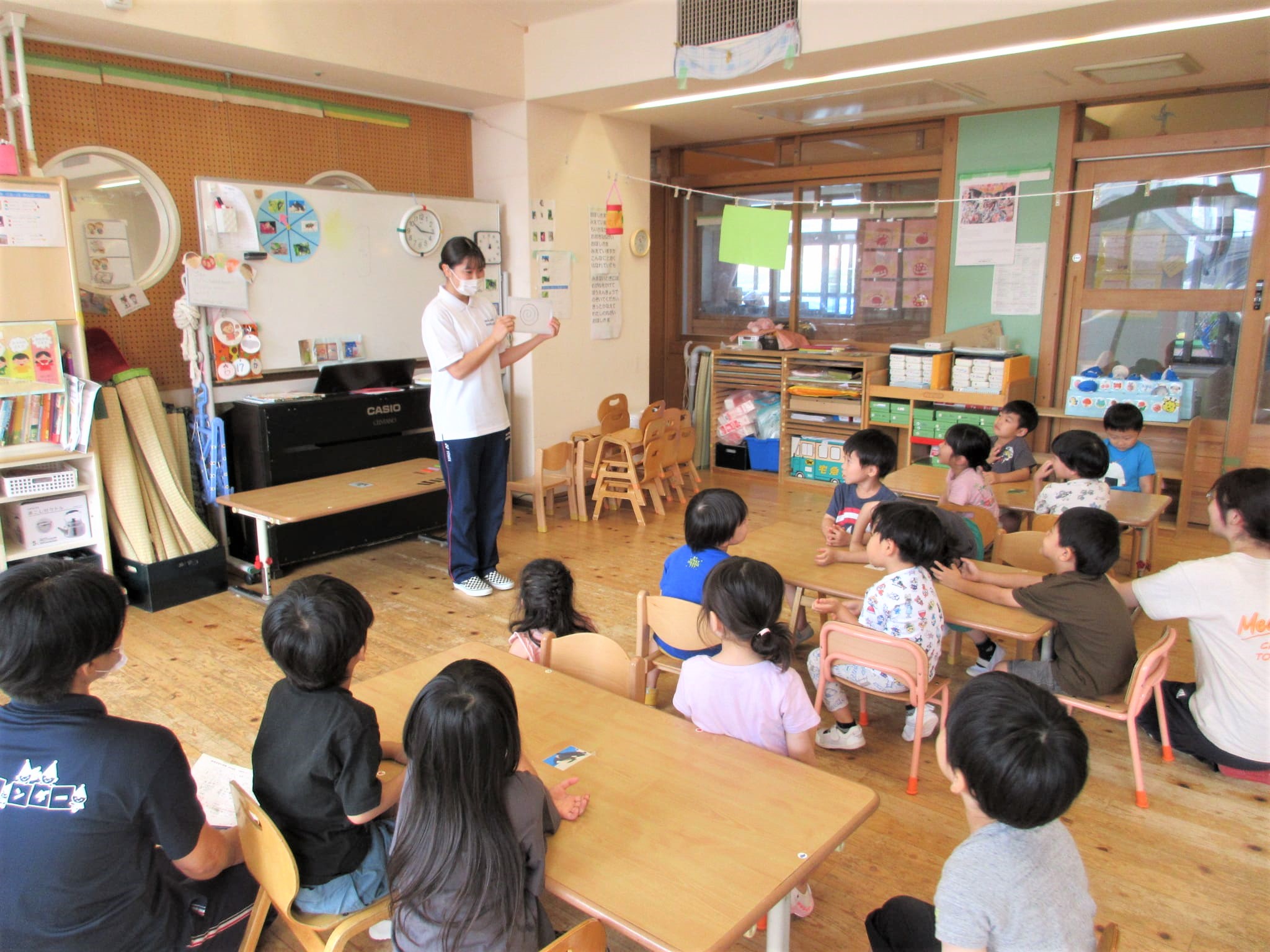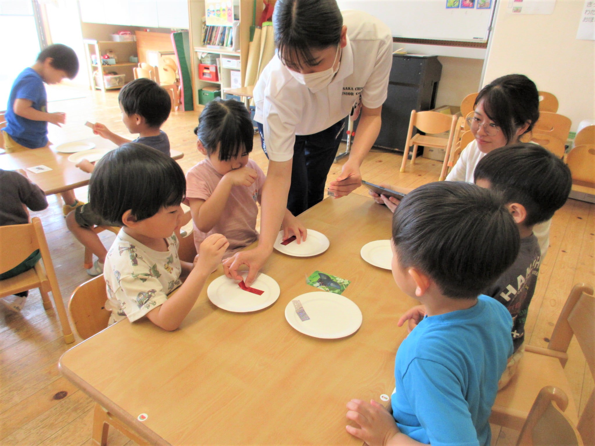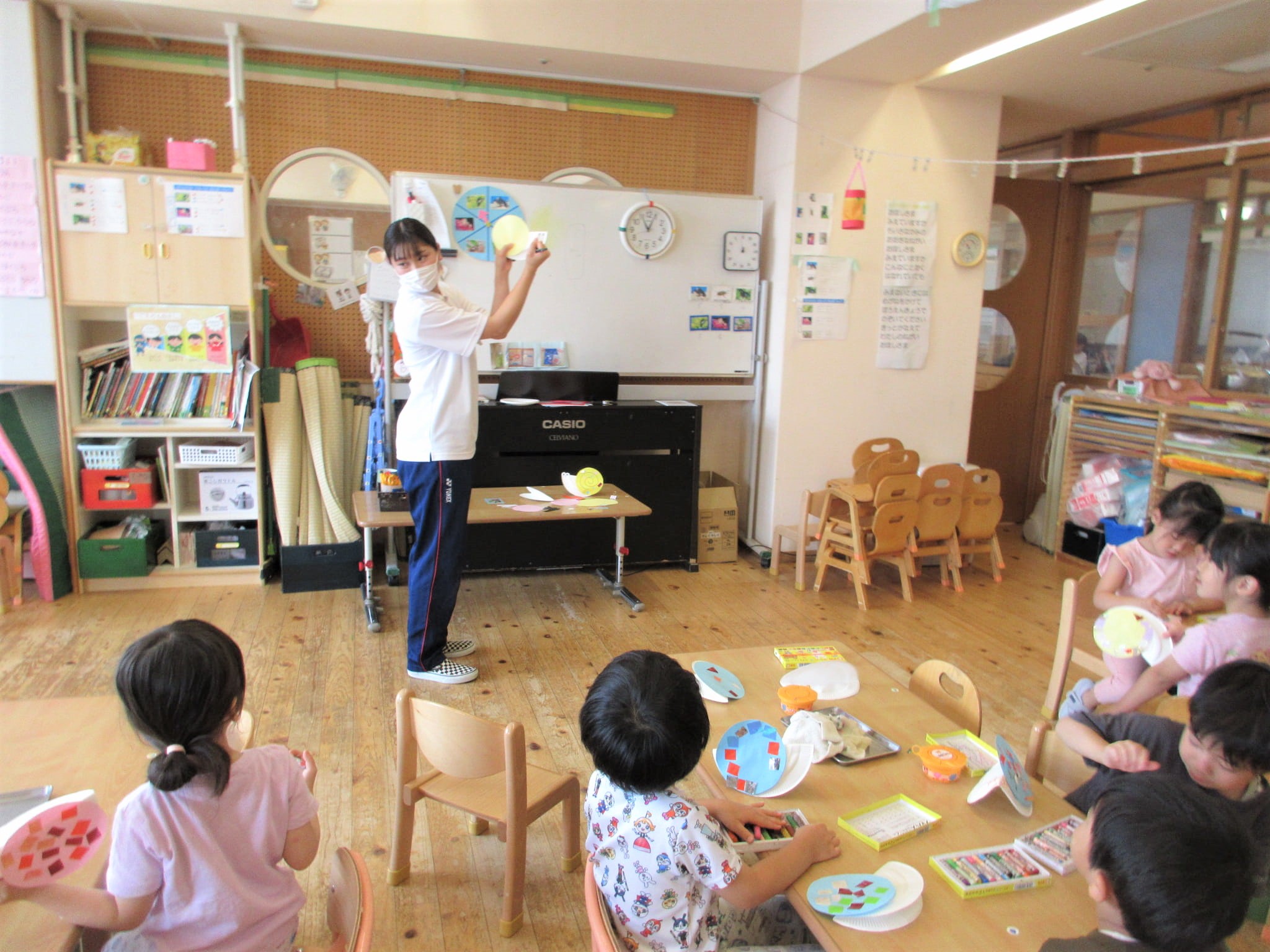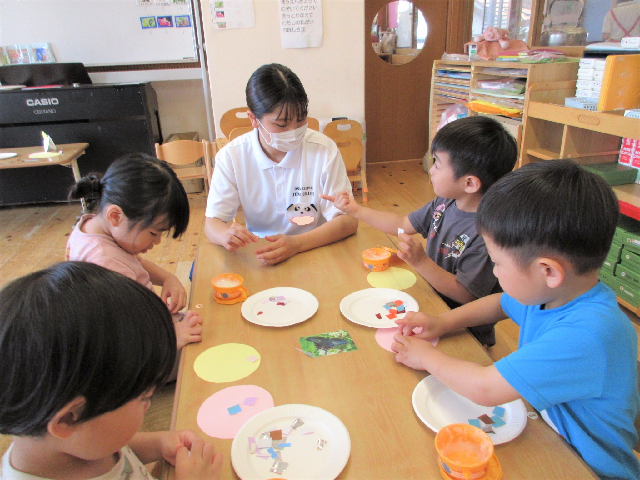 この時、実習生は、色はもちろんのこと…キラキラした折り紙の感触(ざらざら感)を伝えていました
