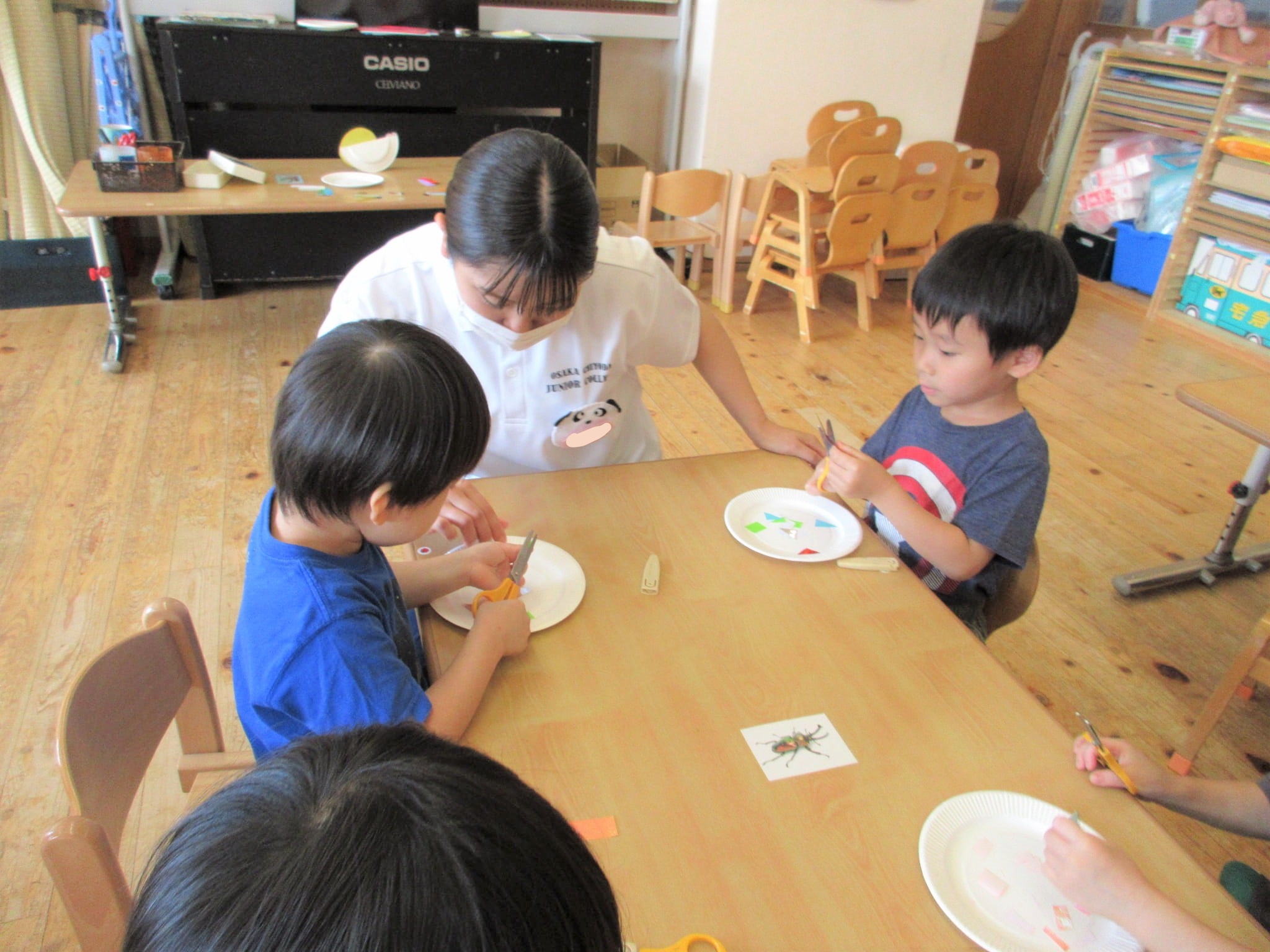 はさみで切った紙を糊で貼り、かたつむりの身体に“殻”を貼って・・・