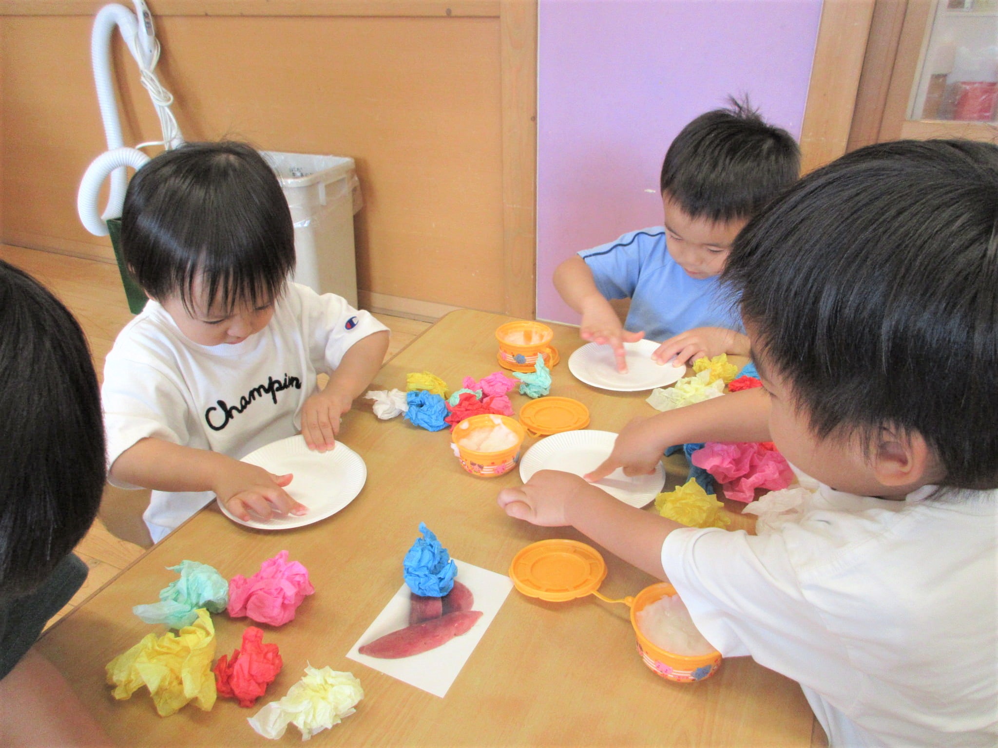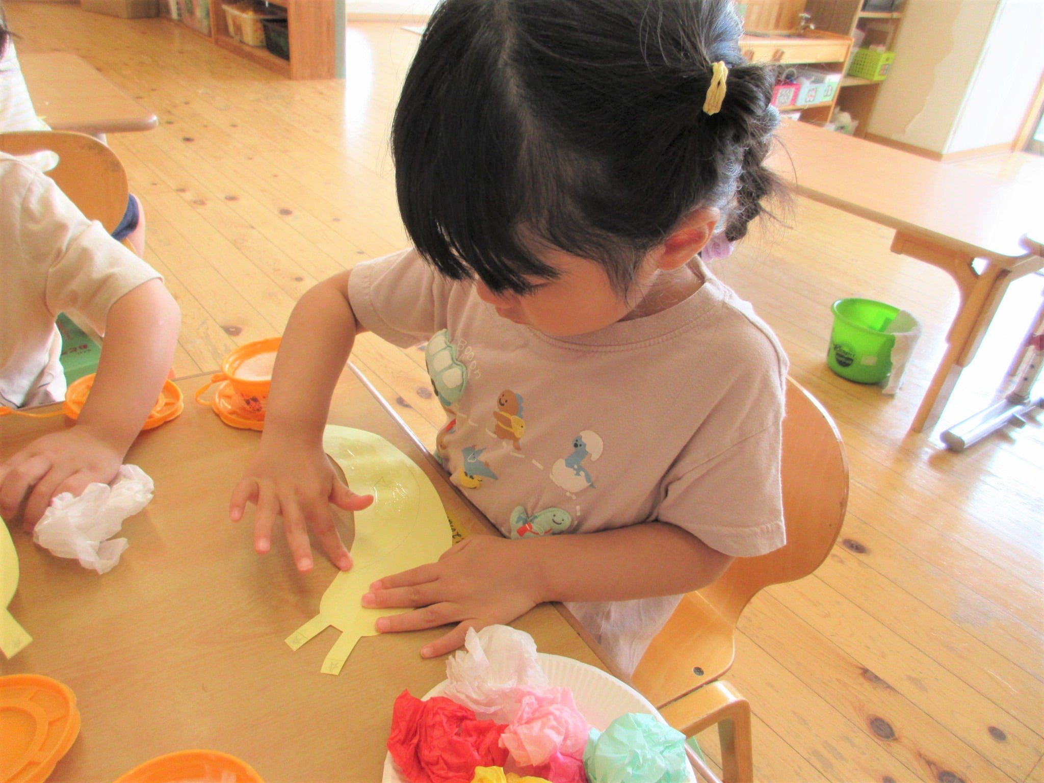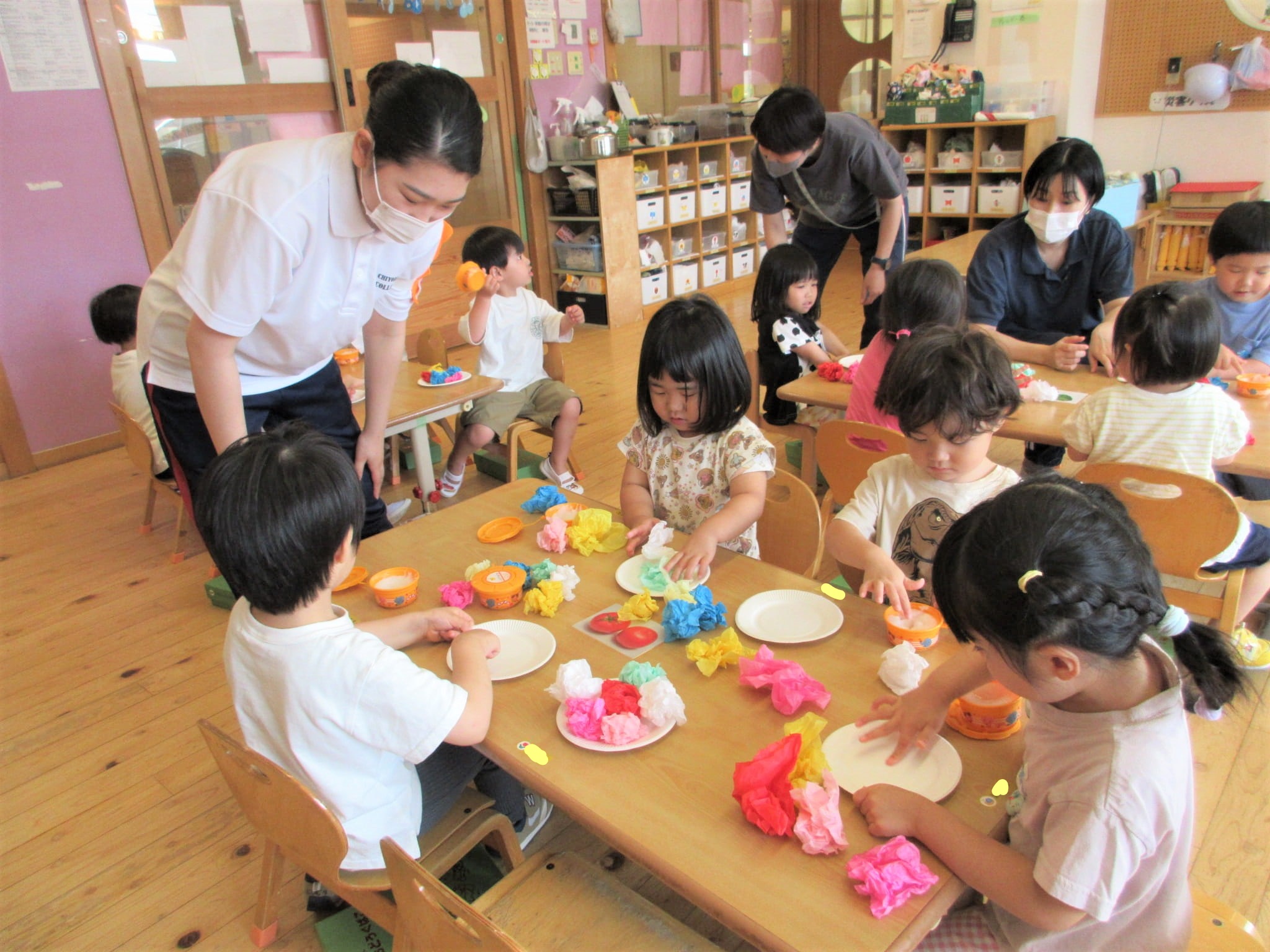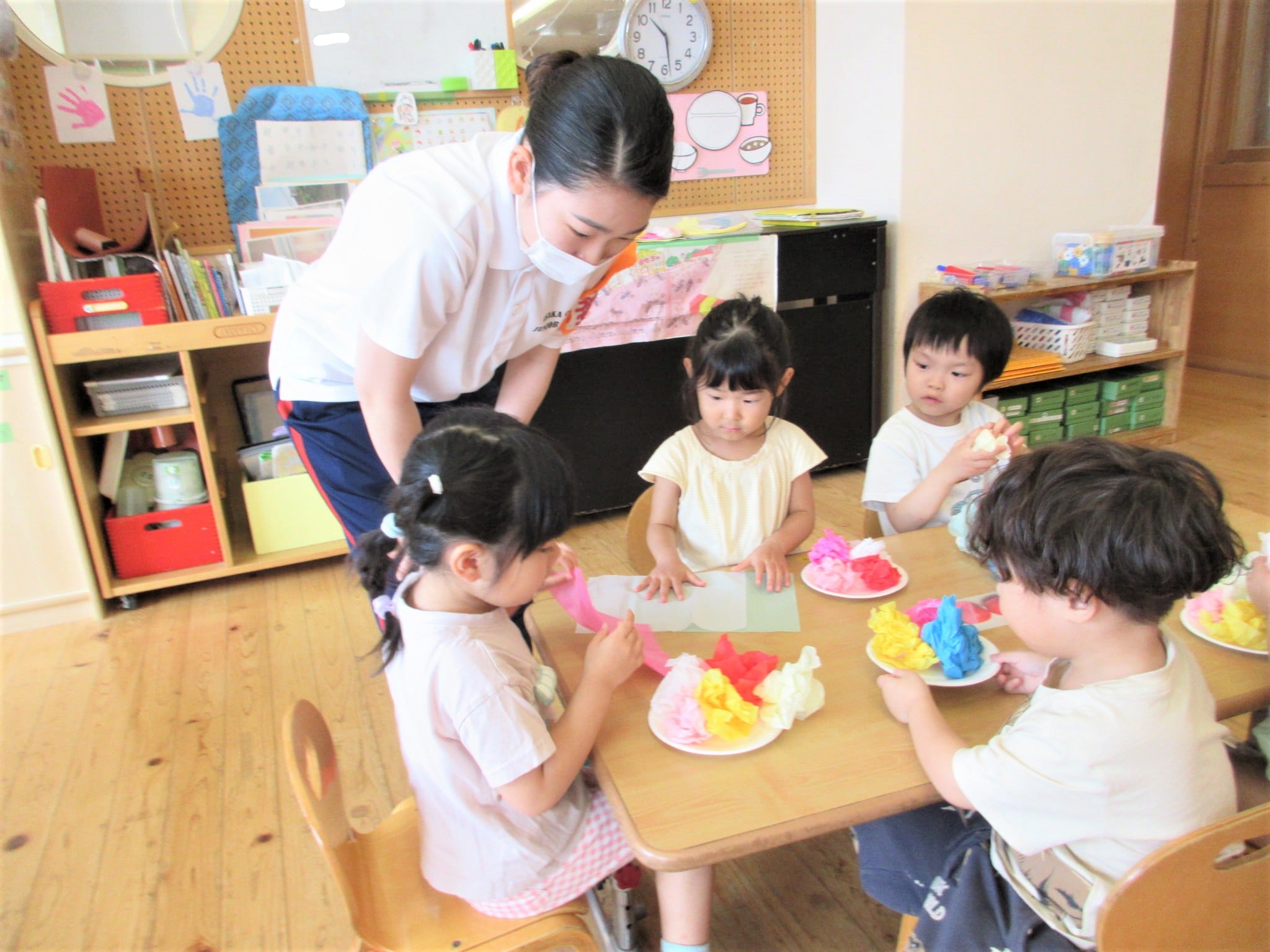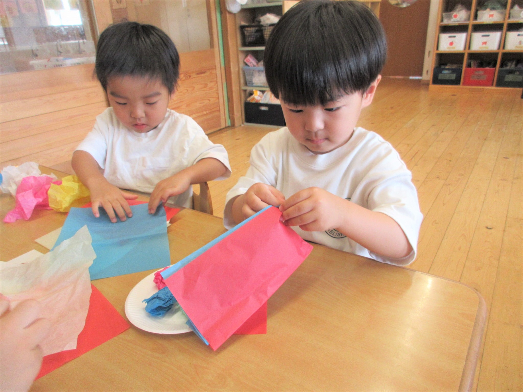 子どもたちなりに、いろいろ考えながら花紙を丸めていました♪
