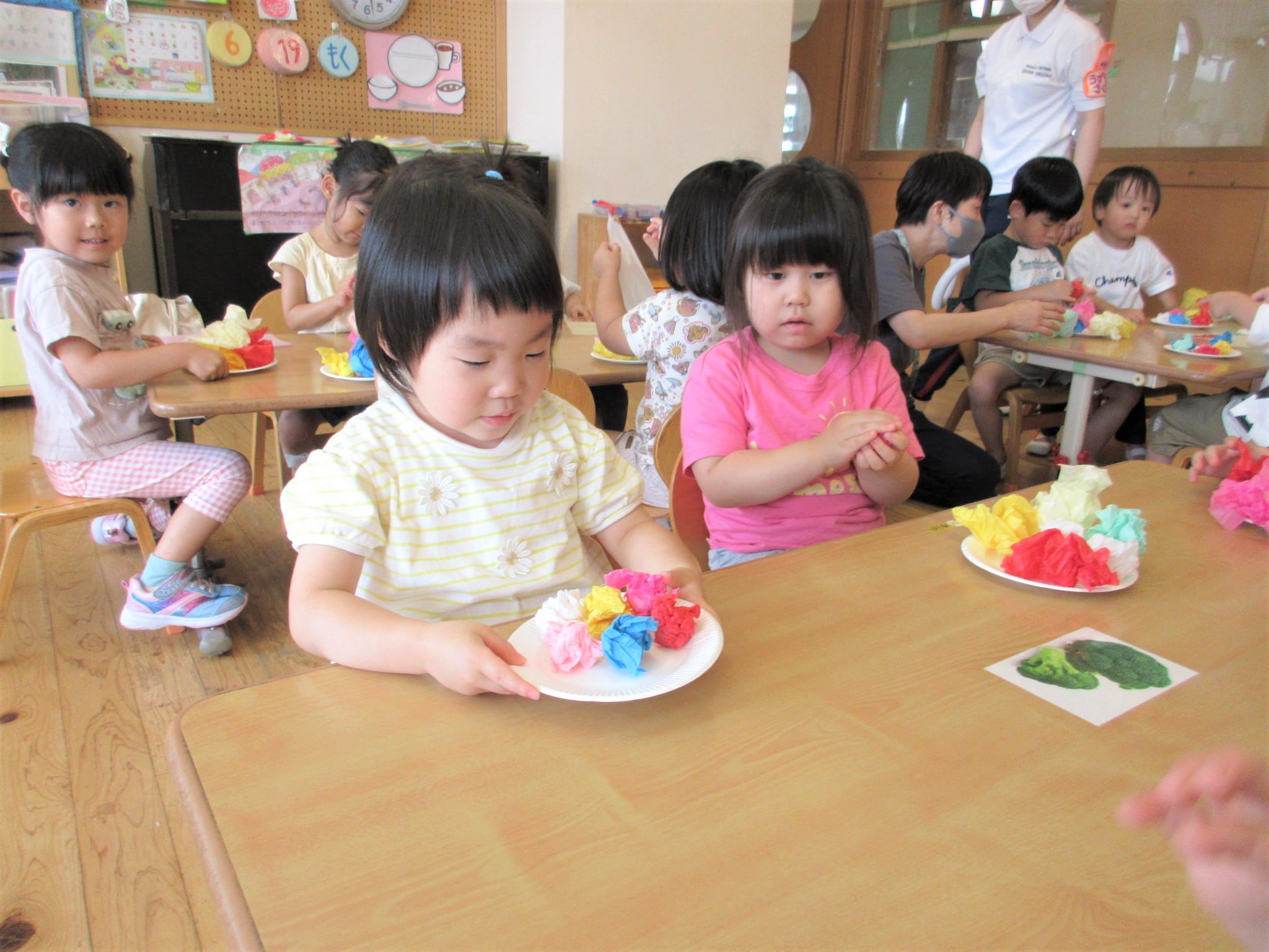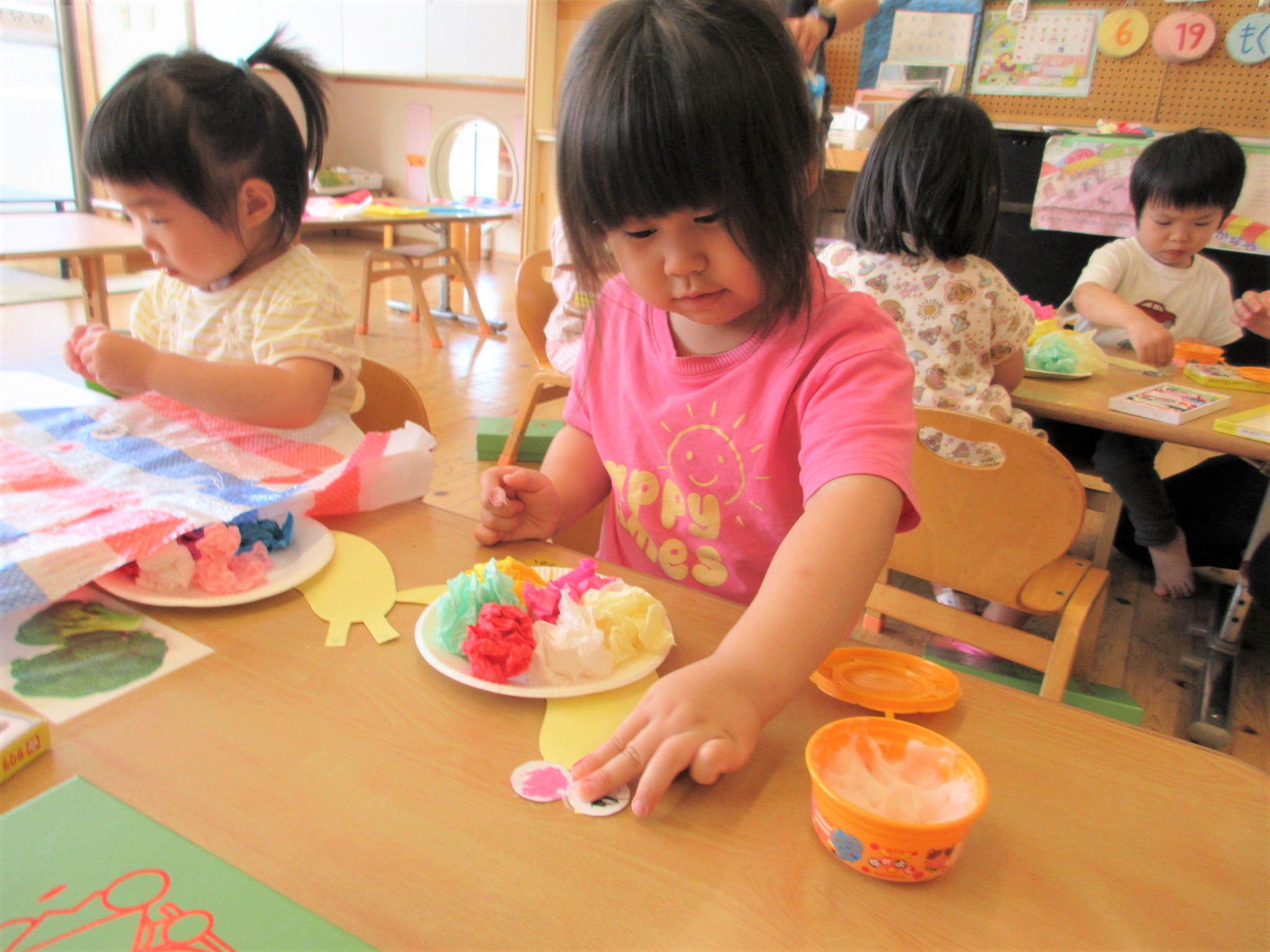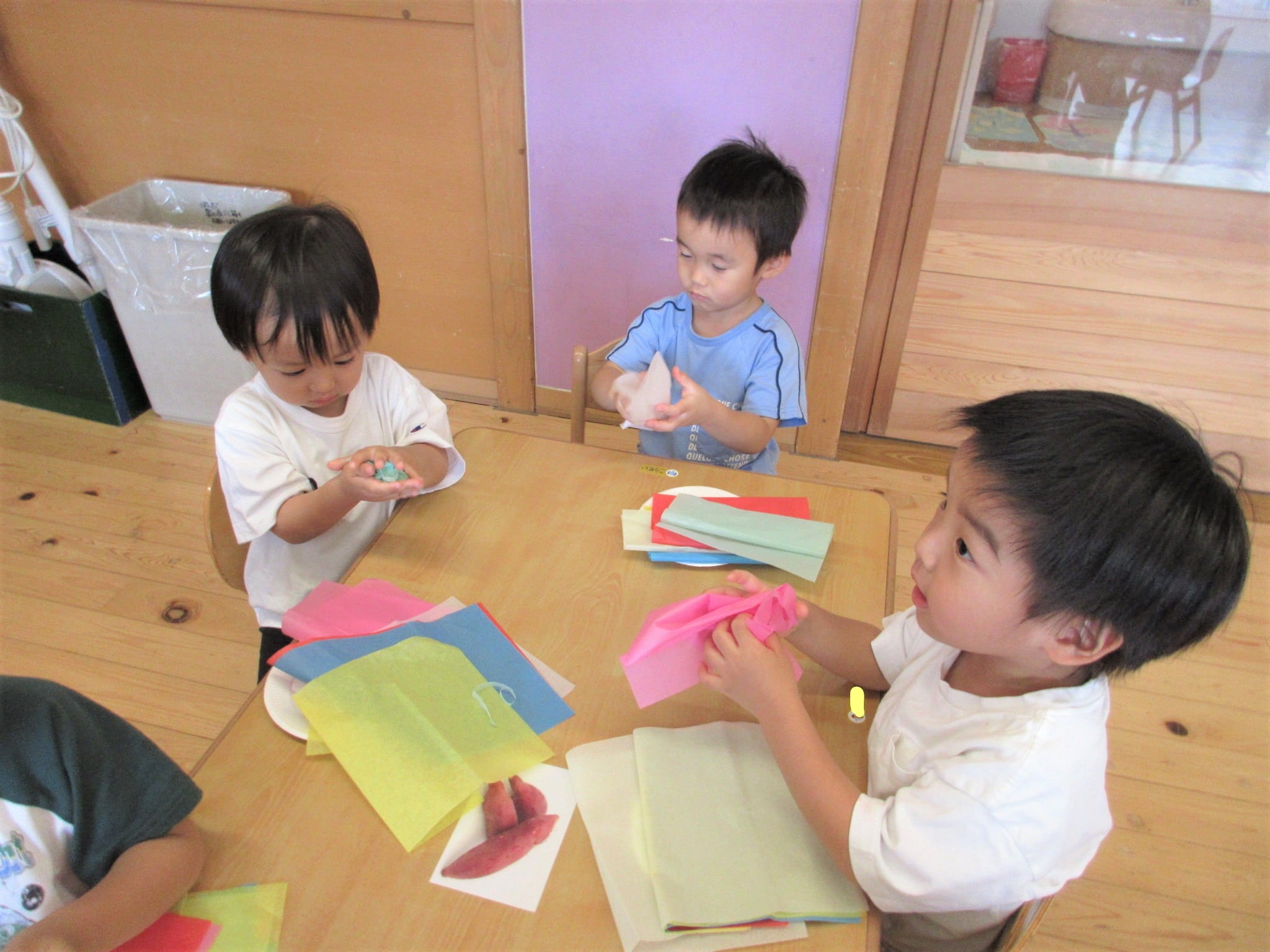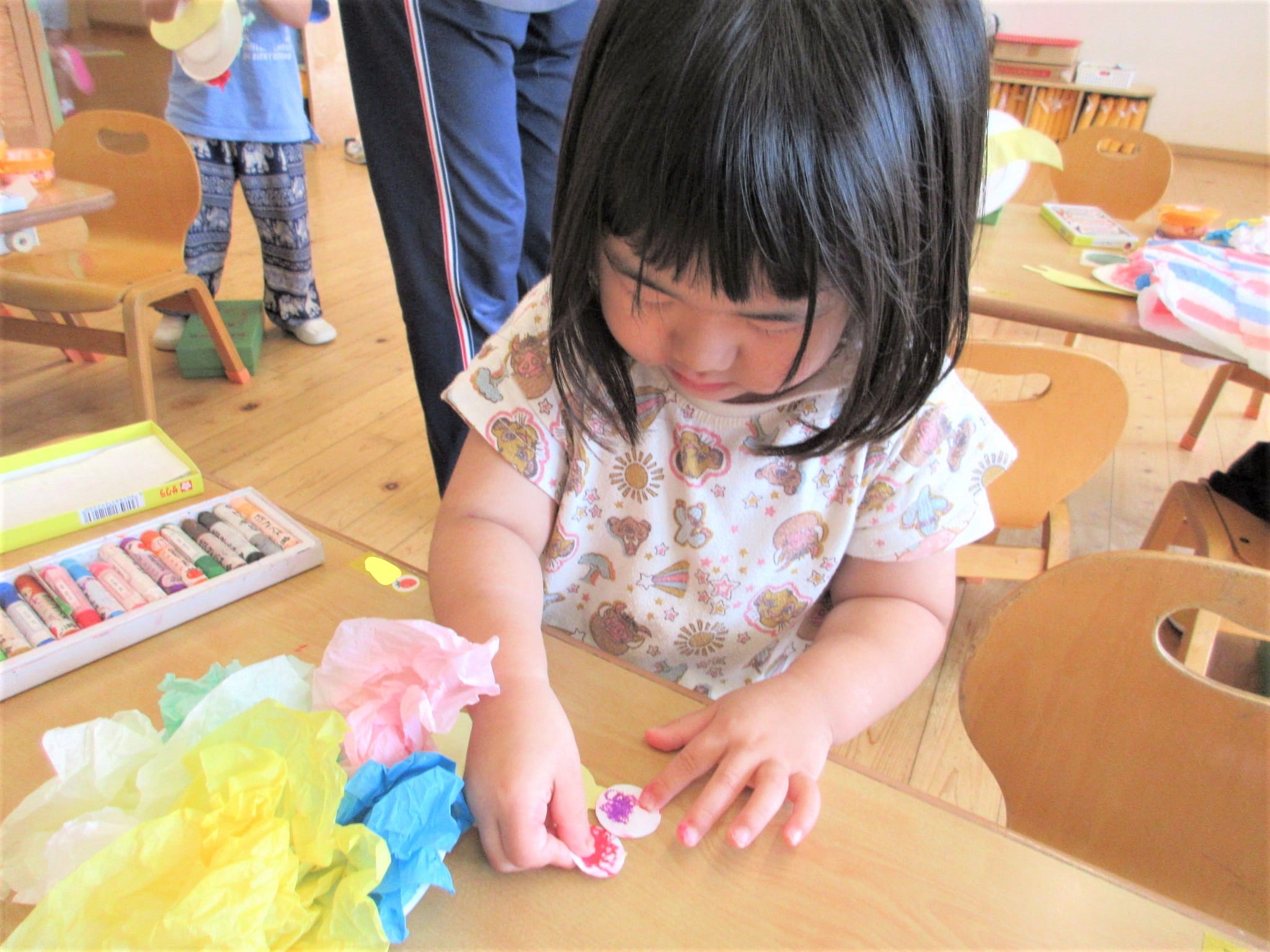 子どもたちなりに、いろいろ考えながら花紙を丸めていました♪