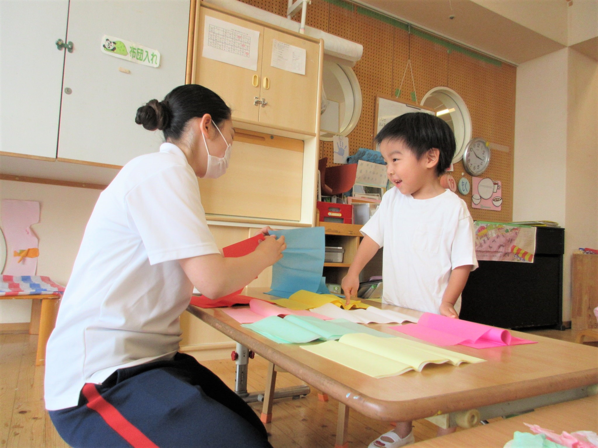 実習生は「いち・に・さん…」と、子どもと一緒に数えたり「あと、3枚選んでね」と伝えながら…