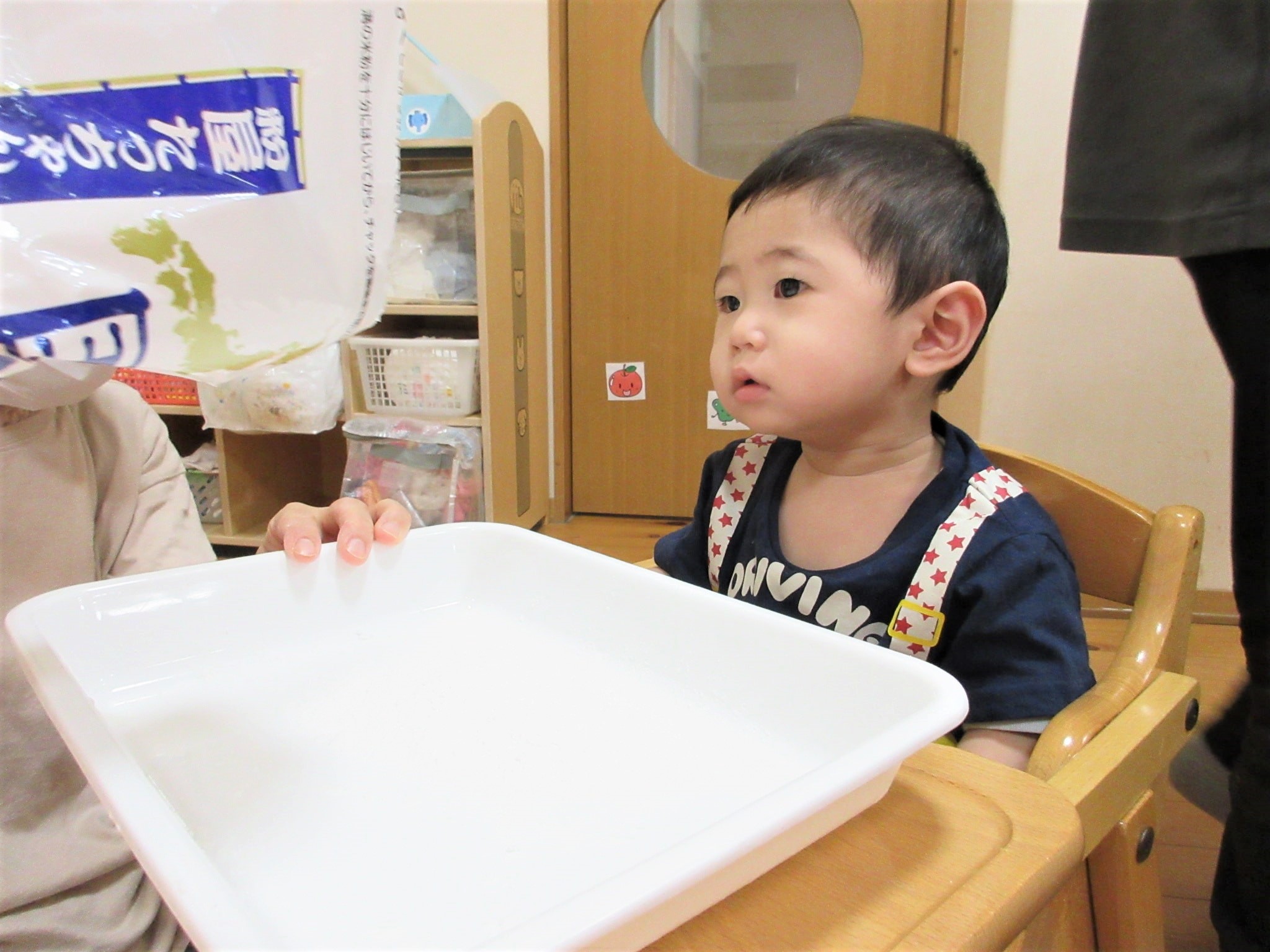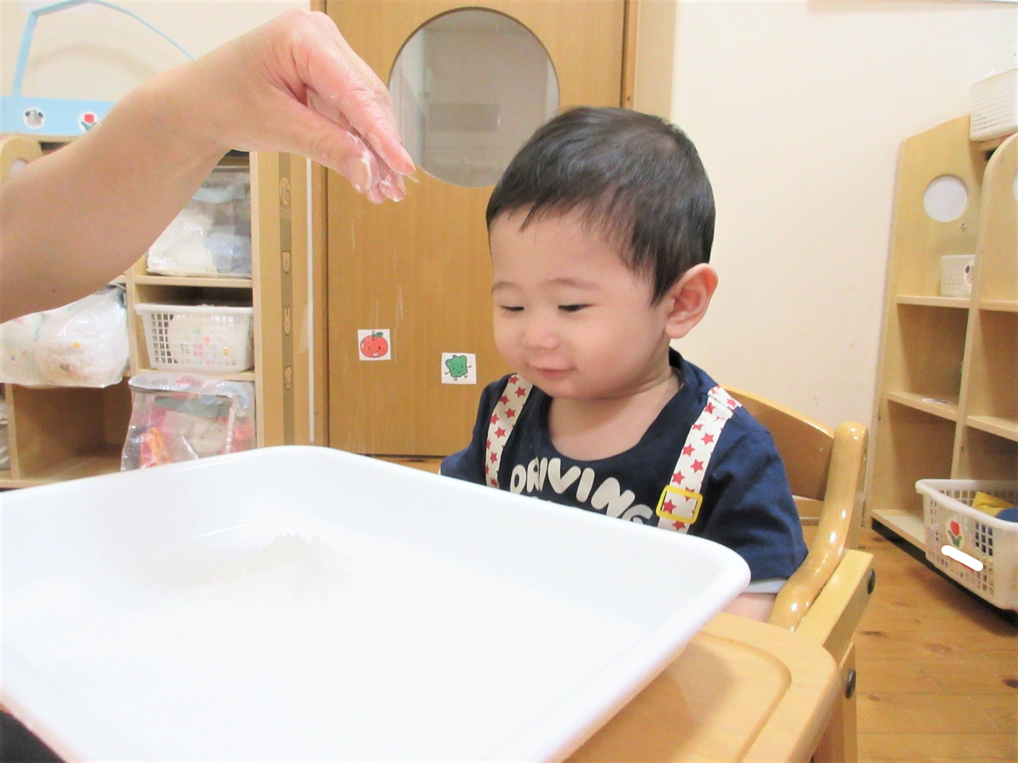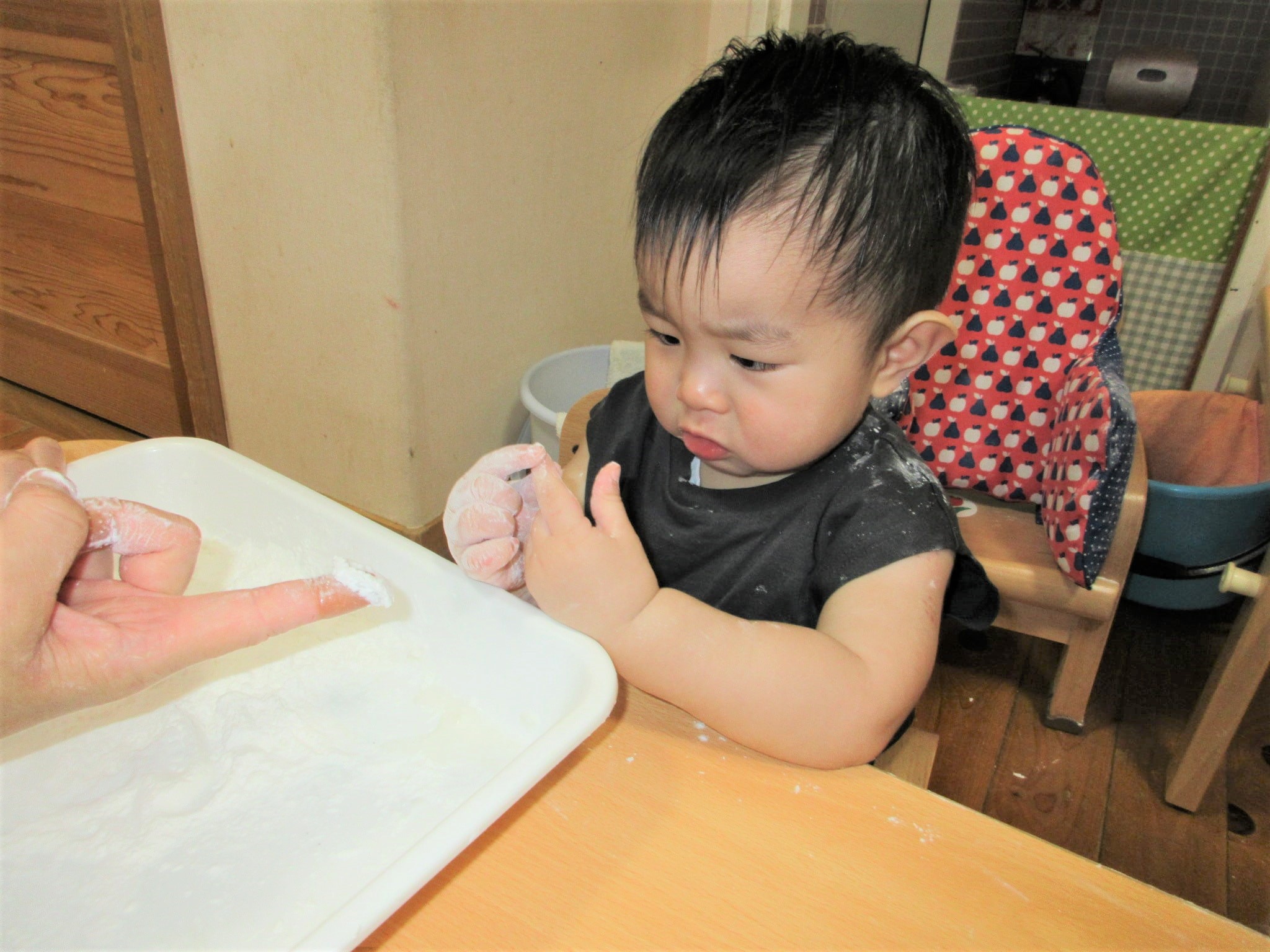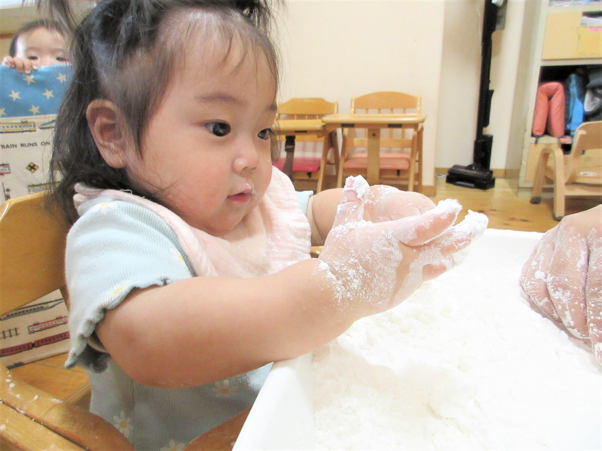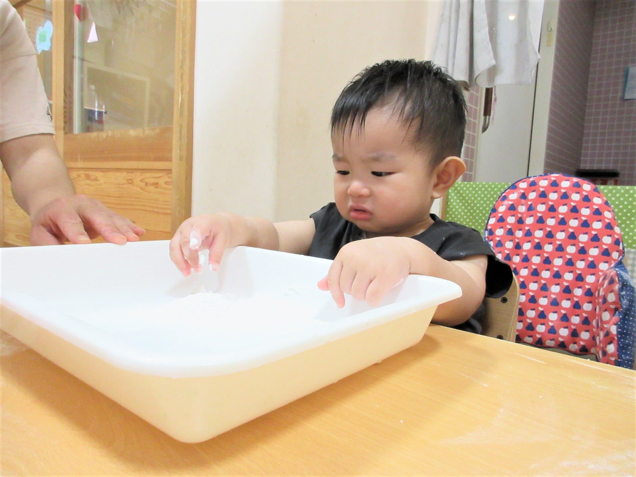 さわって・・・みようかな?【ひよこ組:米粉遊び】