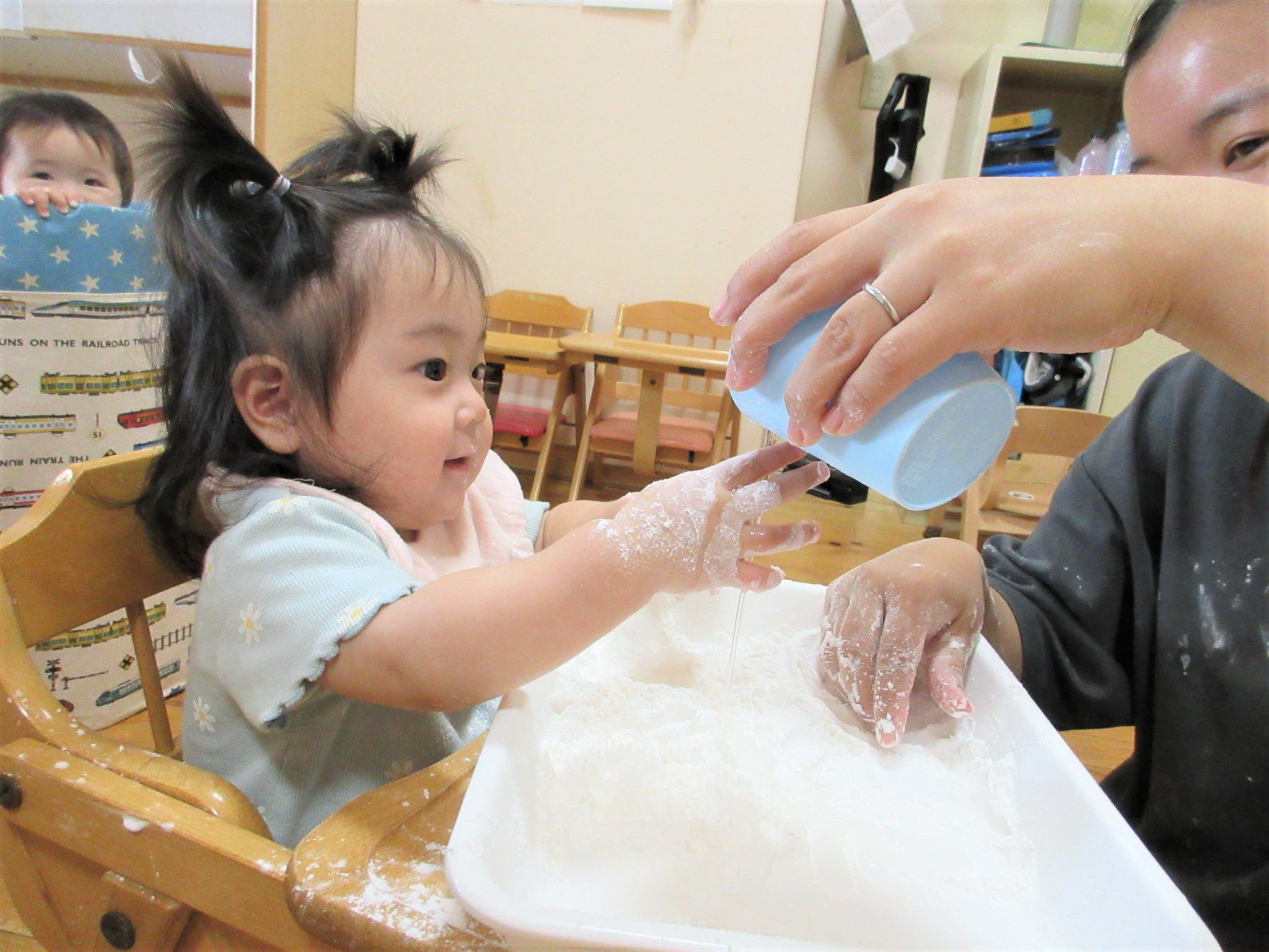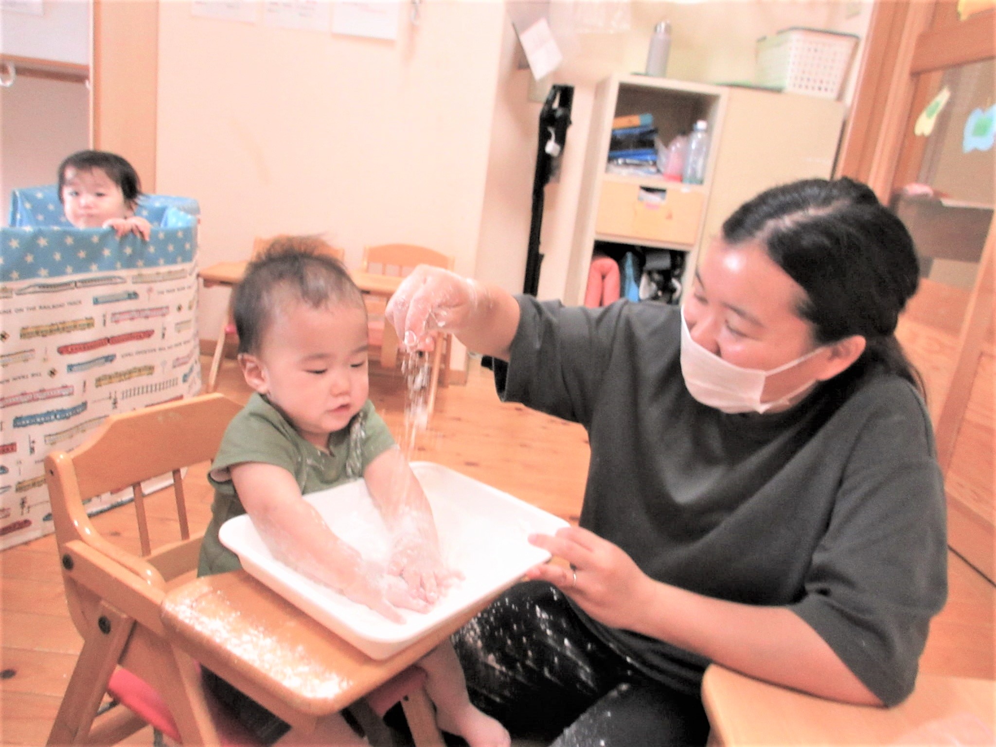 共感を積み重ねながら、米粉の感触を楽しむ子どももいれば・・・