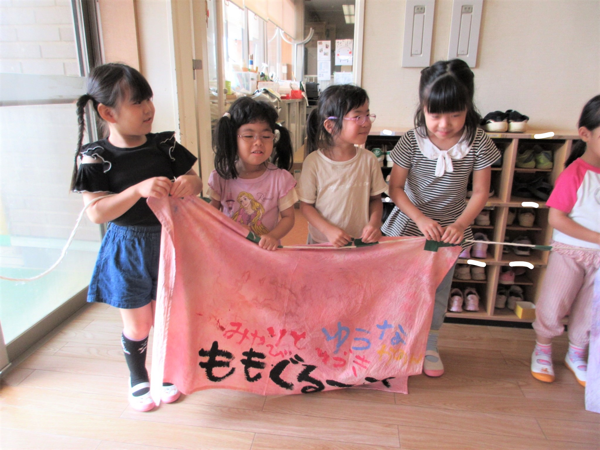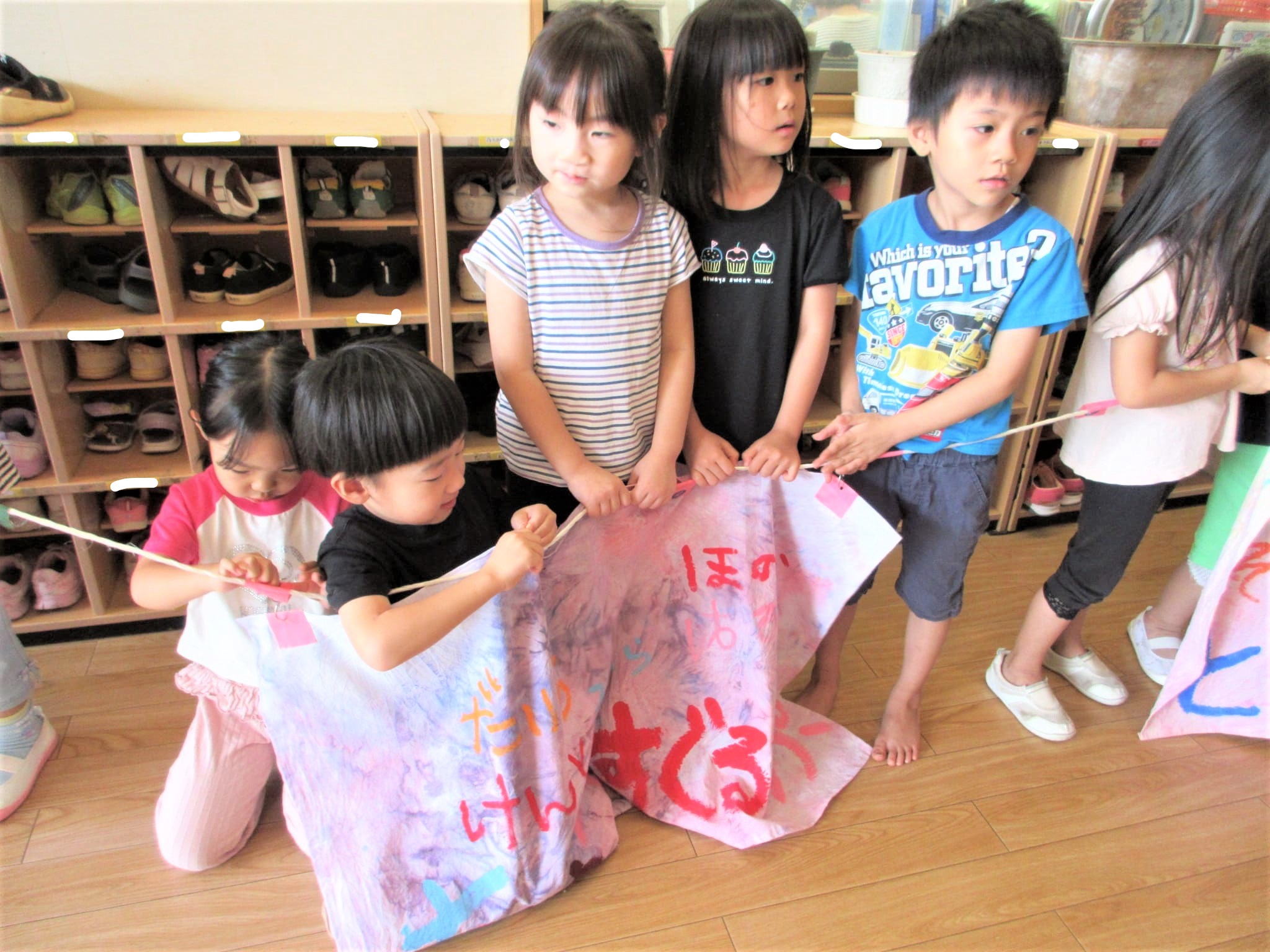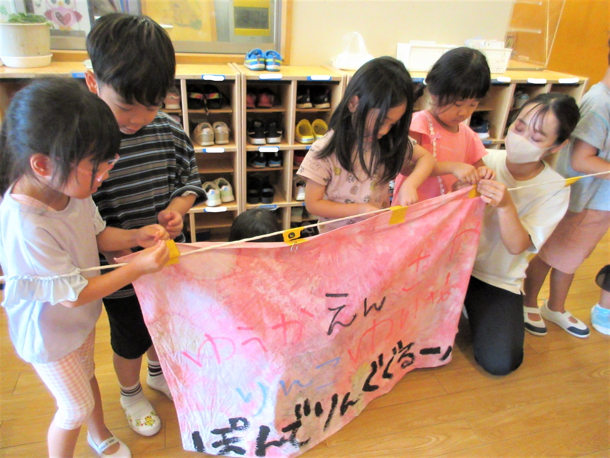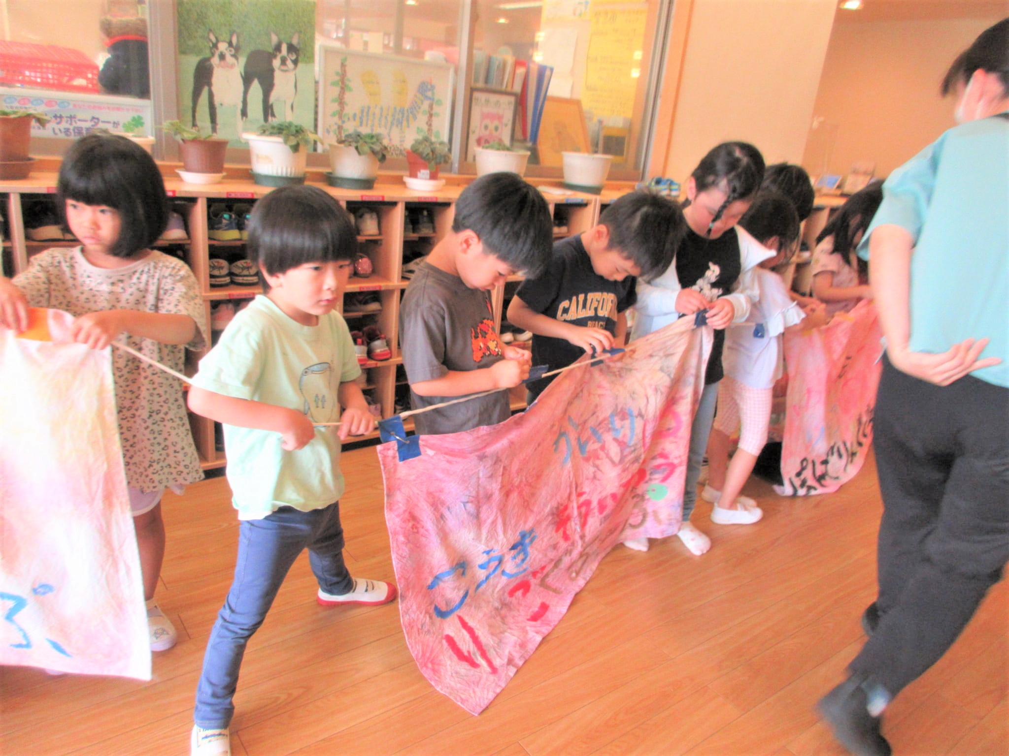 当日までの準備期間…染たりしながら、グループで作った素敵な旗を紐に旗をつけて・・