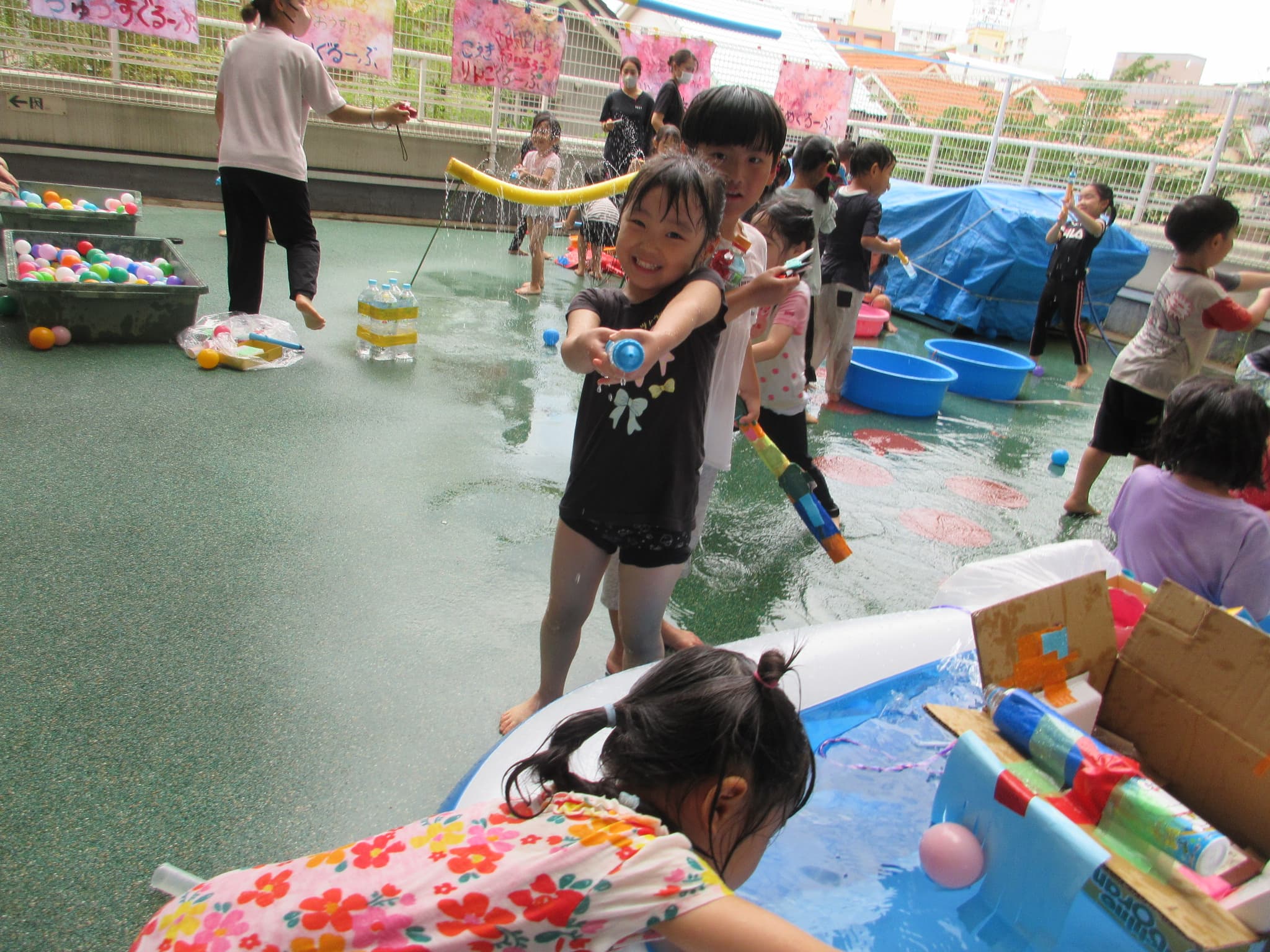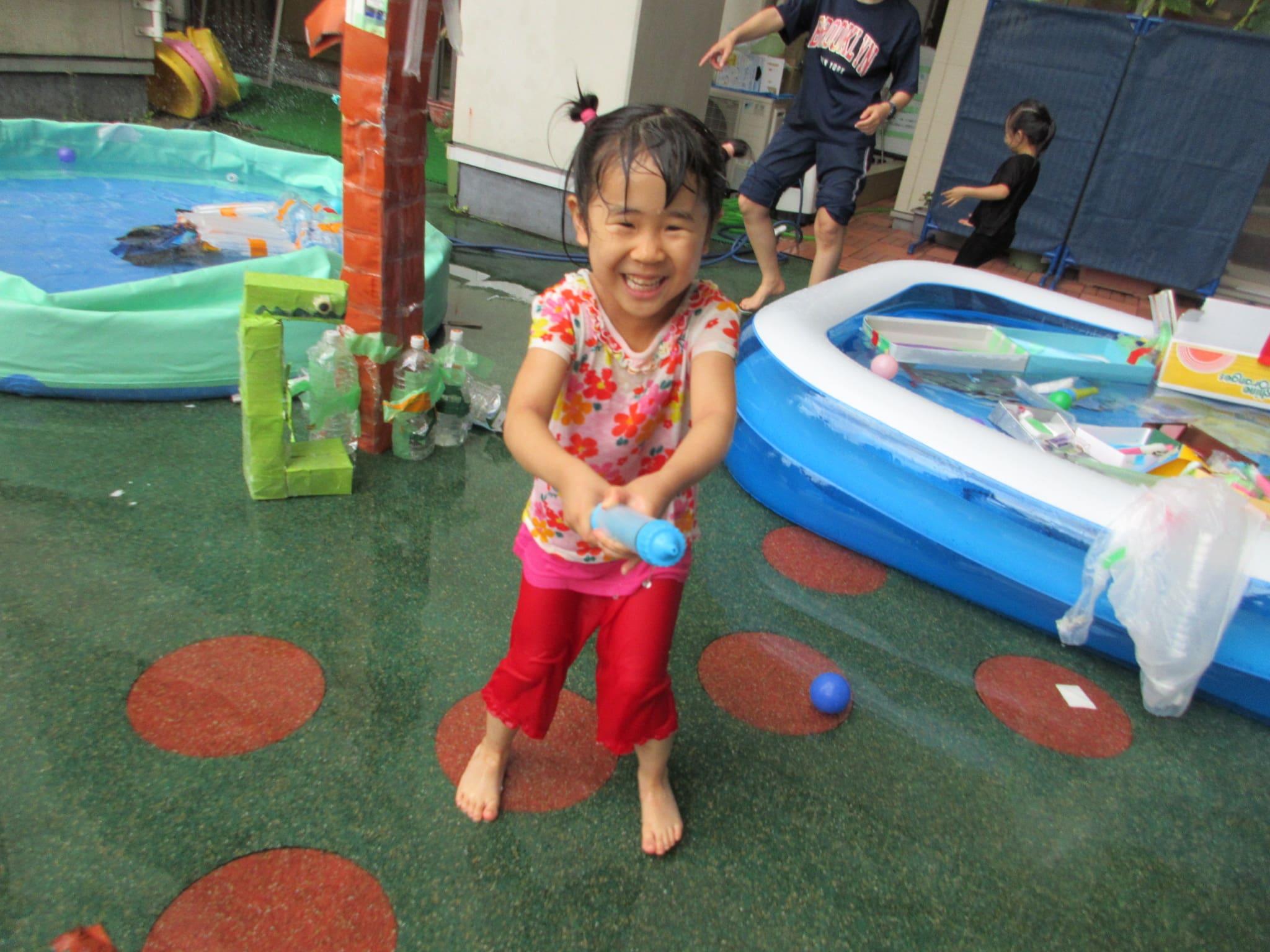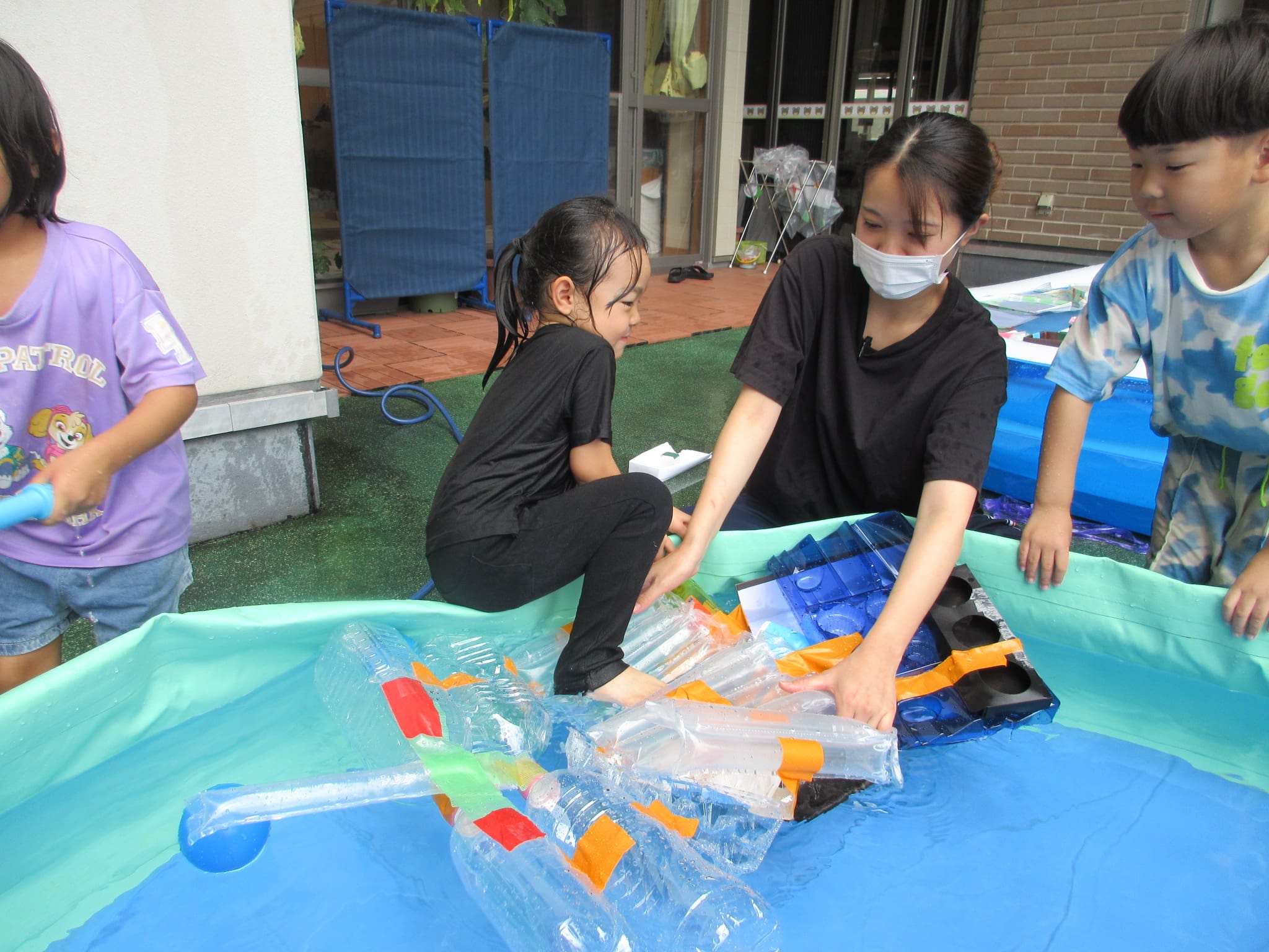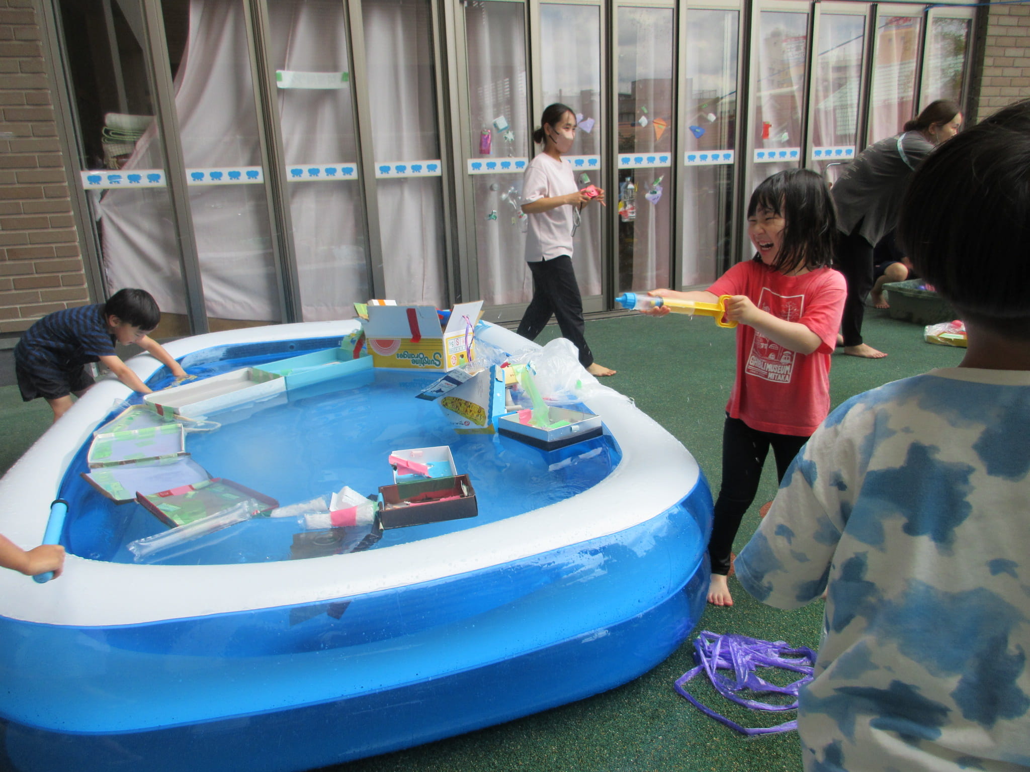 自分たちで作った船を浮かべたり、水鉄砲で遊んだり・・・☆