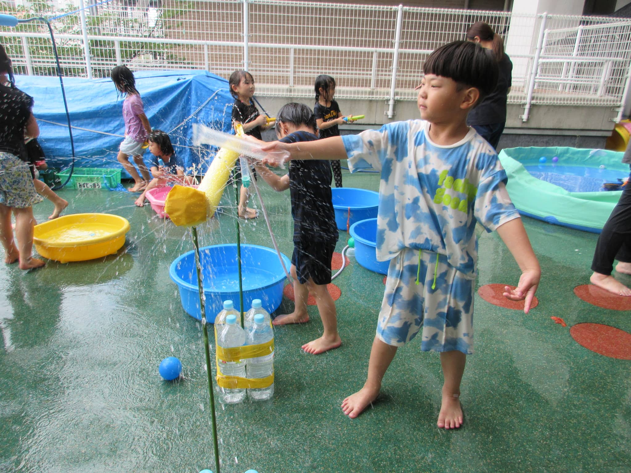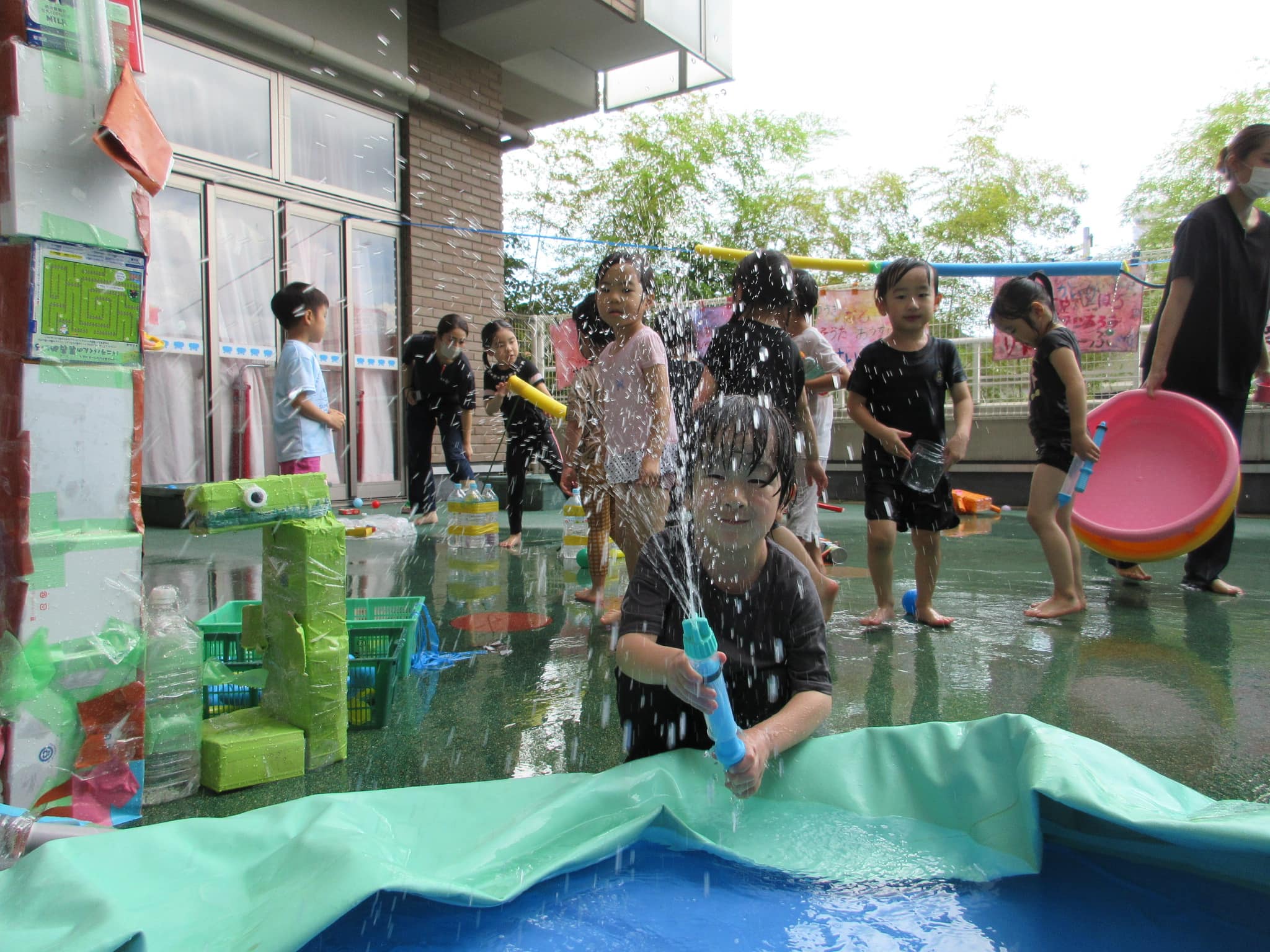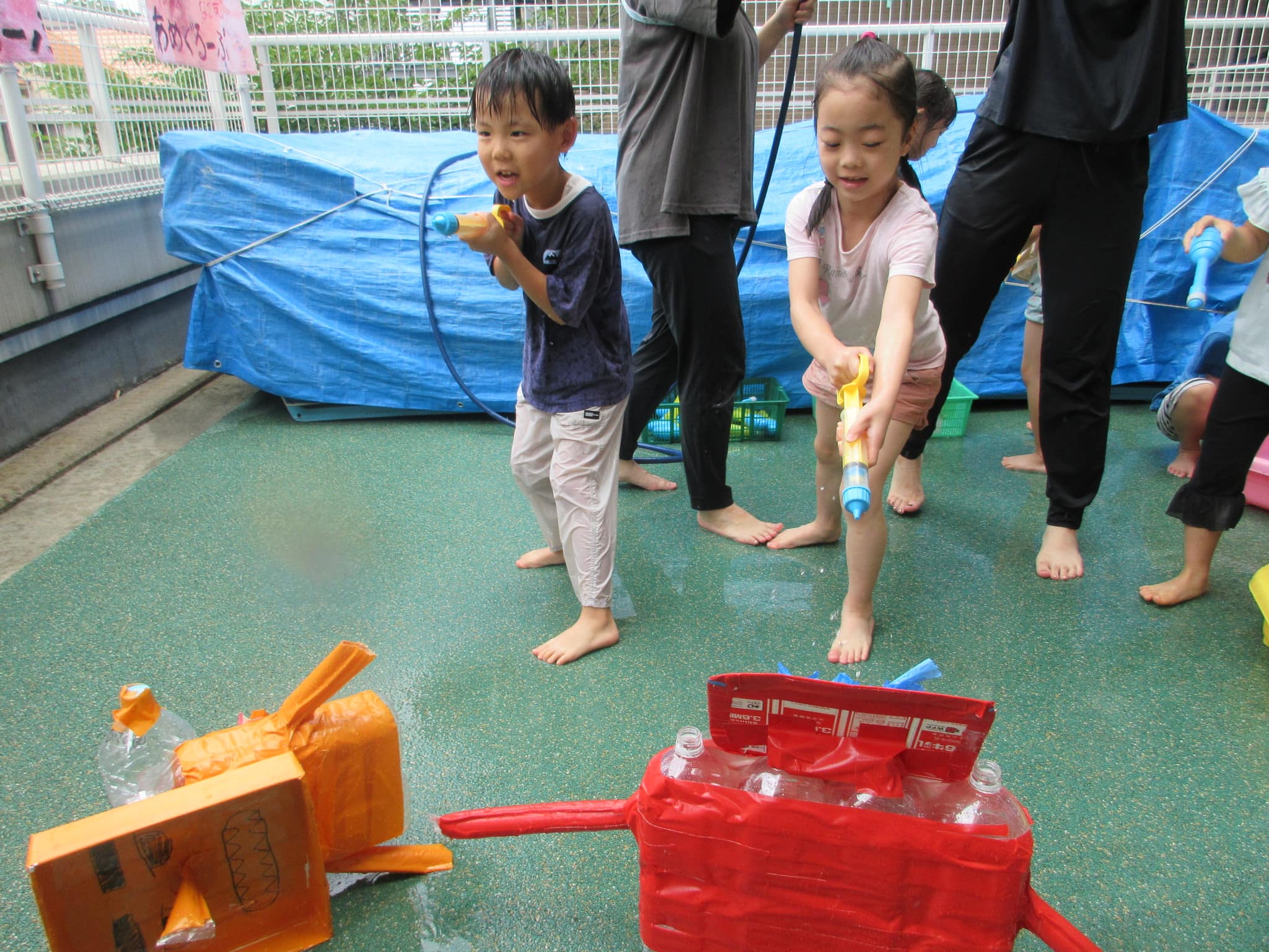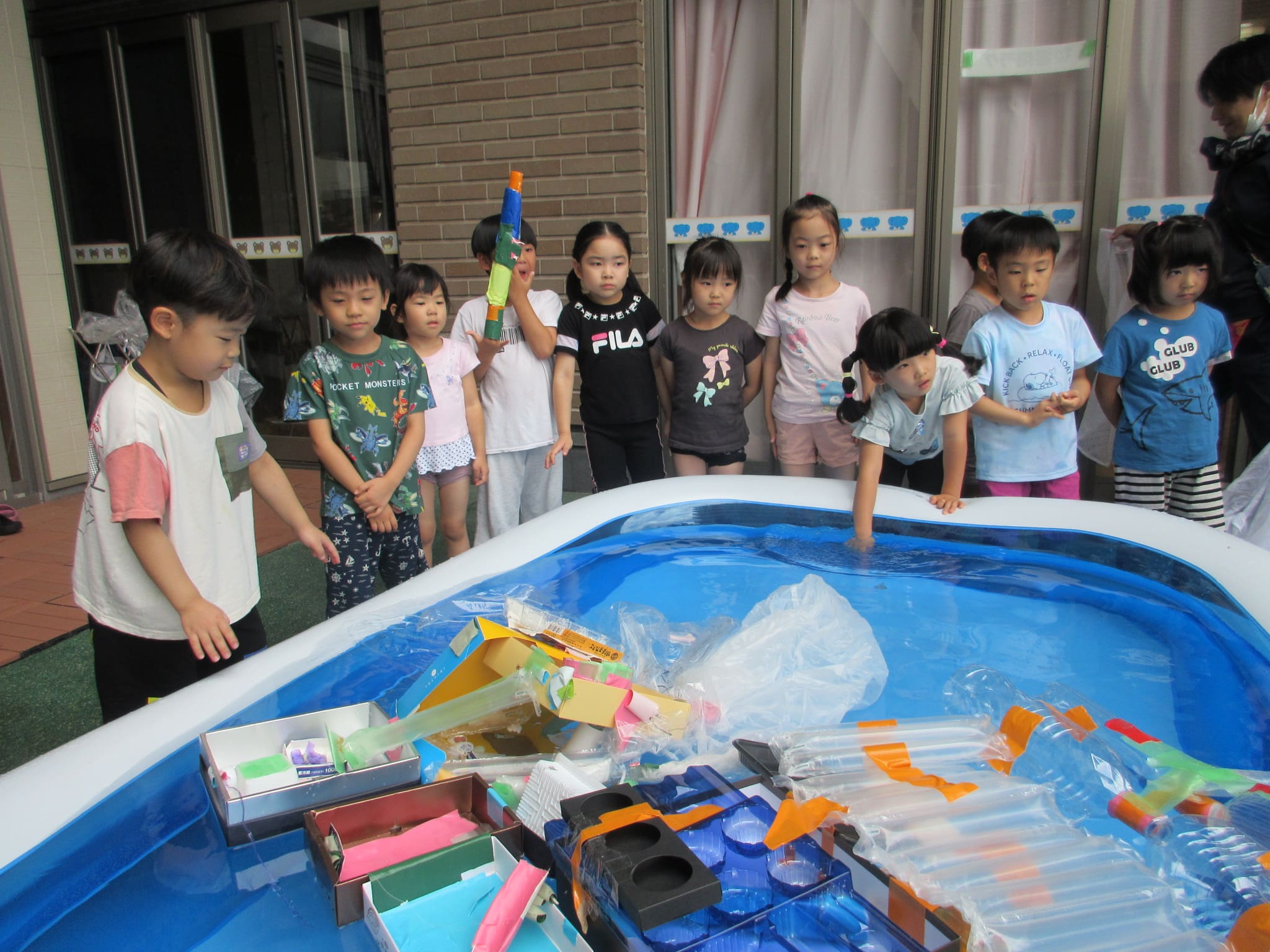 自分たちで作った船を浮かべたり、水鉄砲で遊んだり・・・☆