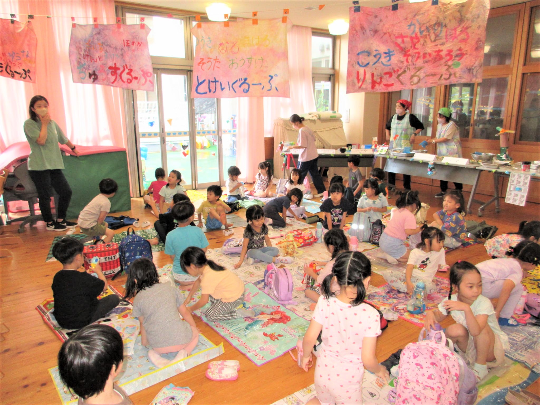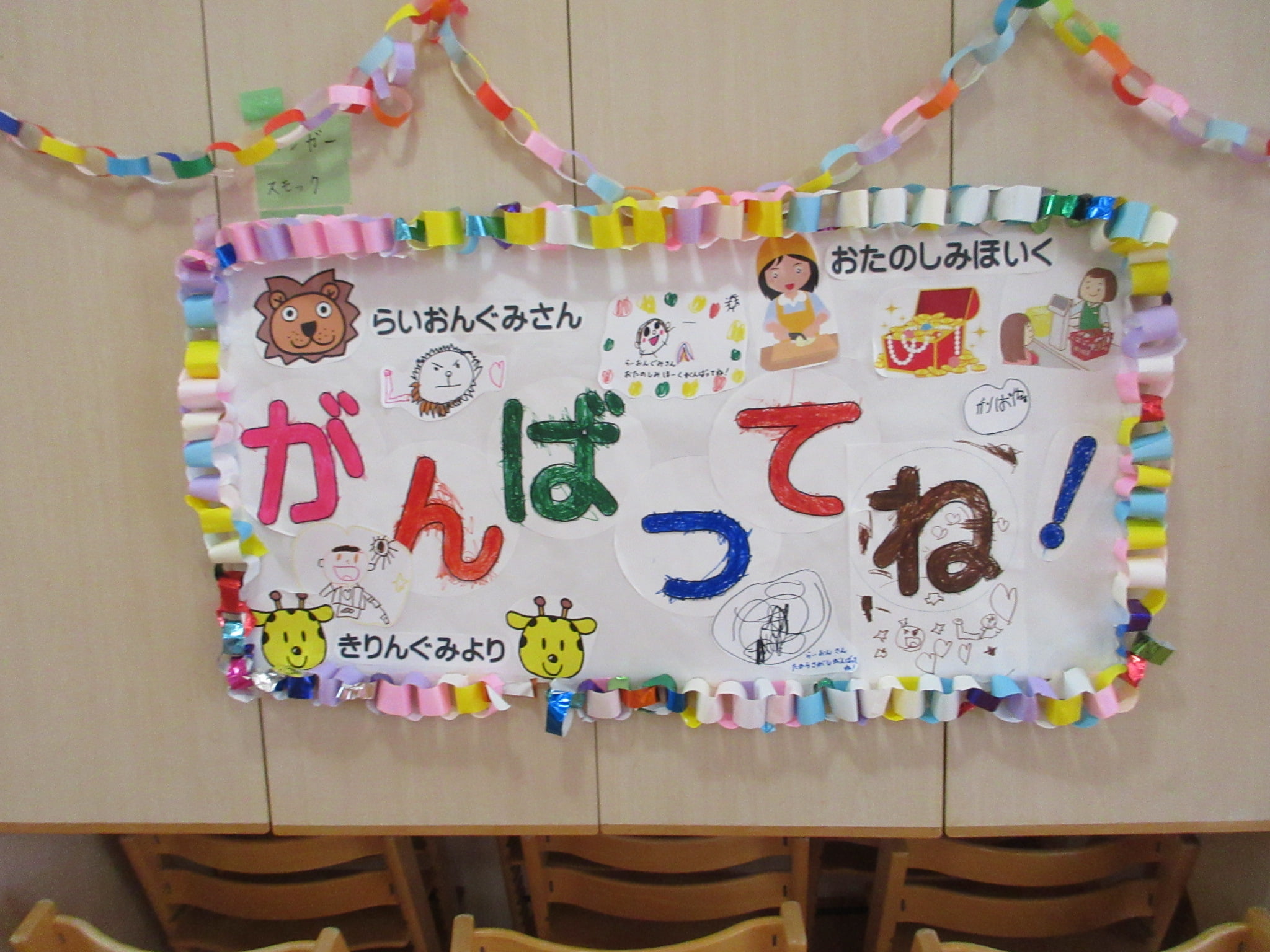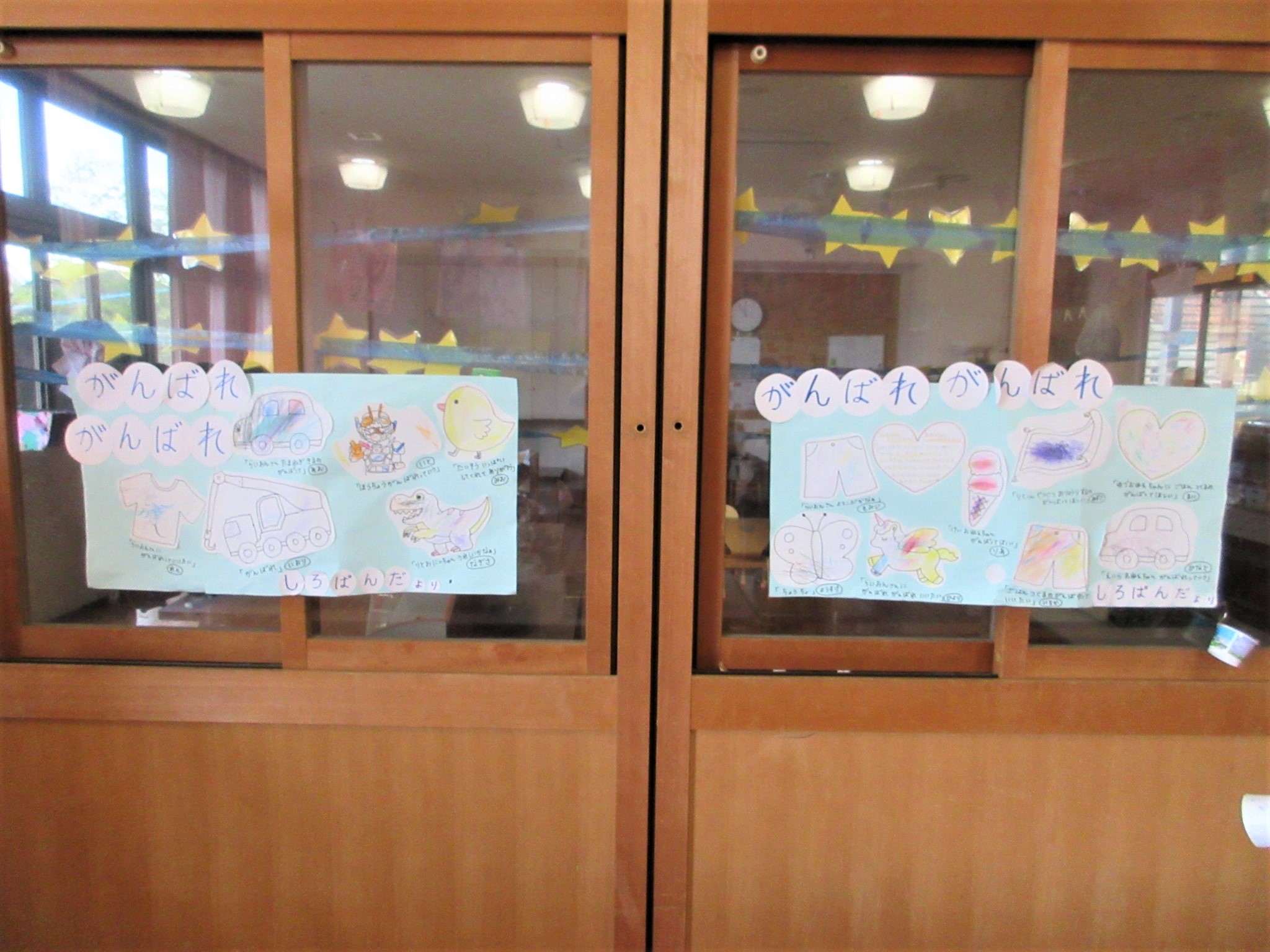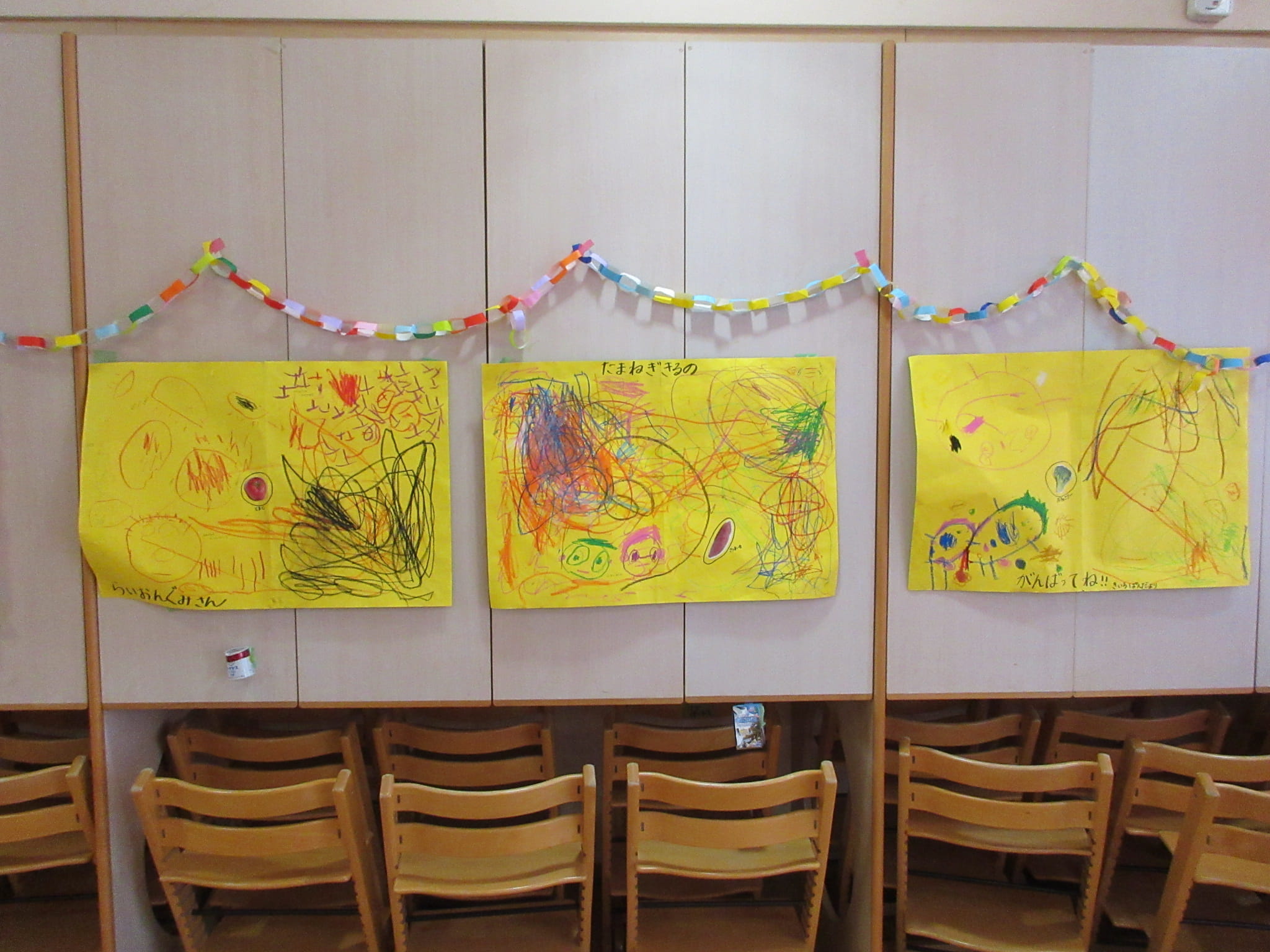 昨日のはじまりの会で、きりん組・ぱんだ組からのプレゼントも飾って