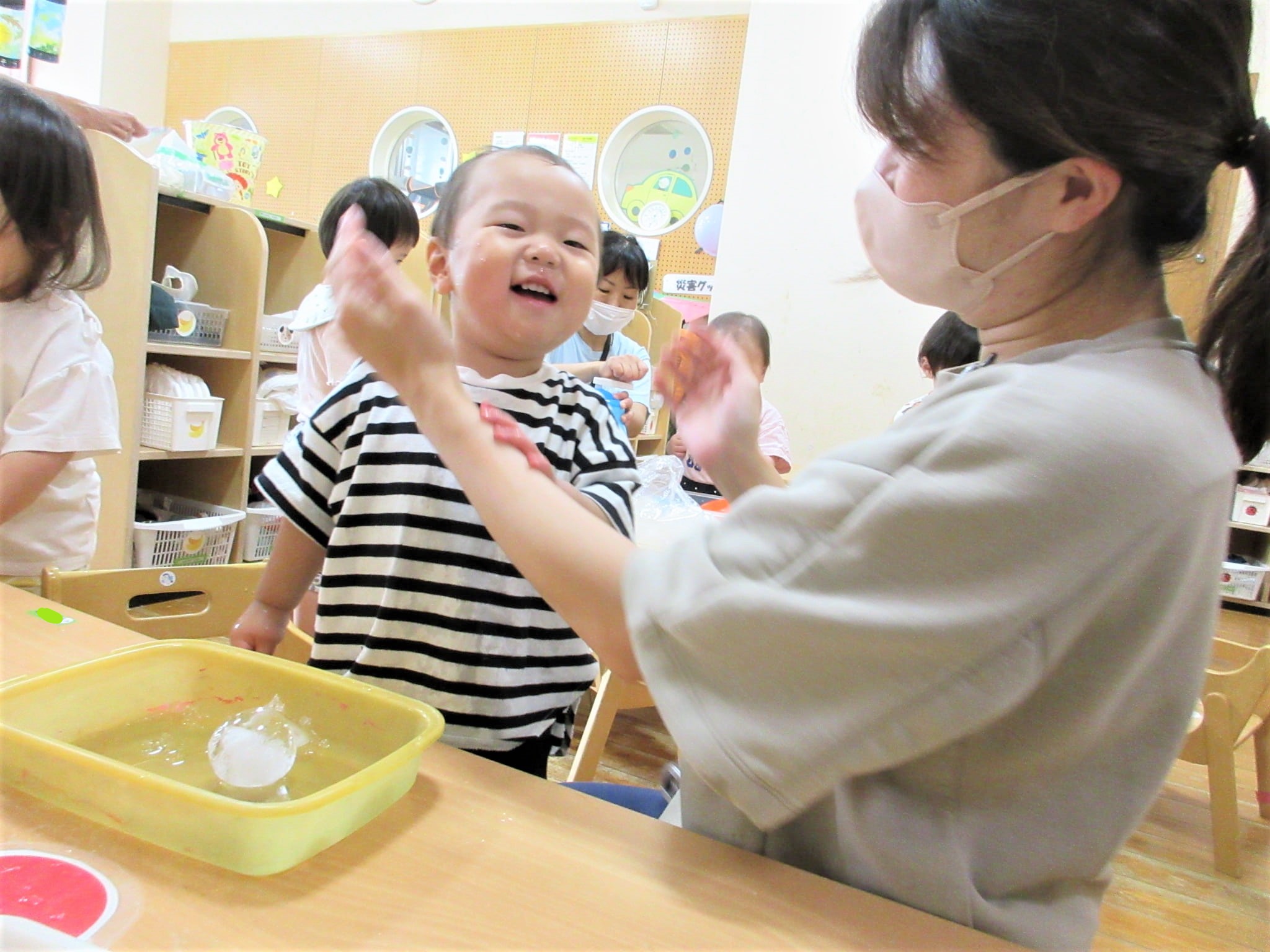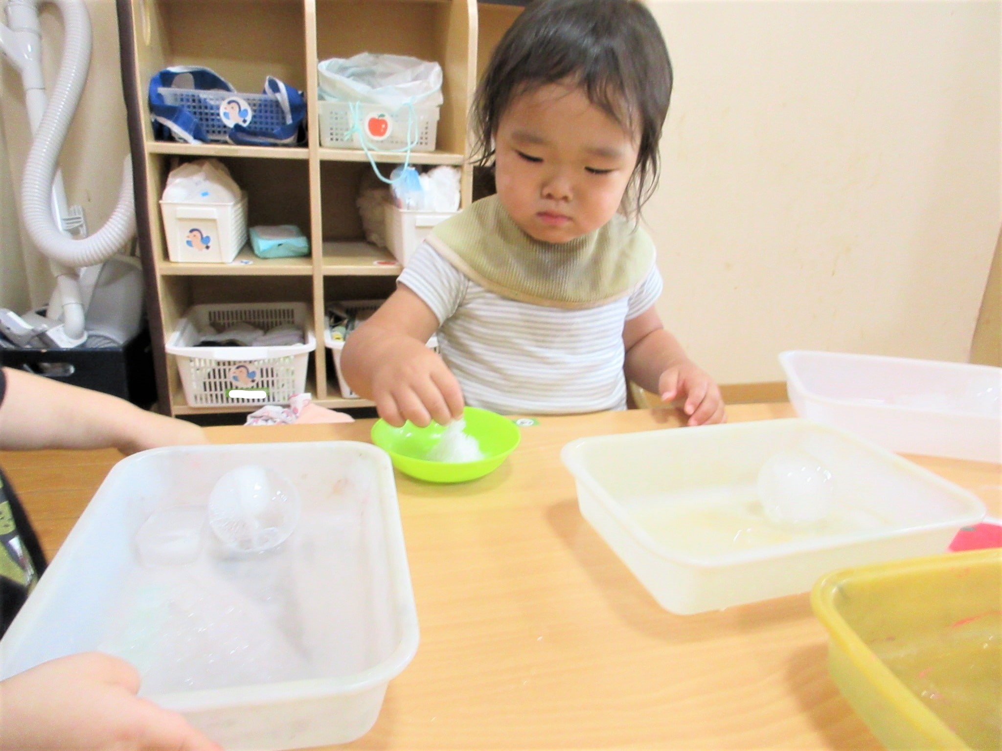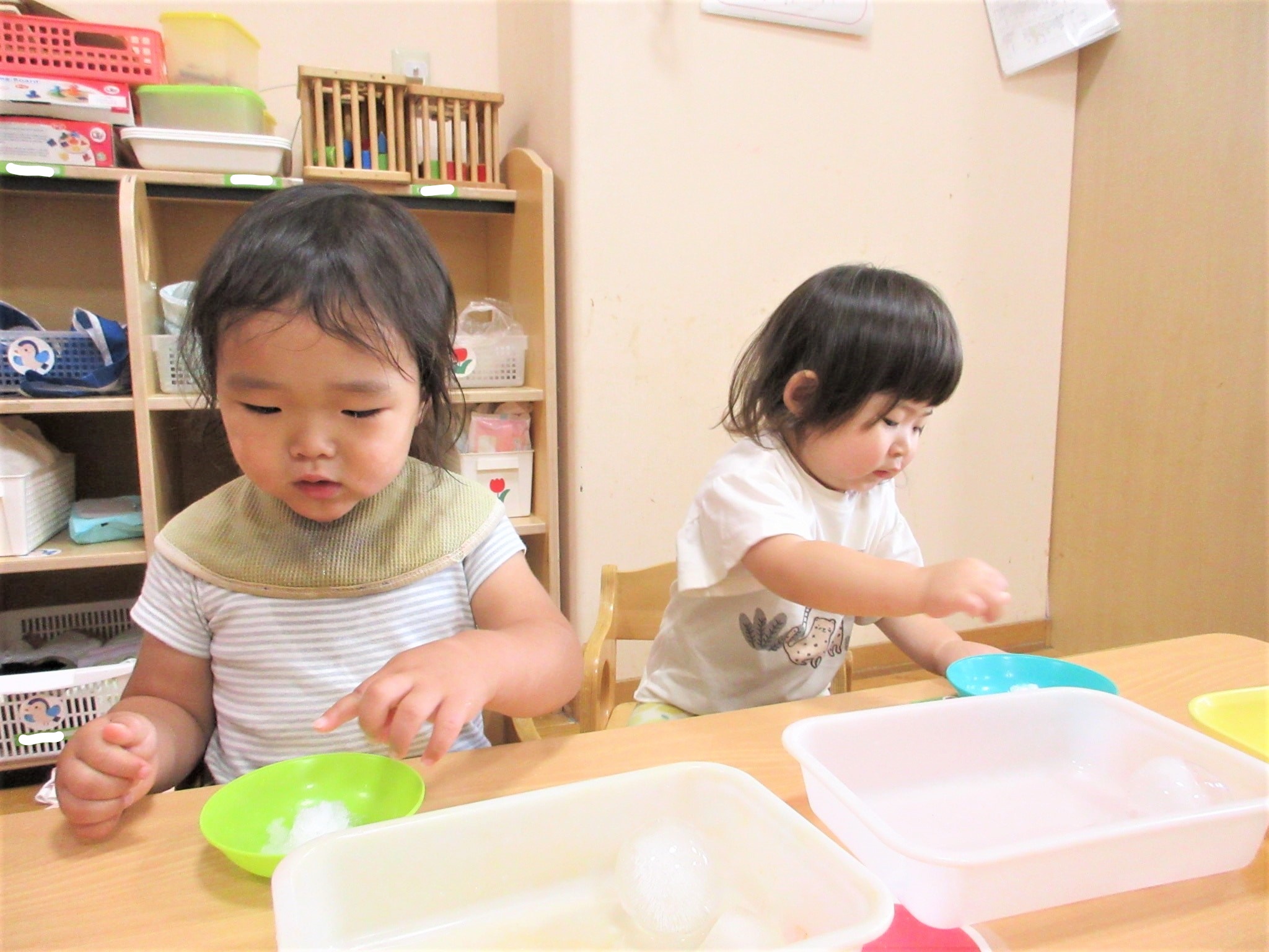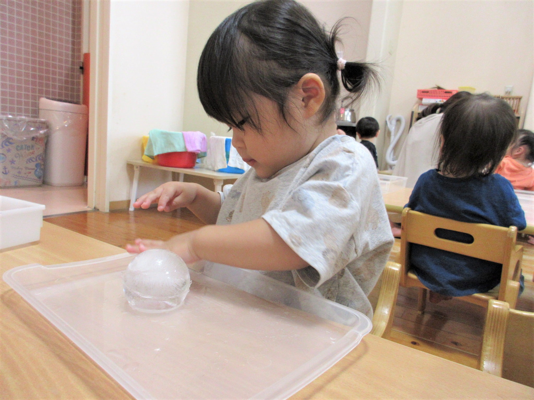 氷を手や指でつかんだり動かしたりしながら、手指の発達を促したり…