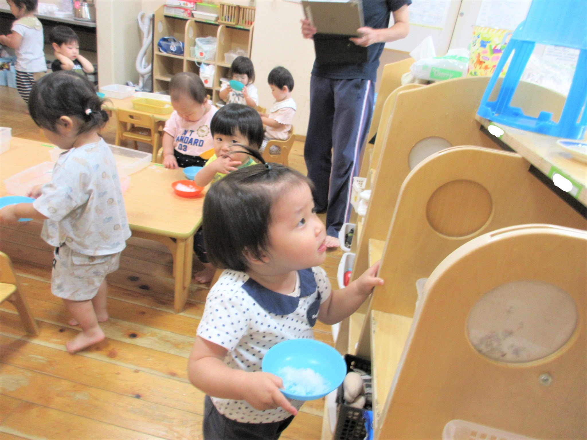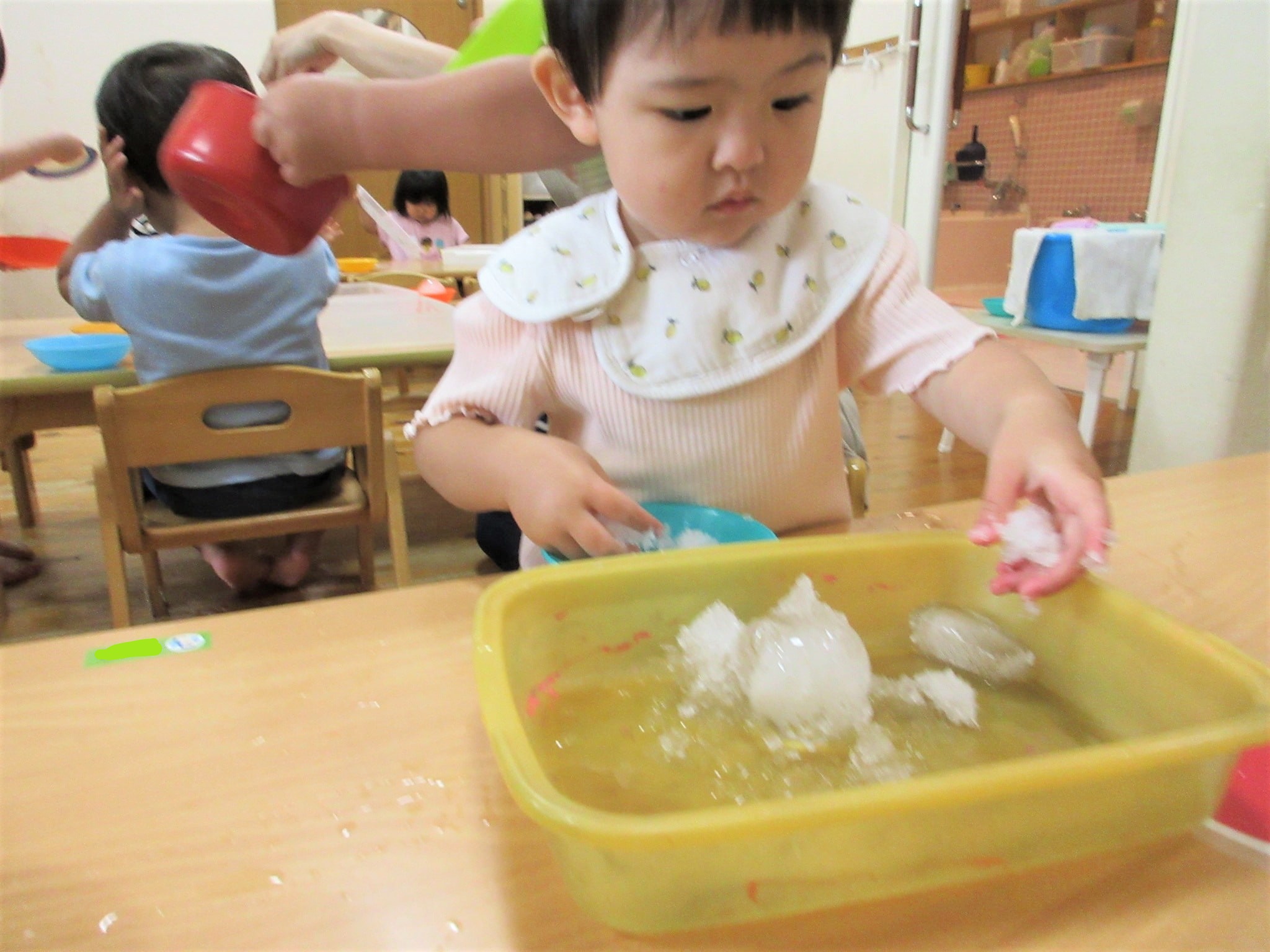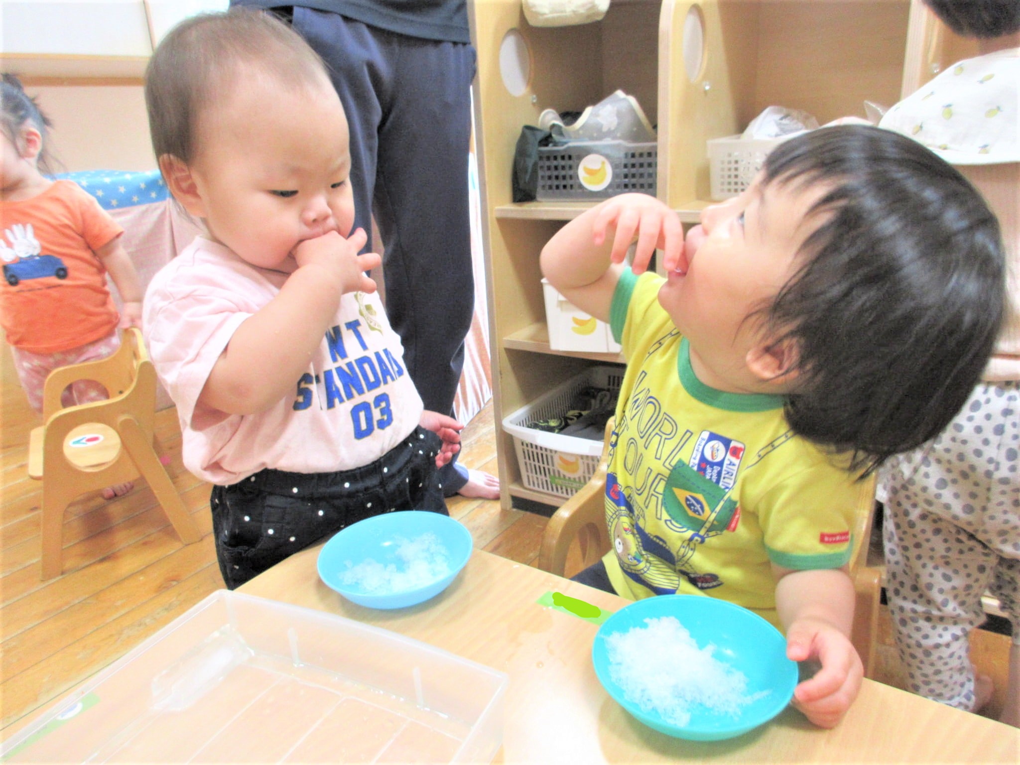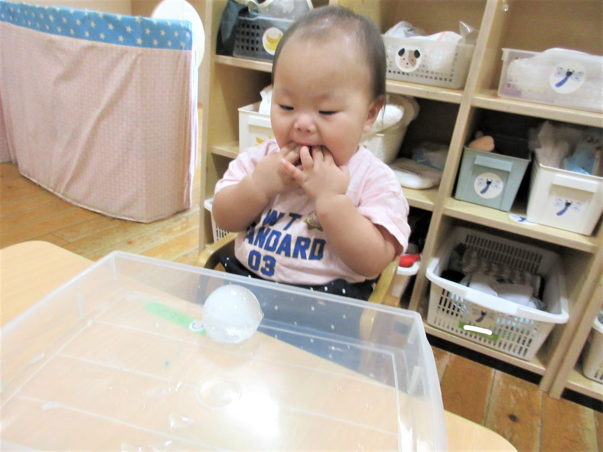 氷を手や指でつかんだり動かしたりしながら、手指の発達を促したり…