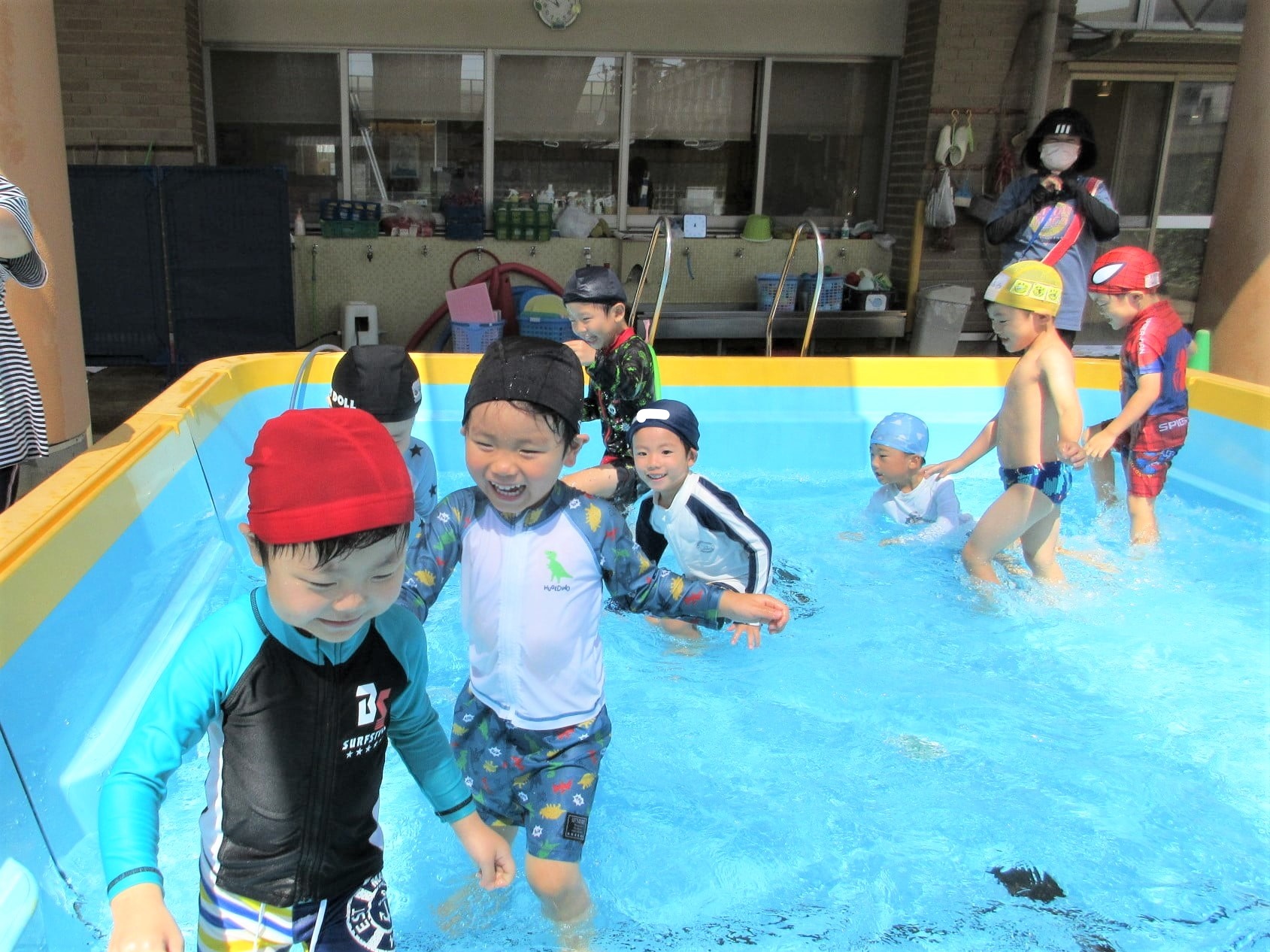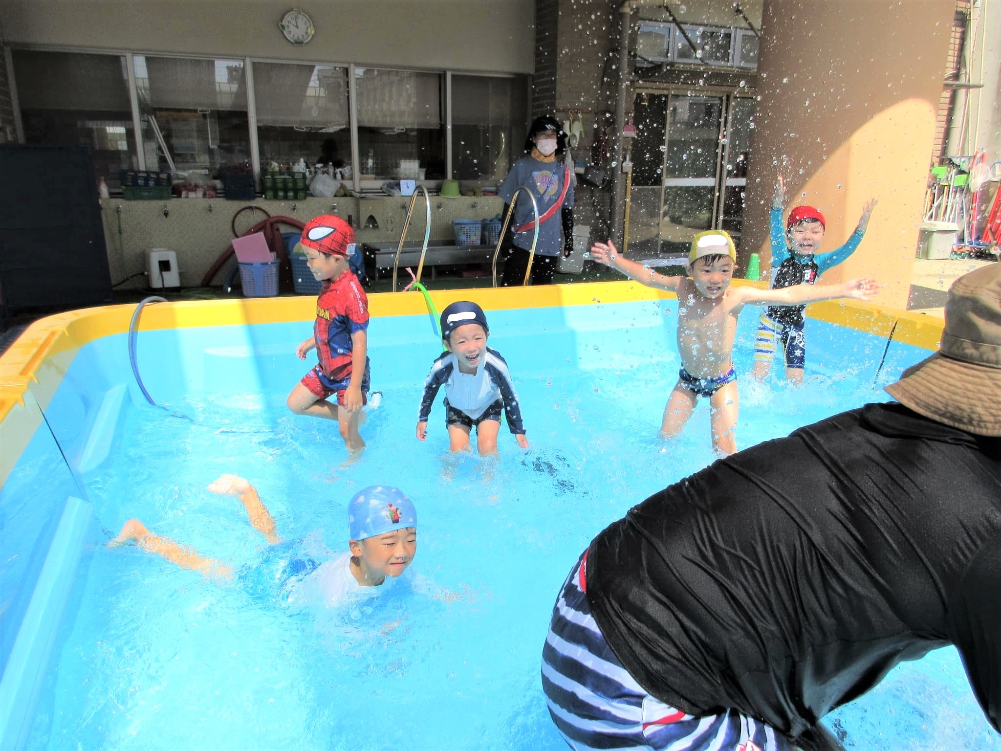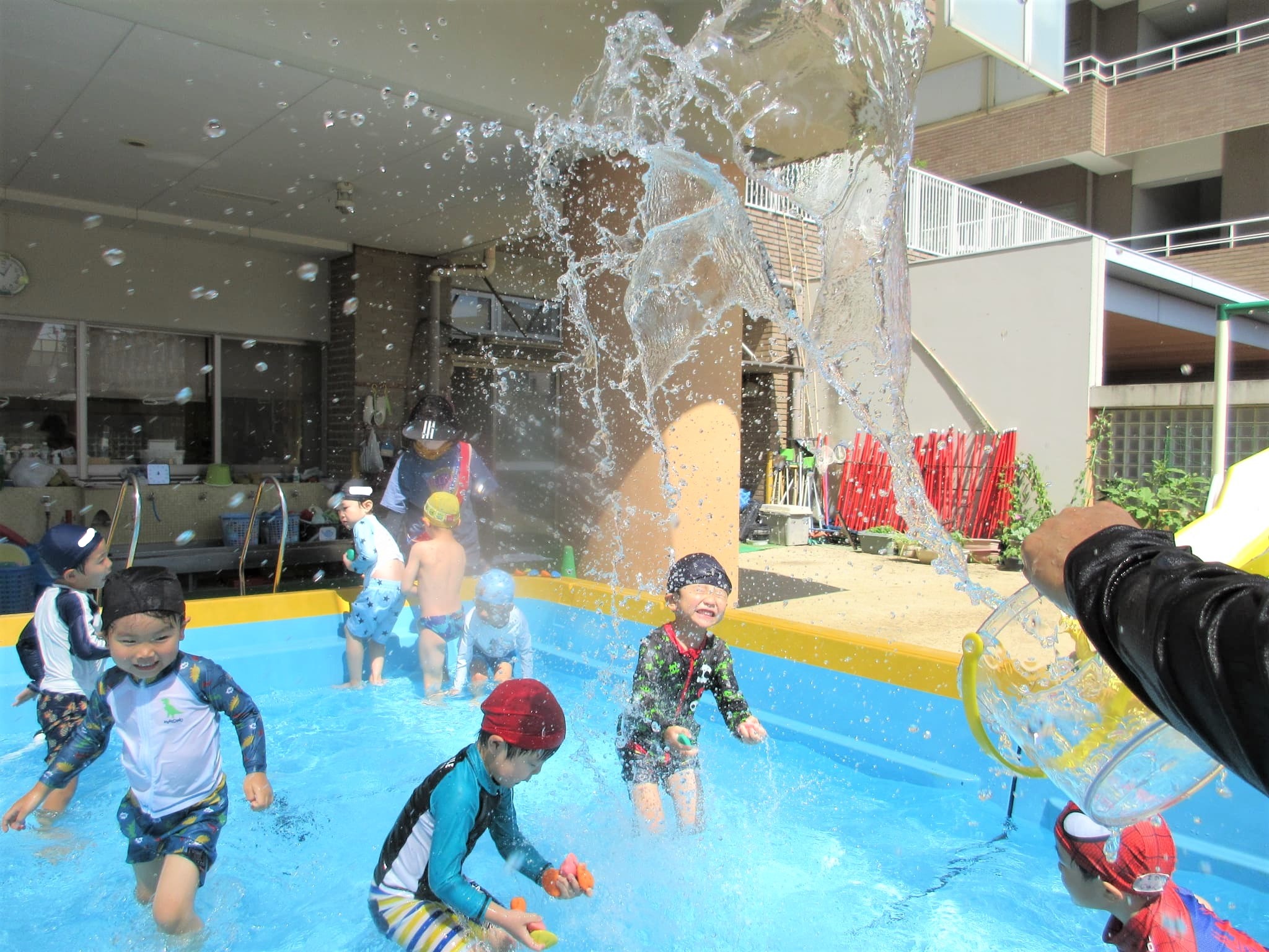腕や胸にゆっくり水を掛けて、身体を水に慣らせます♪