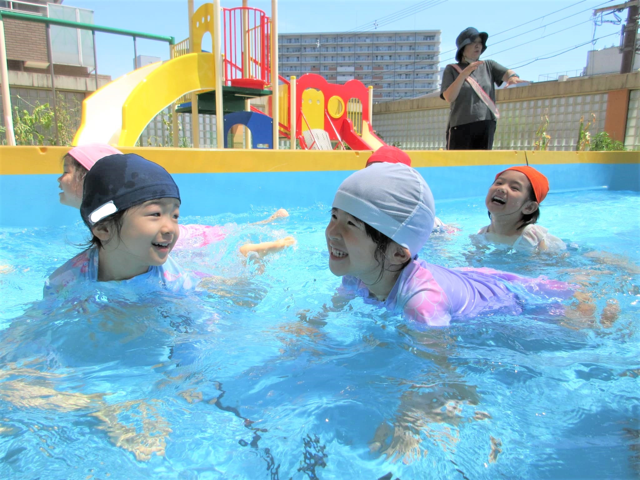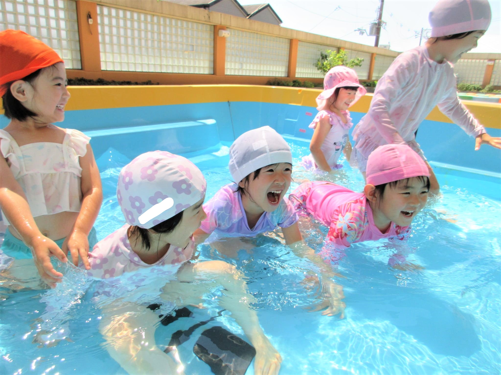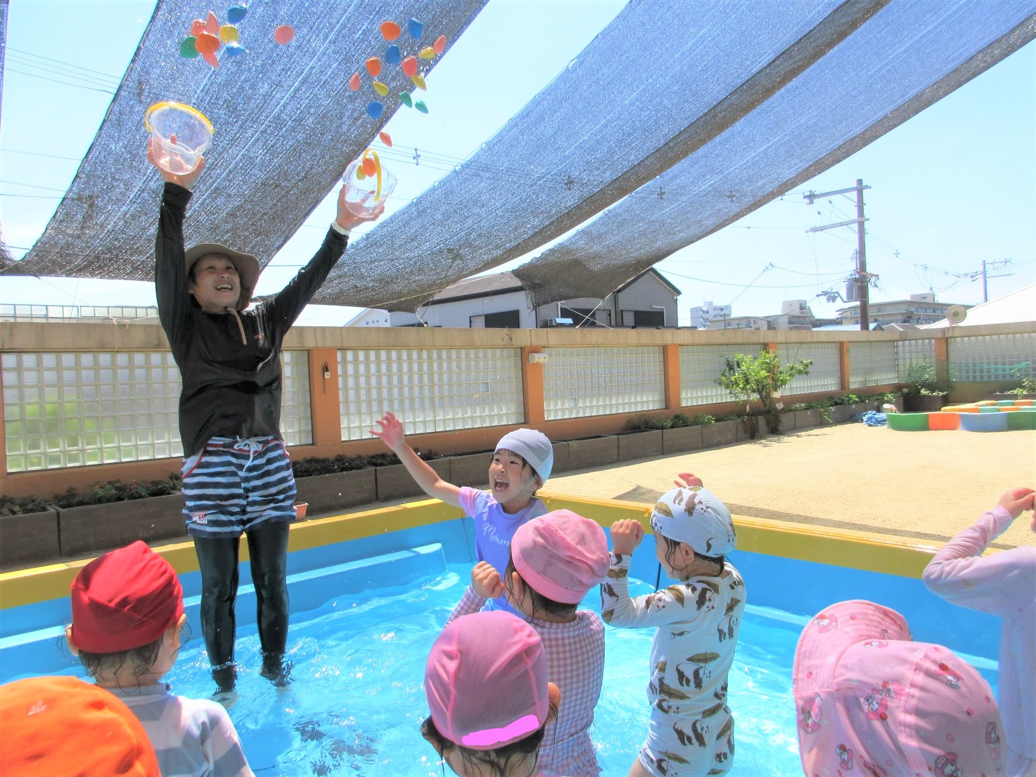 腕や胸にゆっくり水を掛けて、身体を水に慣らせます♪