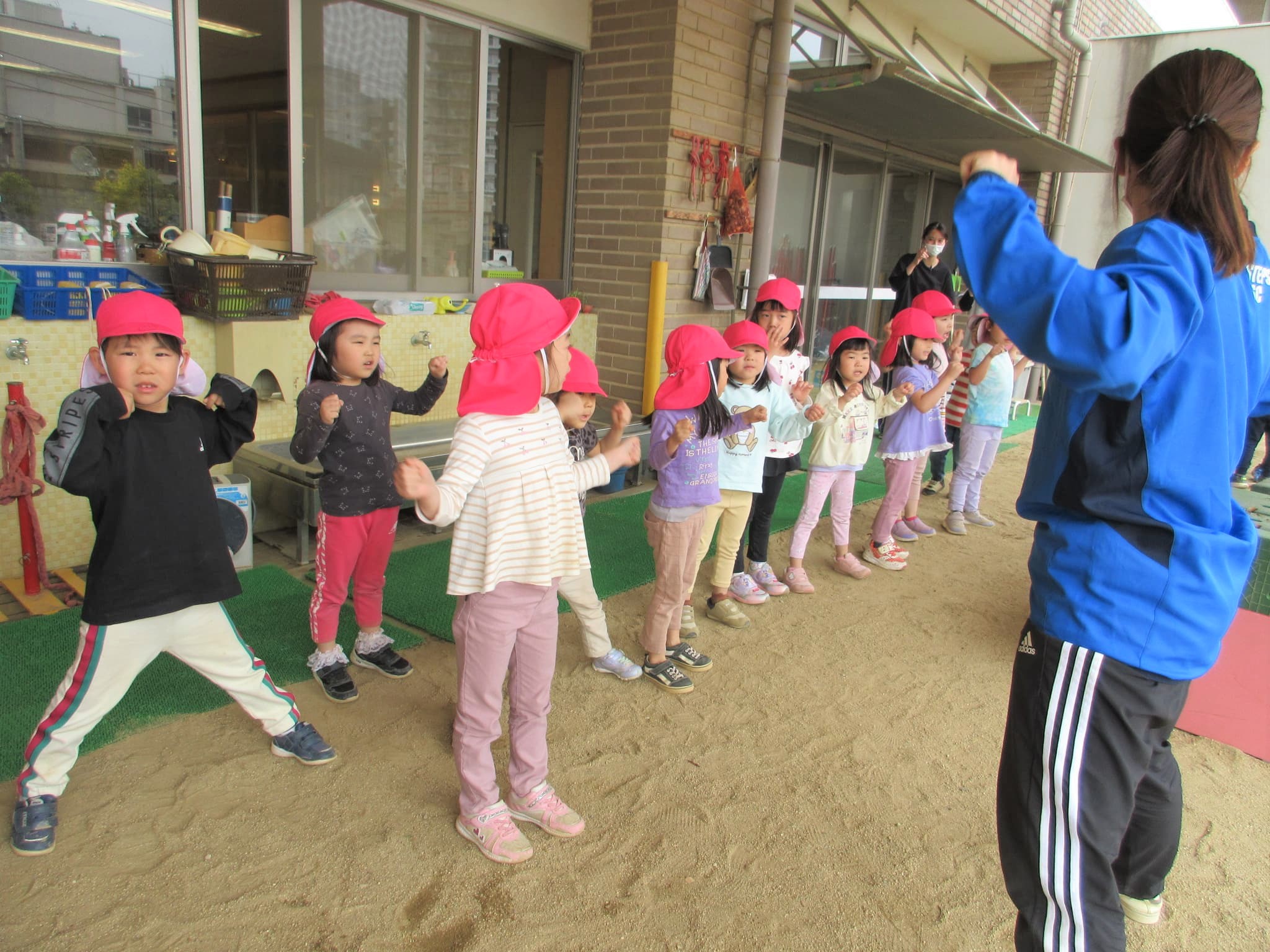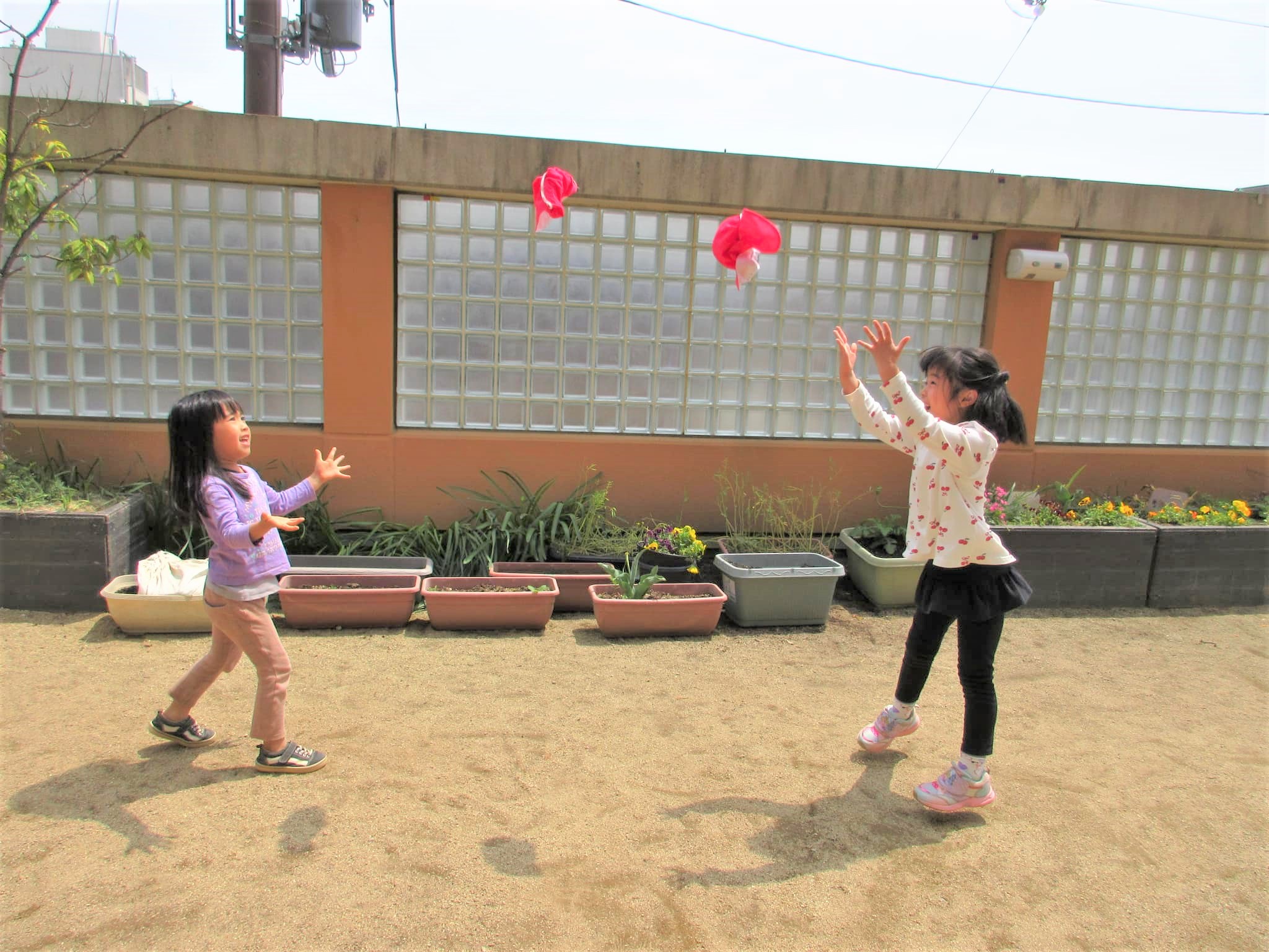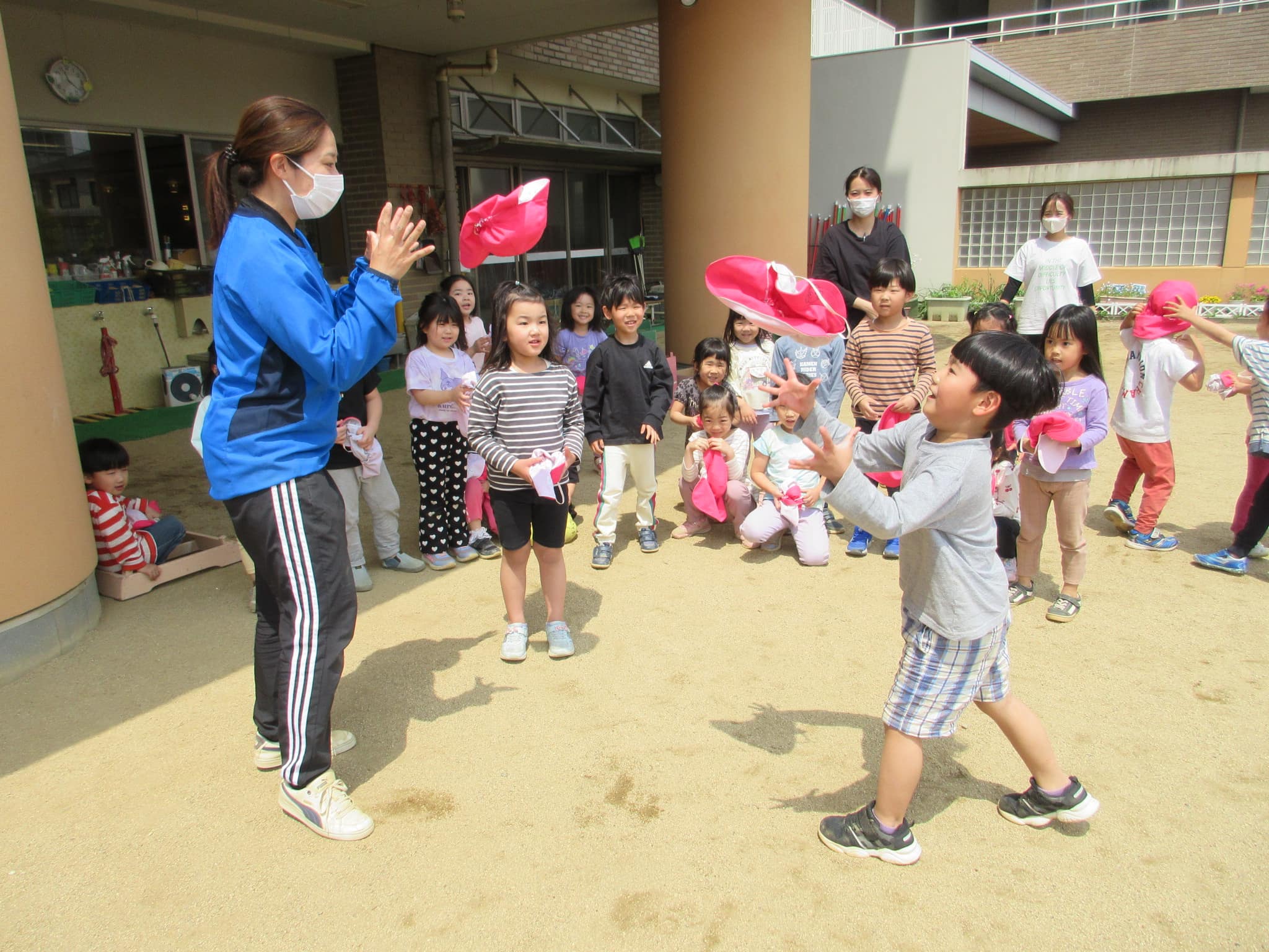帽子を上に投げて、手を叩いたり頭や肩に触れたりしながら、帽子を捕る取り組みです♪