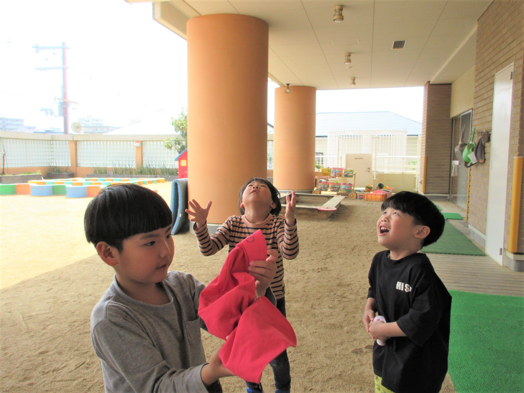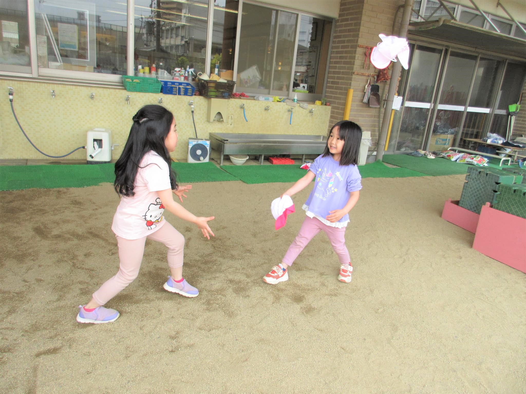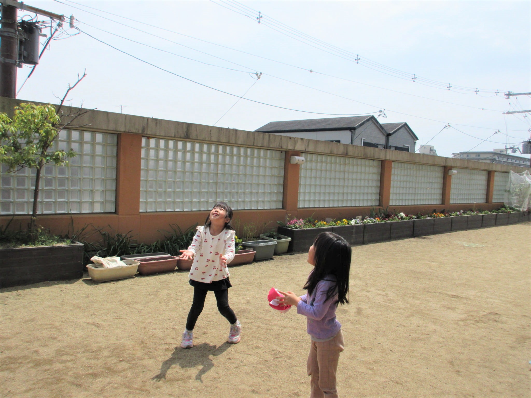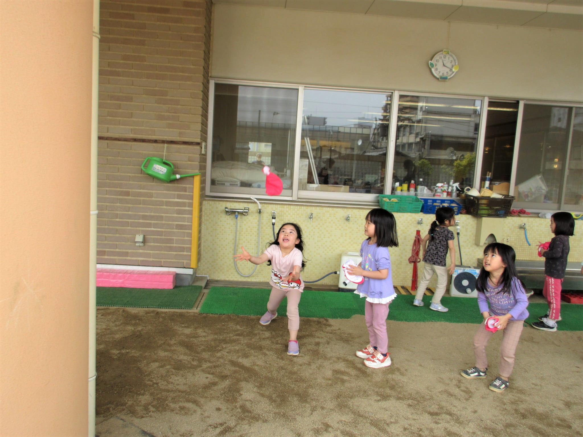 帽子を上に投げて、手を叩いたり頭や肩に触れたりしながら、帽子を捕る取り組みです♪