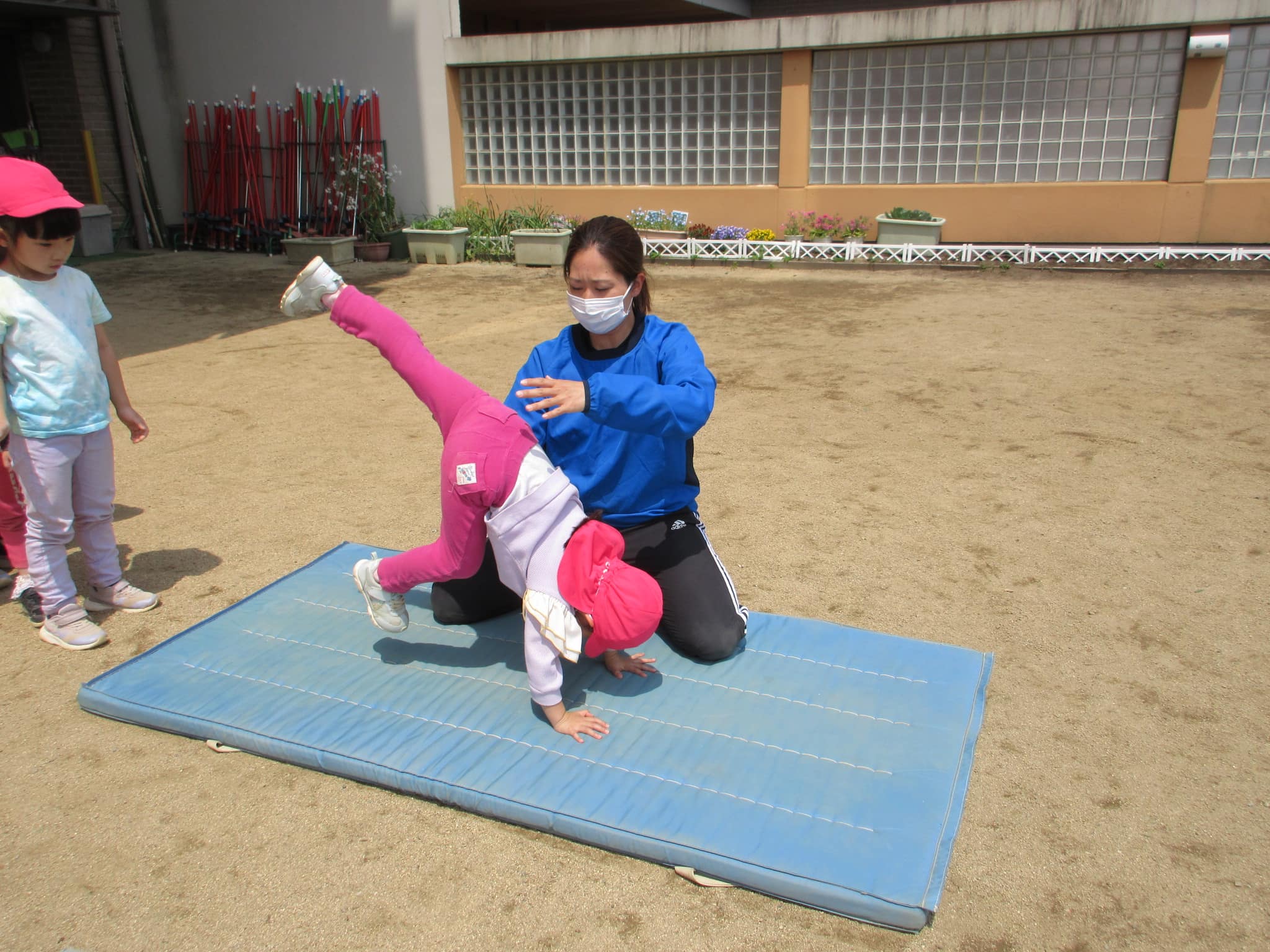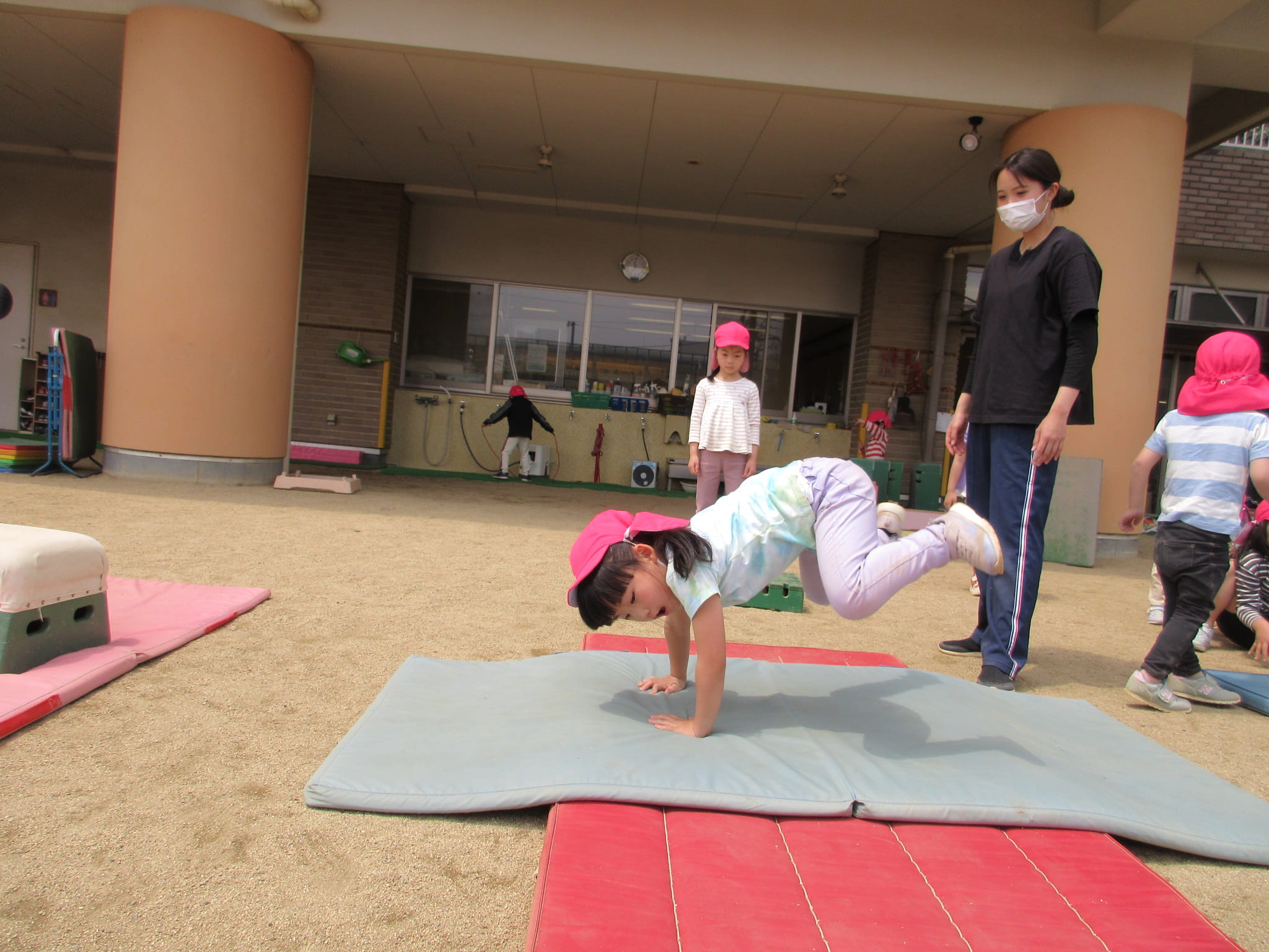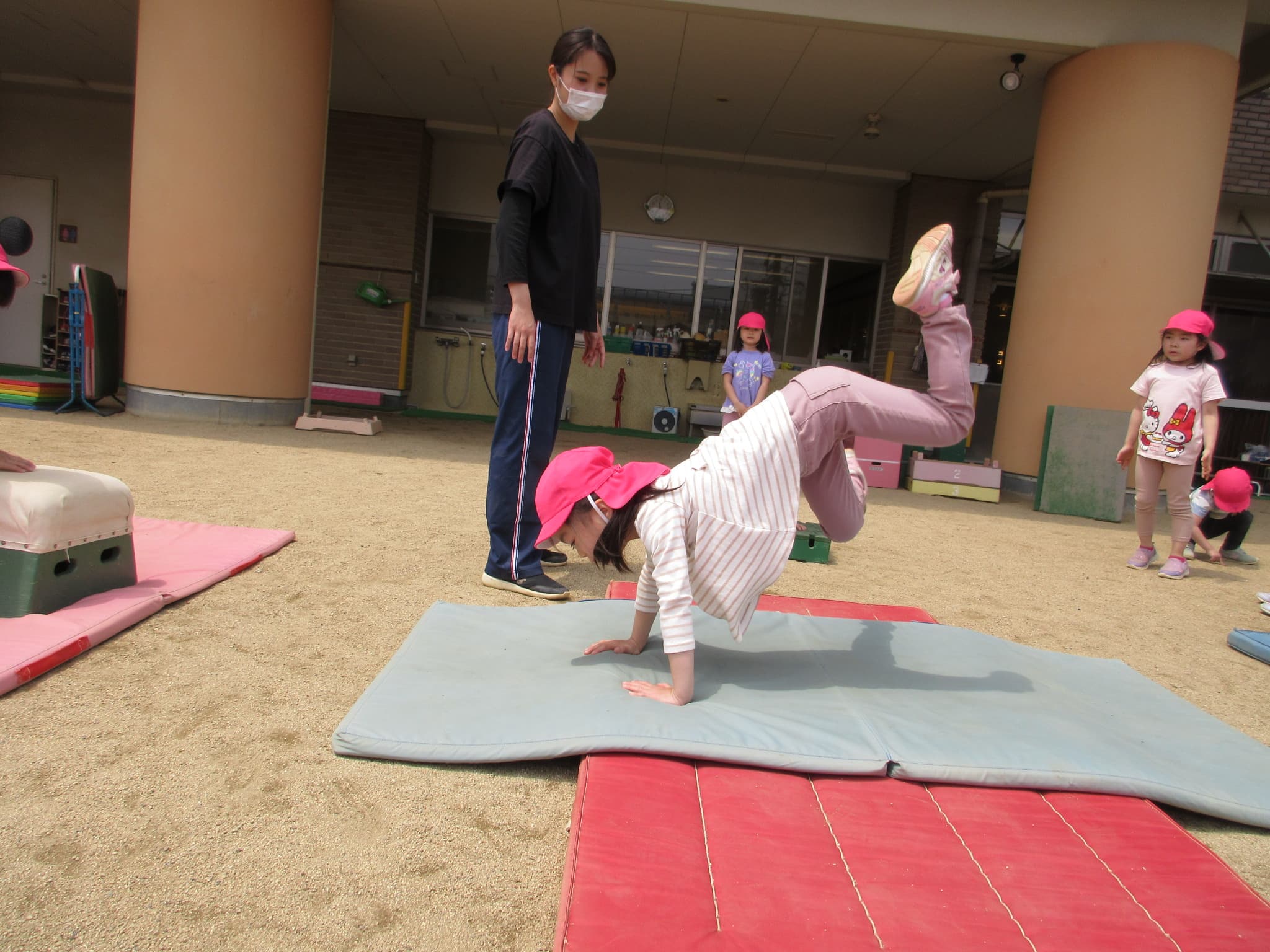 「お尻を上げたら、もっときれいな側転になるよ」と言うと