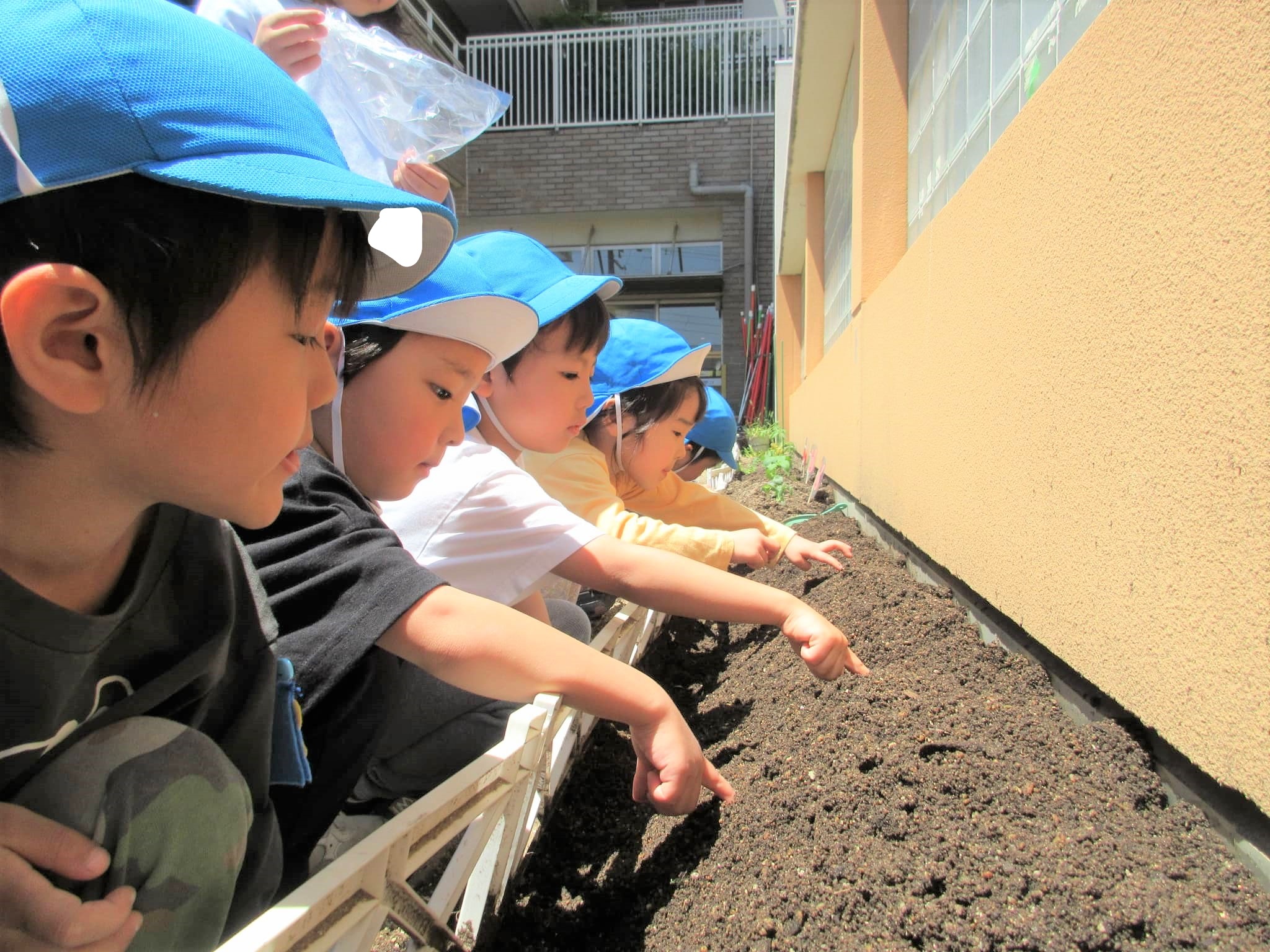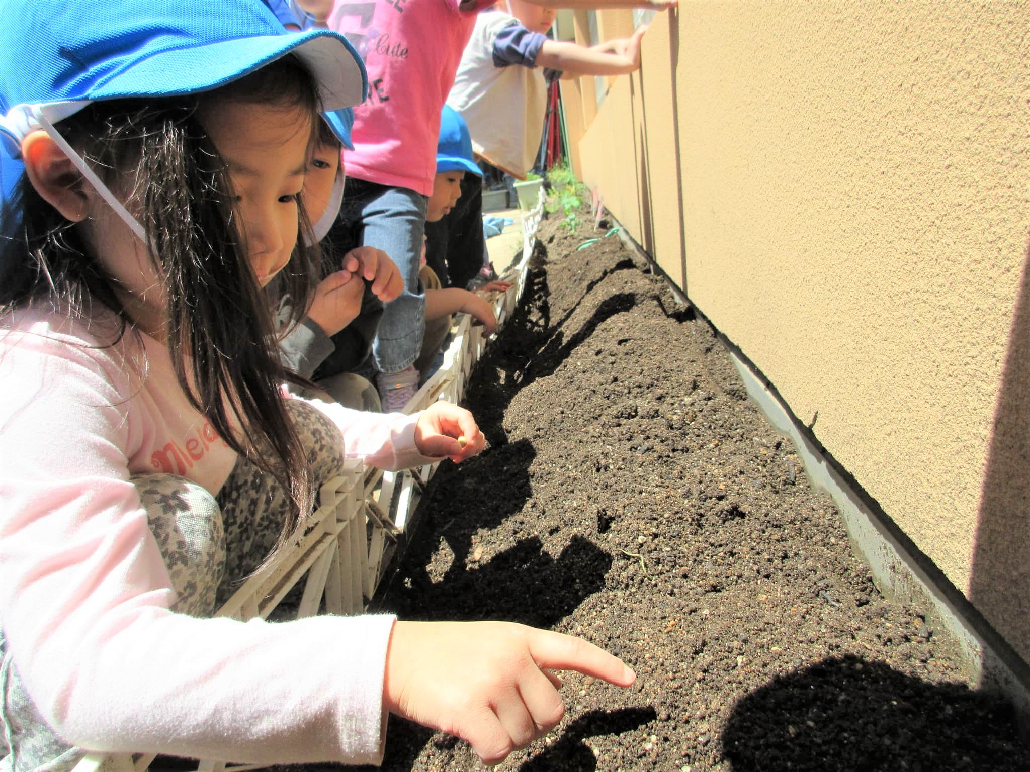 先生から種の蒔き方(指で土に穴を開けて、そこに種を入れて優しく土をかける)を聞いて