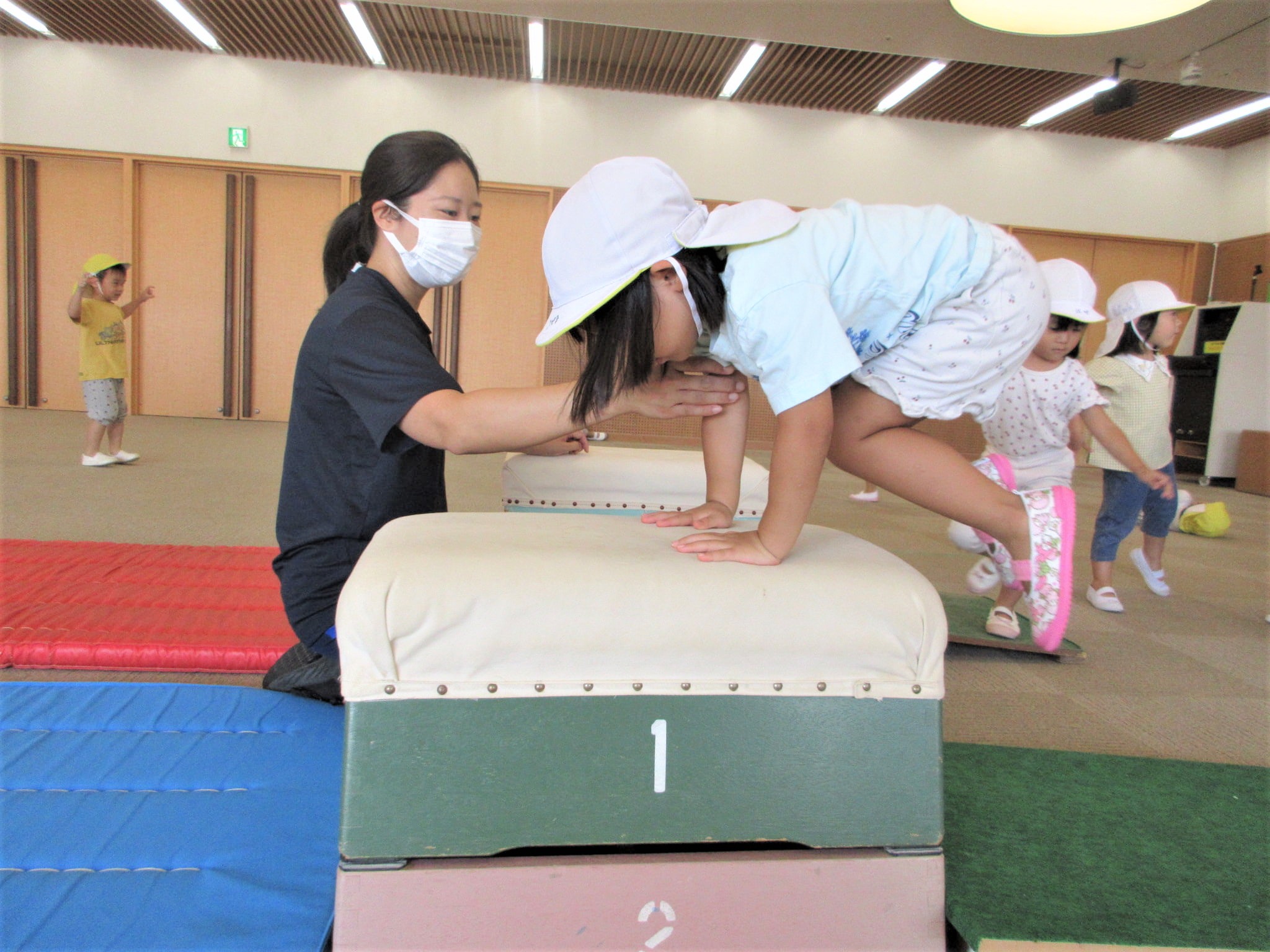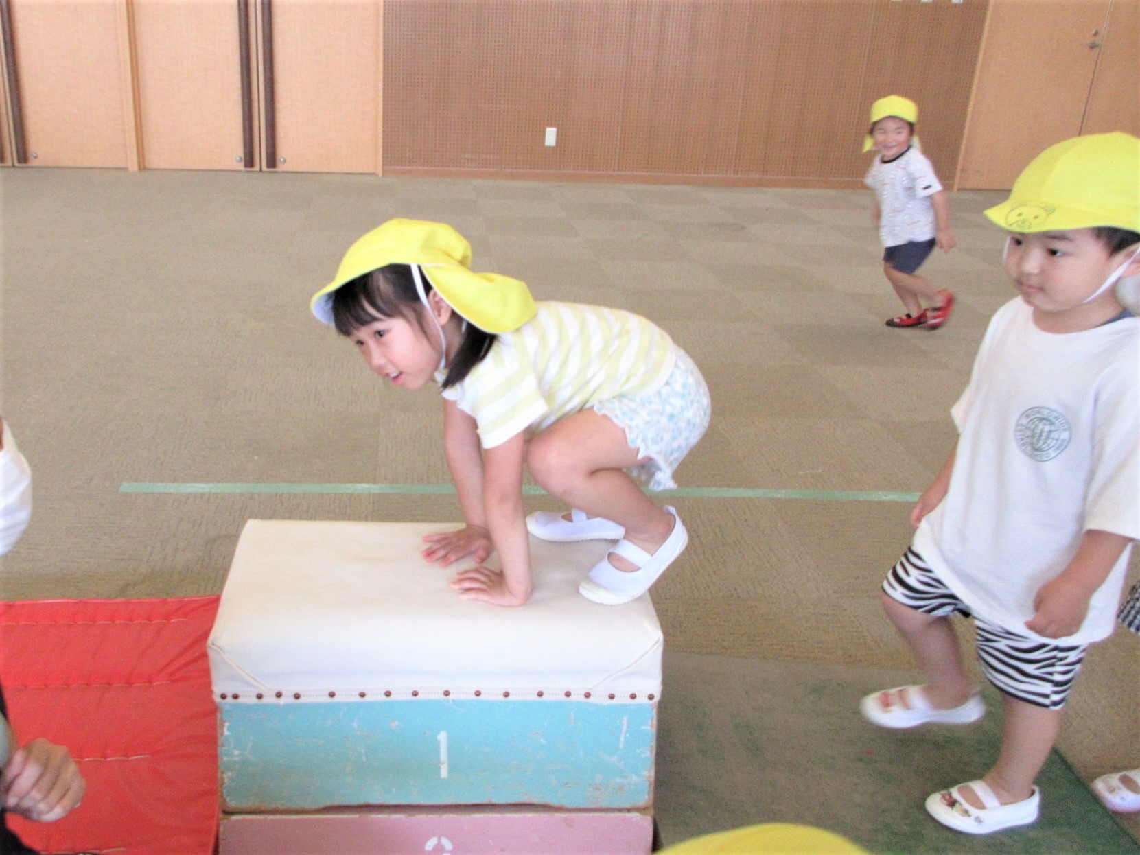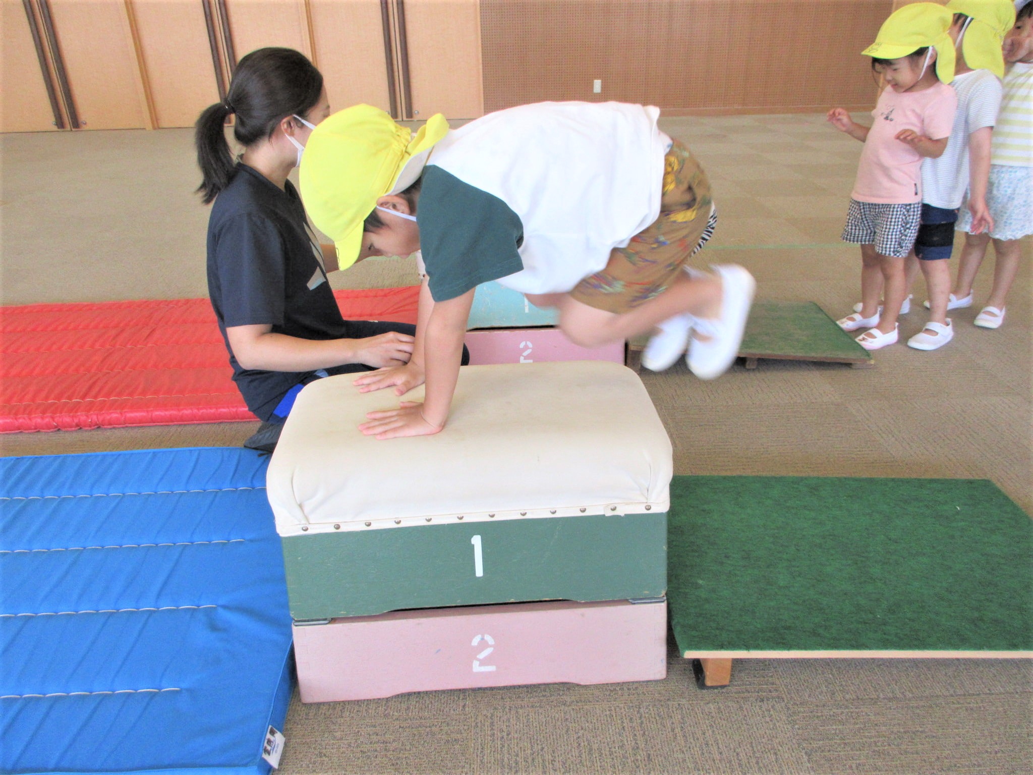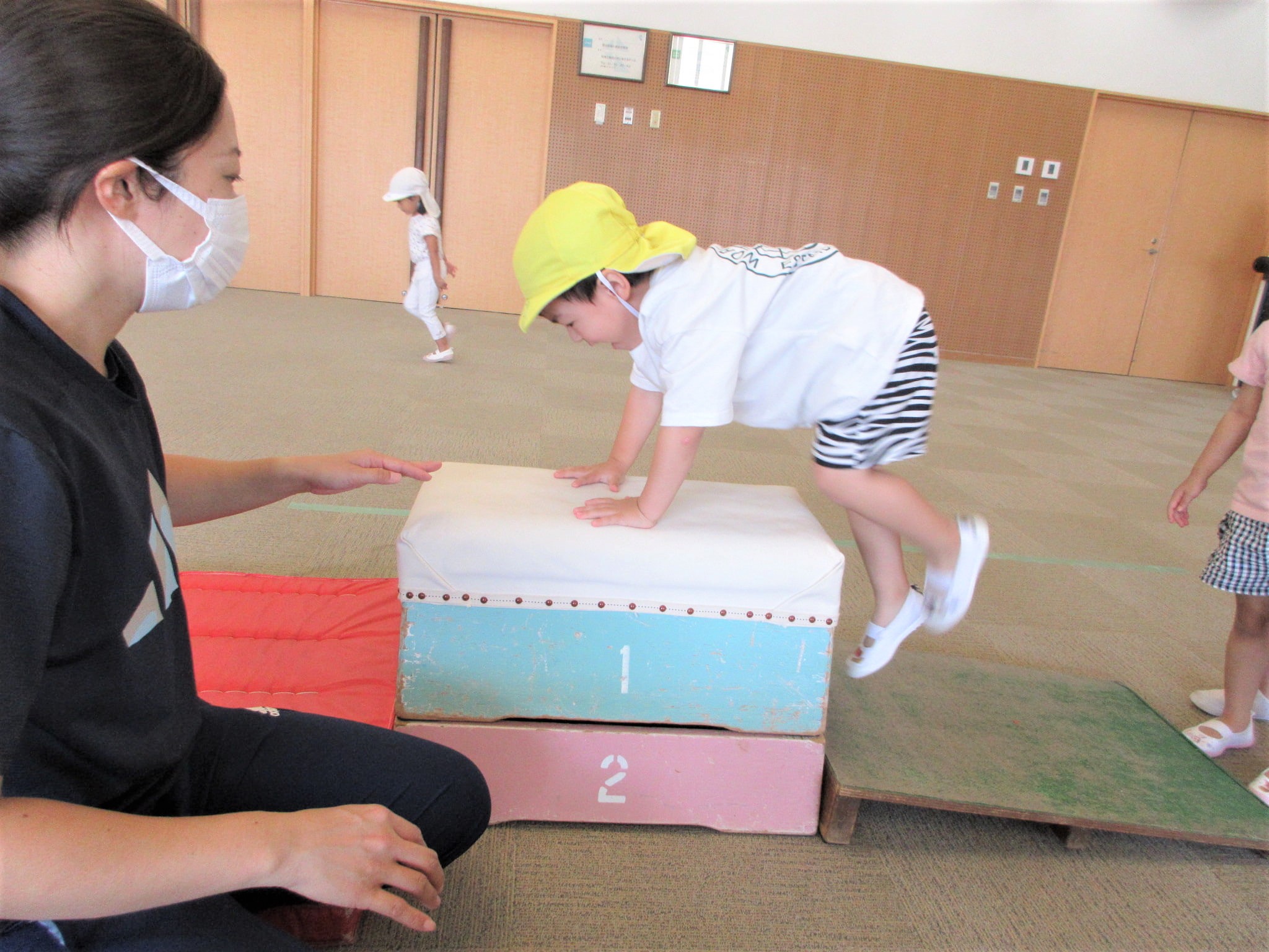 まずは、手に“のり”を着けて、跳び箱から手が離れないように・・・♪
