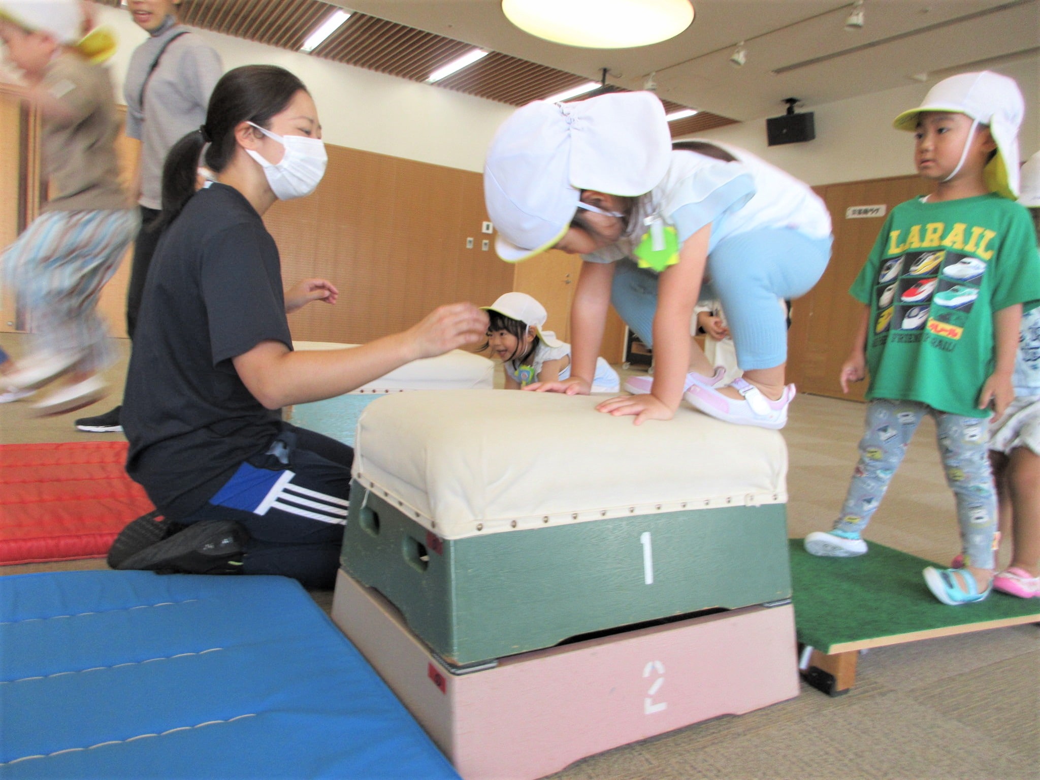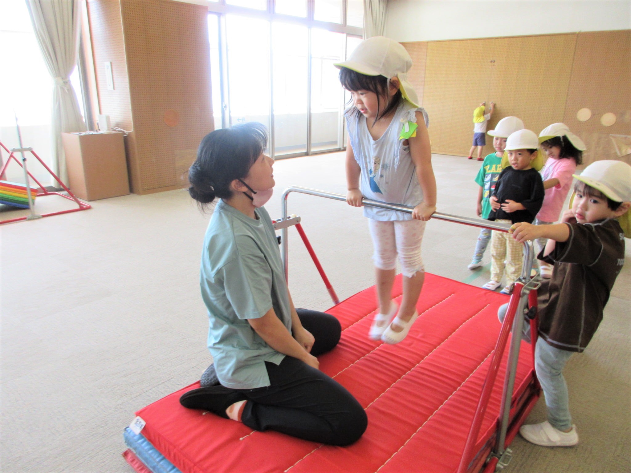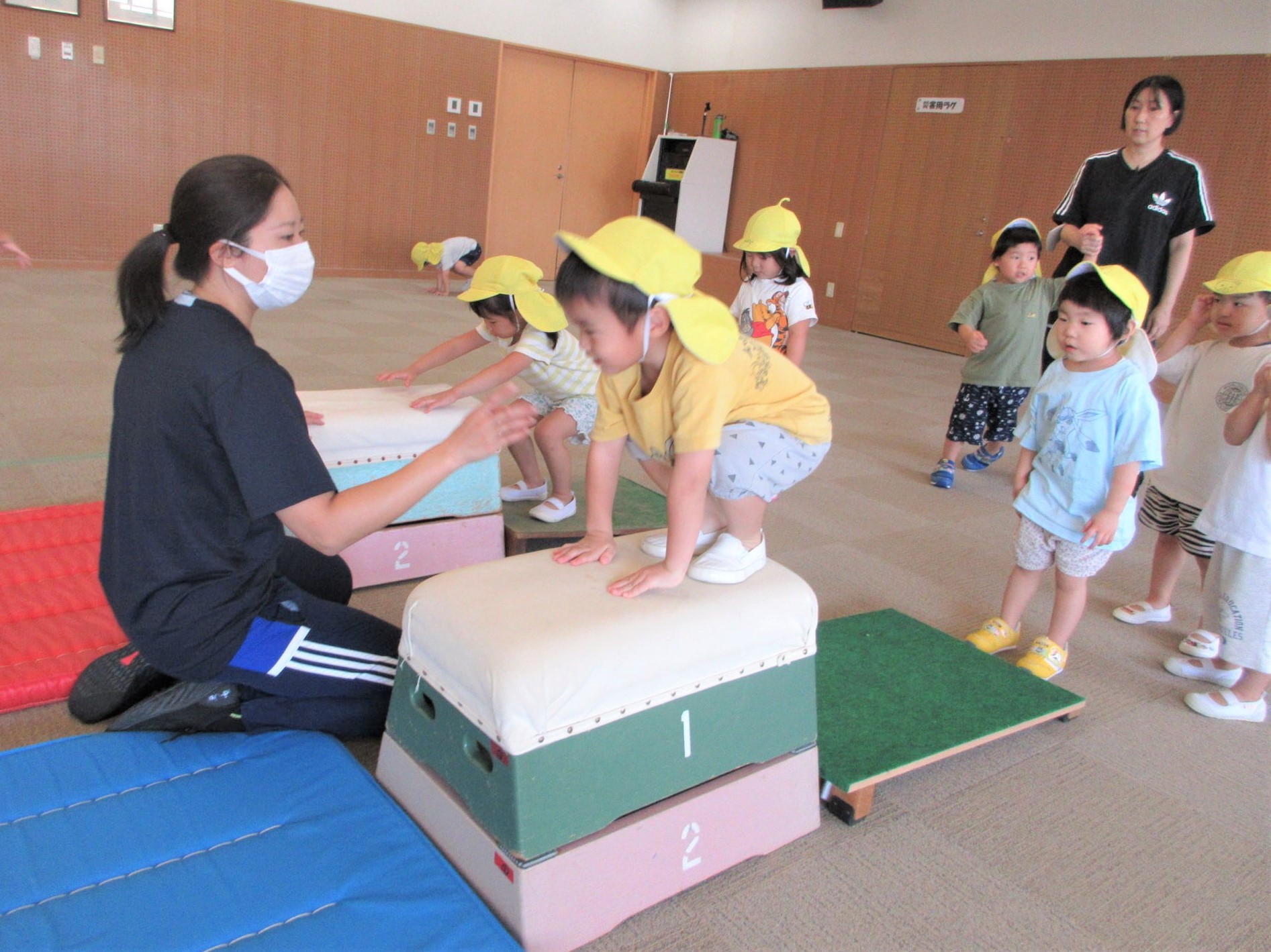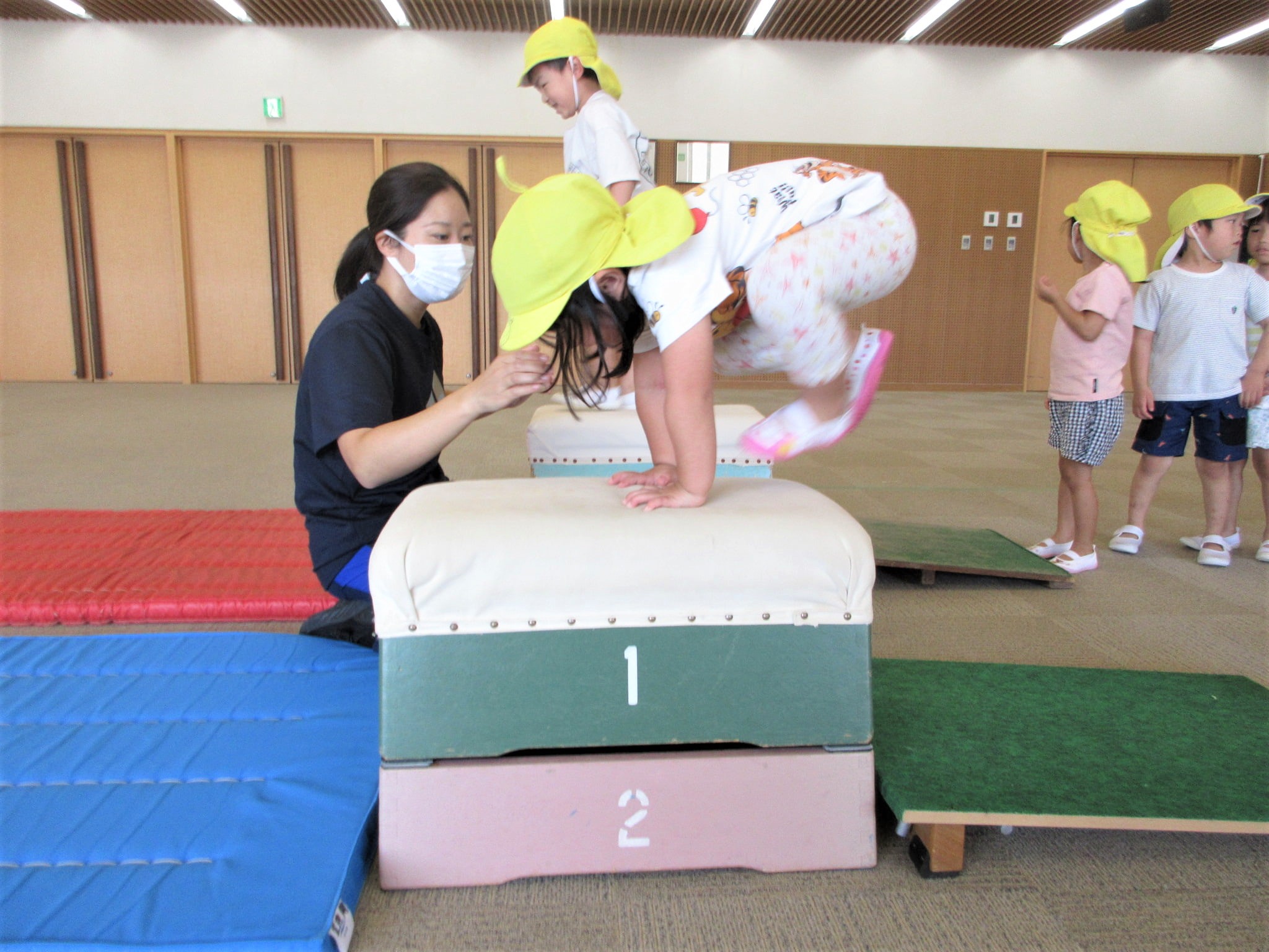 まずは、手に“のり”を着けて、跳び箱から手が離れないように・・・♪